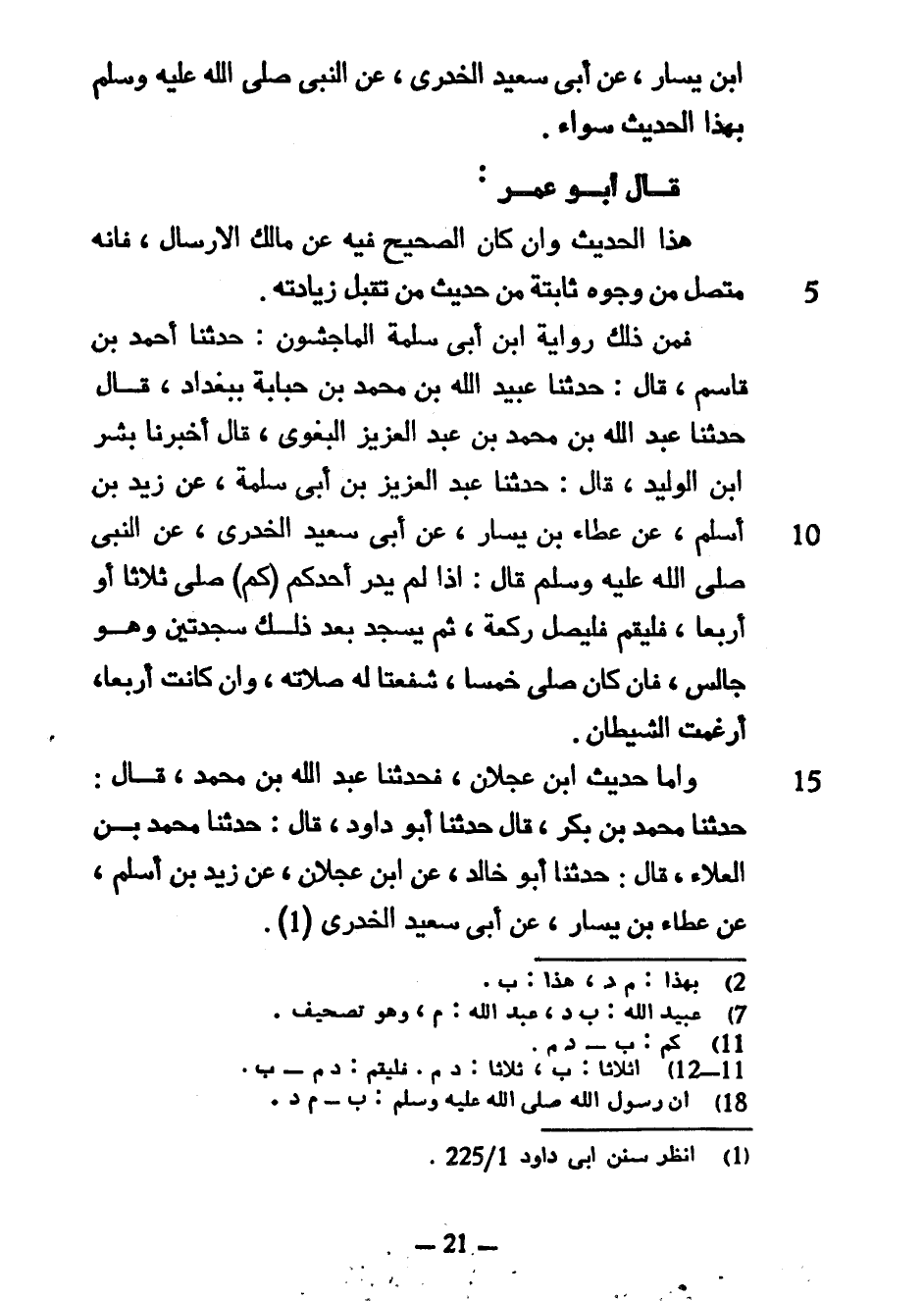 ابن يَسَارٍ عَنْ أَبِي سَعِيدٍ الْخُدْرِيِّ عَنِ النَّبِيِّ صَلَّى اللَّهُ عَلَيْهِ وَسَلَّمَ بِهَذَا الْحَدِيثِ سَوَاءً قَالَ أَبُو عُمَرَ هَذَا الْحَدِيثُ وَإِنْ كَانَ الصَّحِيحُ فِيهِ عَنْ مَالِكٍ الْإِرْسَالَ فَإِنَّهُ مُتَّصِلٌ مِنْ وُجُوهٍ ثَابِتَةٍ مِنْ حَدِيثِ مَنْ تُقْبَلُ زِيَادَتُهُ فَمِنْ ذَلِكَ رِوَايَةُ ابْنِ أَبِي سَلَمَةَ الْمَاجِشُونِ حَدَّثَنَا أَحْمَدُ بْنُ قَاسِمٍ قَالَ حَدَّثَنَا عُبَيْدُ اللَّهِ بْنُ مُحَمَّدِ بْنِ حُبَابَةَ بِبَغْدَادَ قَالَ حَدَّثَنَا عَبْدُ اللَّهِ بْنُ مُحَمَّدِ بْنِ عَبْدِ الْعَزِيزِ الْبَغَوِيُّ قَالَ أَخْبَرَنَا بِشْرُ بْنُ الْوَلِيدِ قَالَ حَدَّثَنَا عَبْدُ الْعَزِيزِ بْنُ أَبِي سَلَمَةَ عَنْ زَيْدِ بْنِ أَسْلَمَ عَنْ عَطَاءِ بْنِ يَسَارٍ عَنْ أَبِي سَعِيدٍ الْخُدْرِيِّ عَنِ النَّبِيِّ صَلَّى الله عليه وسلم قال إذا لَمْ يَدْرِ أَحَدُكُمْ (كَمْ) صَلَّى ثَلَاثًا أَوْ أَرْبَعًا فَلْيَقُمْ فَلْيُصَلِّ رَكْعَةً ثُمَّ يَسْجُدْ بَعْدَ ذَلِكَ سَجْدَتَيْنِ وَهُوَ جَالِسٌ فَإِنْ كَانَ صَلَّى خَمْسًا شَفَعَتَا لَهُ صَلَاتَهُ وَإِنْ كَانَتْ أَرْبَعًا أَرْغَمَتِ الشَّيْطَانَ وَأَمَّا حَدِيثُ ابْنِ عَجْلَانَ فَحَدَّثَنَا عَبْدُ اللَّهِ بْنُ مُحَمَّدٍ قَالَ حَدَّثَنَا مُحَمَّدُ بْنُ بَكْرٍ قَالَ حَدَّثَنَا أَبُو دَاوُدَ قَالَ حَدَّثَنَا مُحَمَّدُ بْنُ الْعَلَاءِ قَالَ حَدَّثَنَا أَبُو خَالِدٍ عَنِ ابْنِ عَجْلَانَ عَنْ زَيْدِ بْنِ أَسْلَمَ عَنْ عَطَاءِ بْنِ يَسَارٍ عَنْ أَبِي سعيد الخدري