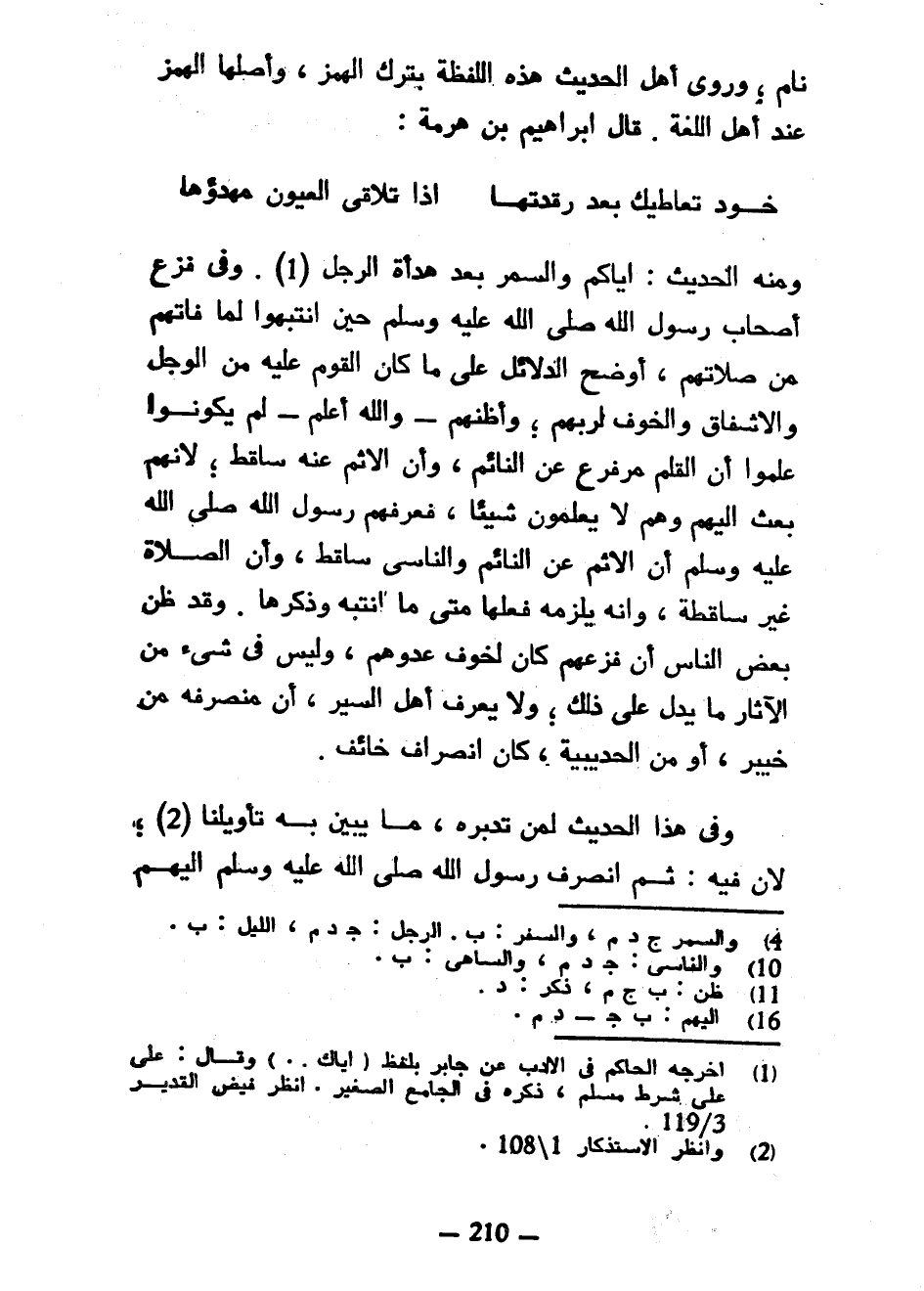 نَامَ وَرَوَى أَهْلُ الْحَدِيثِ هَذِهِ اللَّفْظَةَ بِتَرْكِ الْهَمْزِ وَأَصْلُهَا الْهَمْزُ عِنْدَ أَهْلِ اللُّغَةِ قَالَ إِبْرَاهِيمُ بْنُ هَرِمَةَ ... خَوْدٌ تُعَاطِيكَ بَعْدَ رَقْدَتِهَا ... إِذَا تُلَاقِي الْعُيُونَ مَهْدَؤُهَا ... وَمِنْهُ الْحَدِيثُ إِيَّاكُمْ وَالسَّمَرَ بَعْدَ هَدْأَةِ الرَّجُلِ وَفِي فَزَعِ أَصْحَابِ رسول الله صلى الله عليه وسلم حين انْتَبَهُوا لِمَا فَاتَهُمْ مِنْ صَلَاتِهِمْ أَوْضَحُ الدَّلَائِلِ عَلَى مَا كَانَ الْقَوْمُ عَلَيْهِ مِنَ الْوَجَلِ وَالْإِشْفَاقِ وَالْخَوْفِ لِرَبِّهِمْ وَأَظُنُّهُمْ وَاللَّهُ أَعْلَمُ لَمْ يَكُونُوا عَلِمُوا أَنَّ الْقَلَمَ مَرْفُوعٌ عَنِ النَّائِمِ وَأَنَّ الْإِثْمَ عَنْهُ سَاقِطٌ لِأَنَّهُمْ بُعِثَ إِلَيْهِمْ وَهُمْ لَا يَعْلَمُونَ شَيْئًا فَعَرَّفَهُمْ رَسُولُ اللَّهِ صَلَّى اللَّهُ عَلَيْهِ وَسَلَّمَ أَنَّ الْإِثْمَ عَنِ النَّائِمِ وَالنَّاسِي سَاقِطٌ وَأَنَّ الصَّلَاةَ غَيْرُ سَاقِطَةٍ وَأَنَّهُ يَلْزَمُهُ فِعْلُهَا مَتَى مَا انْتَبَهَ وَذَكَرَهَا وَقَدْ ظَنَّ بَعْضُ النَّاسِ أَنَّ فَزَعَهُمْ كَانَ لِخَوْفِ عَدْوِهِمْ وَلَيْسَ فِي شَيْءٍ مِنَ الْآثَارِ مَا يَدُلُّ عَلَى ذَلِكَ وَلَا يَعْرِفُ أَهْلُ السِّيَرِ أَنَّ مُنْصَرَفَهُ مِنْ خَيْبَرَ أَوْ مِنَ الْحُدَيْبِيَةِ كَانَ انْصِرَافَ خَائِفٍ وَفِي هَذَا الْحَدِيثِ لِمَنْ تَدَبَّرَهُ مَا يَبِينُ بِهِ تَأْوِيلُنَا لِأَنَّ فِيهِ ثُمَّ انْصَرَفَ رَسُولُ اللَّهِ صَلَّى اللَّهُ عَلَيْهِ وَسَلَّمَ إِلَيْهِمْ