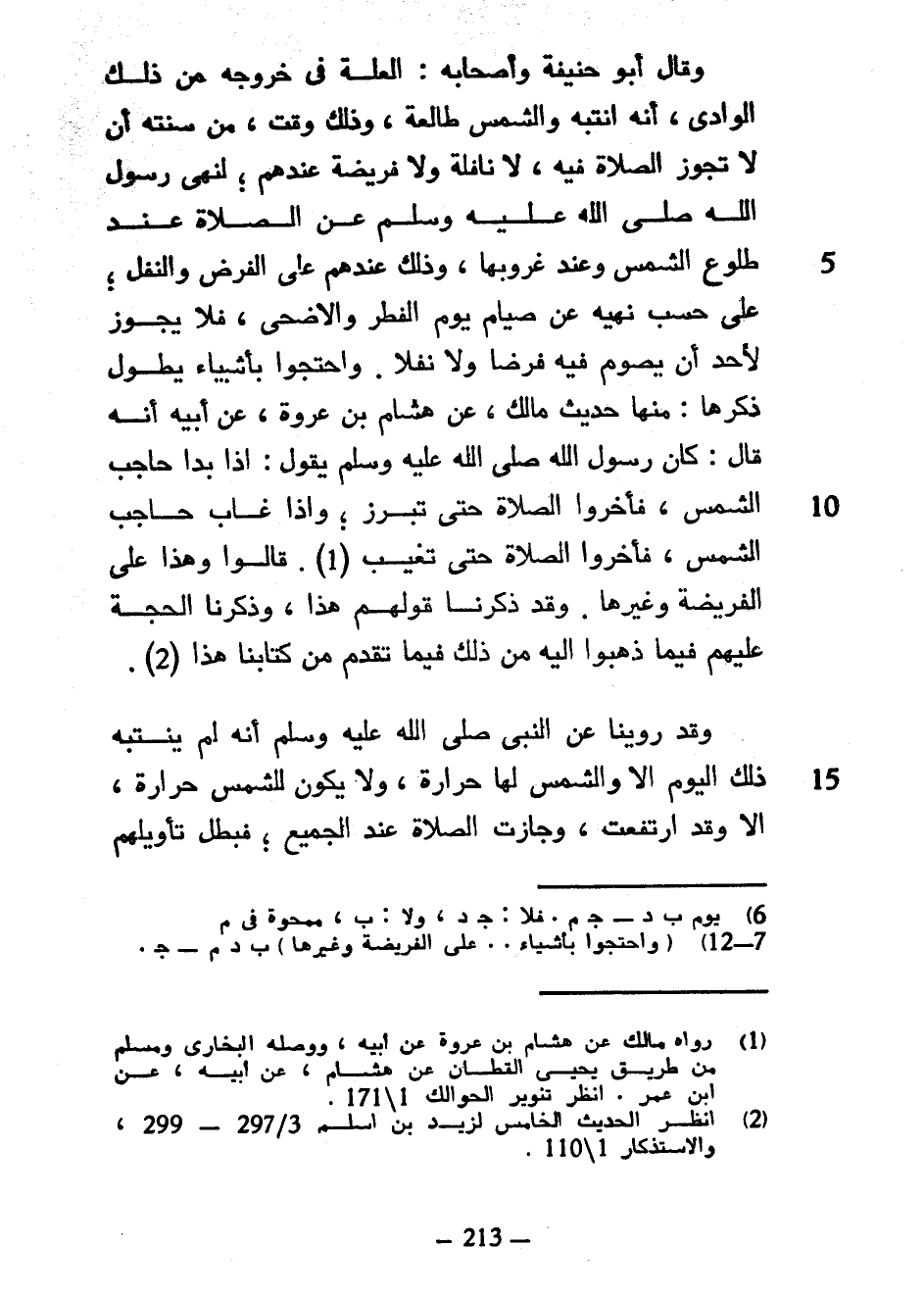 وَقَالَ أَبُو حَنِيفَةَ وَأَصْحَابُهُ الْعِلَّةُ فِي خُرُوجِهِ مِنْ ذَلِكَ الْوَادِي أَنَّهُ انْتَبَهَ وَالشَّمْسُ طَالِعَةٌ وَذَلِكَ وَقْتٌ مِنْ سُنَّتِهِ أَنْ لَا تَجُوزَ الصَّلَاةُ فِيهِ لَا نَافِلَةٌ وَلَا فَرِيضَةٌ عِنْدَهُمْ لِنَهْيِ رَسُولِ اللَّهِ صَلَّى اللَّهُ عَلَيْهِ وَسَلَّمَ عَنِ الصَّلَاةِ عِنْدَ طُلُوعِ الشَّمْسِ وَعِنْدَ غُرُوبِهَا وَذَلِكَ عِنْدَهُمْ عَلَى الْفَرْضِ وَالنَّفْلِ عَلَى حَسَبِ نَهْيِهِ عَنْ صِيَامِ يَوْمِ الْفِطَرِ وَالْأَضْحَى فَلَا يَجُوزُ لِأَحَدٍ أَنْ يَصُومَ فِيهِ فَرْضًا وَلَا نَفْلًا وَاحْتَجُّوا بِأَشْيَاءَ يَطُولُ ذِكْرُهَا مِنْهَا حَدِيثُ مَالِكٍ عَنْ هِشَامِ بْنِ عُرْوَةَ عَنْ أَبِيهِ أَنَّهُ قَالَ كَانَ رَسُولُ اللَّهِ صَلَّى اللَّهُ عَلَيْهِ وَسَلَّمَ يَقُولُ إِذَا بَدَا حَاجِبُ الشَّمْسِ فَأَخِّرُوا الصَّلَاةَ حَتَّى تَبْرُزَ وَإِذَا غَابَ حَاجِبُ الشَّمْسِ فَأَخِّرُوا الصَّلَاةَ حَتَّى تَغِيبَ قَالُوا وَهَذَا عَلَى الْفَرِيضَةِ وَغَيْرِهَا وَقَدْ ذَكَرْنَا قَوْلَهُمْ هَذَا وَذَكَرْنَا الْحُجَّةَ عَلَيْهِمْ فِيمَا ذَهَبُوا إِلَيْهِ مِنْ ذَلِكَ فِيمَا تَقَدَّمَ مِنْ كِتَابِنَا هَذَا وَقَدْ رُوِّينَا عَنِ النَّبِيِّ صَلَّى اللَّهُ عَلَيْهِ وَسَلَّمَ أَنَّهُ لَمْ يَنْتَبِهْ ذَلِكَ الْيَوْمَ إِلَّا وَالشَّمْسُ لَهَا حَرَارَةٌ وَلَا يَكُونُ لِلشَّمْسِ حَرَارَةٌ إِلَّا وَقَدِ ارْتَفَعَتْ وَجَازَتِ الصَّلَاةُ عِنْدَ الْجَمِيعِ فَبَطَلَ تأويلهم