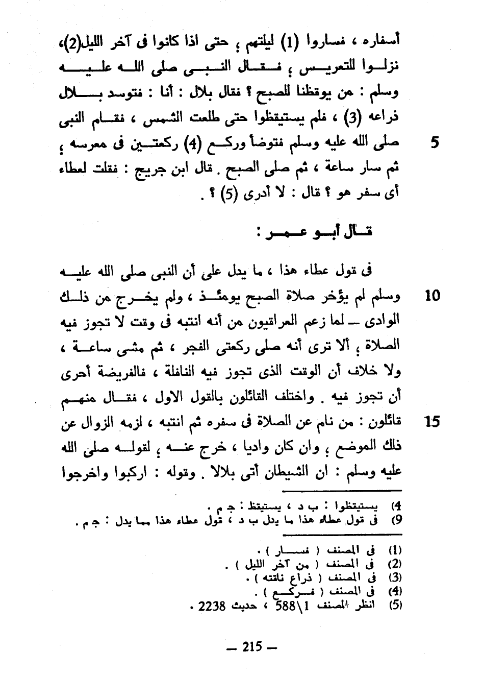 أَسْفَارِهِ فَسَارُوا لَيْلَتَهُمْ حَتَّى إِذَا كَانُوا فِي آخِرِ اللَّيْلِ نَزَلُوا لِلتَّعْرِيسِ فَقَالَ النَّبِيُّ صَلَّى اللَّهُ عَلَيْهِ وَسَلَّمَ مَنْ يُوقِظُنَا لِلصُّبْحِ فَقَالَ بِلَالٌ أَنَا فَتَوَسَّدَ بِلَالٌ ذِرَاعَهُ فَلَمْ يَسْتَيْقِظُوا حَتَّى طَلَعَتِ الشَّمْسُ فَقَامَ النَّبِيُّ صَلَّى اللَّهُ عَلَيْهِ وَسَلَّمَ فَتَوَضَّأَ وَرَكَعَ رَكْعَتَيْنِ فِي مُعَرَّسِهِ ثُمَّ سَارَ سَاعَةً ثُمَّ صَلَّى الصُّبْحَ قَالَ ابْنُ جُرَيْجٍ فَقُلْتُ لِعَطَاءٍ أَيُّ سَفَرٍ هُوَ قَالَ لَا أَدْرِي قَالَ أَبُو عُمَرَ فِي قَوْلِ عَطَاءٍ هَذَا مَا يَدُلُّ عَلِيٍّ أَنَّ النَّبِيَّ صَلَّى اللَّهُ عَلَيْهِ وَسَلَّمَ لَمْ يُؤَخِّرْ صَلَاةَ الصُّبْحِ يَوْمَئِذٍ وَلَمْ يَخْرُجْ مِنْ ذَلِكَ الْوَادِي لِمَا زَعَمَ الْعِرَاقِيُّونَ مِنْ أَنَّهُ انْتَبَهَ فِي وَقْتٍ لَا تَجُوزُ فِيهِ الصَّلَاةُ أَلَا تَرَى أَنَّهُ صَلَّى رَكْعَتِي الْفَجْرِ ثُمَّ مَشَى سَاعَةً وَلَا خِلَافَ أَنَّ الْوَقْتَ الَّذِي تَجُوزُ فِيهِ النَّافِلَةُ فَالْفَرِيضَةُ أَحْرَى أَنْ تَجُوزَ فِيهِ وَاخْتَلَفَ الْقَائِلُونَ بِالْقَوْلِ الْأَوَّلِ فَقَالَ مِنْهُمْ قَائِلُونَ مَنْ نَامَ عَنِ الصَّلَاةِ فِي سَفَرِهِ ثُمَّ انْتَبَهَ لَزِمَهُ الزَّوَالُ عَنْ ذَلِكَ الْمَوْضِعِ وَإِنْ كَانَ وَادِيًا خَرَجَ عَنْهُ لِقَوْلِهِ صَلَّى اللَّهُ عَلَيْهِ وَسَلَّمَ إِنَّ الشَّيْطَانَ أَتَى بِلَالًا وَقَوْلِهِ اركبوا واخرجوا