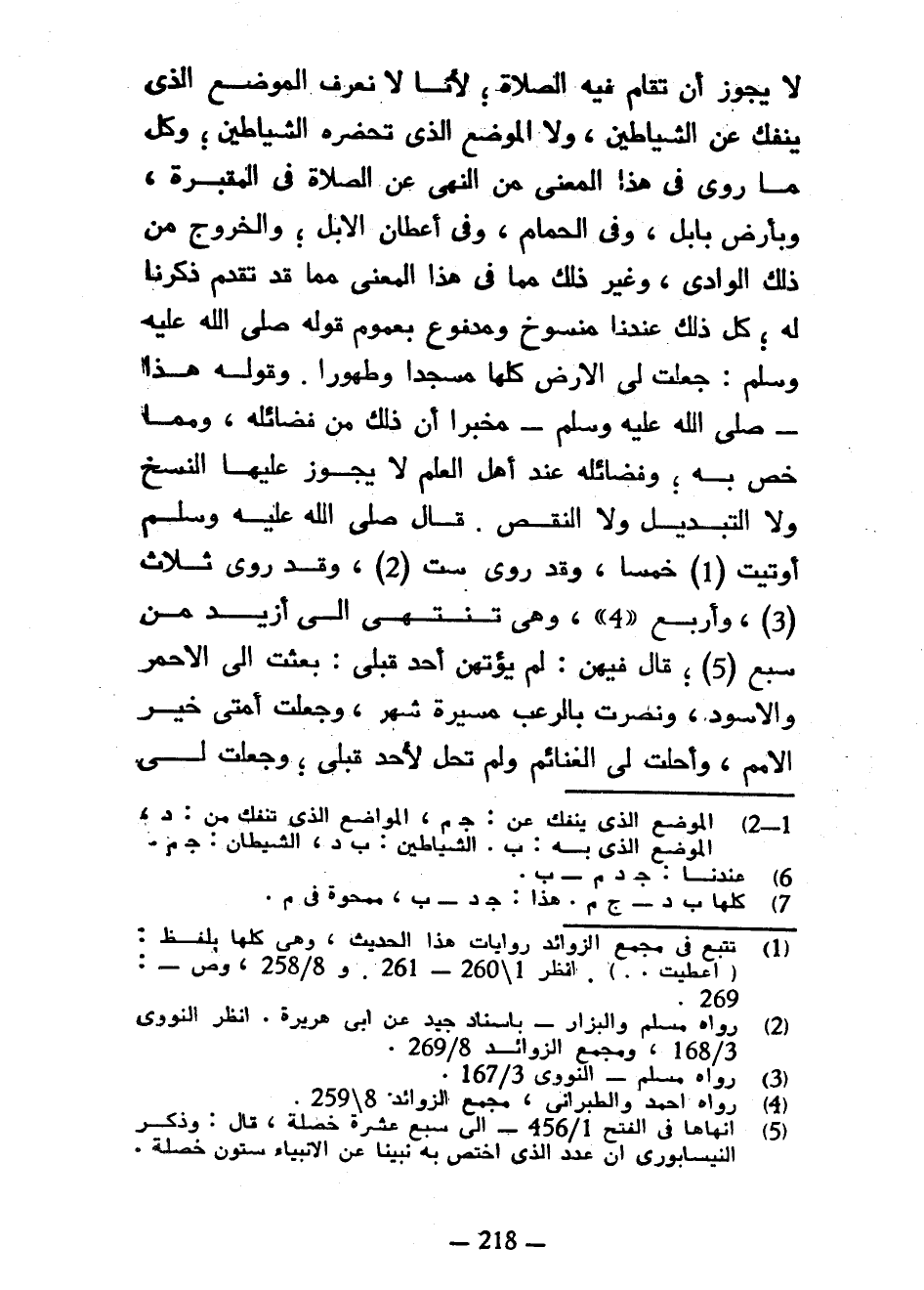 لَا يَجُوزُ أَنْ تُقَامَ فِيهِ الصَّلَاةُ لِأَنَّا لَا نَعْرِفُ الْمَوْضِعَ الَّذِي يَنْفَكُّ عَنِ الشَّيَاطِينِ وَلَا الْمَوْضِعِ الَّذِي تَحْضُرُهُ الشَّيَاطِينُ وَكُلُّ مَا رُوِيَ فِي هَذَا الْمَعْنَى مِنَ النَّهْيِ عَنِ الصَّلَاةِ فِي الْمَقْبَرَةِ وَبِأَرْضِ بَابِلَ وَفِي الْحَمَّامِ وَفِي أَعْطَانِ الْإِبِلِ وَالْخُرُوجِ مِنْ ذَلِكَ الْوَادِي وَغَيْرِ ذَلِكَ مِمَّا فِي هَذَا الْمَعْنَى مِمَّا قَدْ تَقَدَّمَ ذِكْرُنَا لَهُ كُلُّ ذَلِكَ عِنْدَنَا مَنْسُوخٌ وَمَدْفُوعٌ بِعُمُومِ قَوْلُهُ صَلَّى اللَّهُ عَلَيْهِ وَسَلَّمَ جُعِلَتْ لِيَ الْأَرْضُ كُلُّهَا مَسْجِدًا وَطَهُورًا وَقَوْلُهُ هَذَا صَلَّى اللَّهُ عَلَيْهِ وَسَلَّمَ مُخْبِرًا أَنَّ ذَلِكَ مِنْ فَضَائِلِهِ وَمِمَّا خُصَّ بِهِ وَفَضَائِلُهُ عِنْدَ أَهْلِ الْعِلْمِ لَا يَجُوزُ عَلَيْهَا النَّسْخُ وَلَا التَّبْدِيلُ وَلَا النَّقْصُ قَالَ صَلَّى اللَّهُ عَلَيْهِ وَسَلَّمَ أُوتِيَتُ خَمْسًا وَقَدْ رُوِيَ سِتٌّ وَقَدْ رُوِيَ ثَلَاثٌ وَأَرْبَعٌ وَهِيَ تَنْتَهِي إِلَى أَزْيَدَ مِنْ سَبْعٍ قَالَ فِيهِنَّ لَمْ يُؤْتَهُنَّ أَحَدٌ قَبْلِي بُعِثْتُ إِلَى الْأَحْمَرِ وَالْأَسْوَدِ وَنُصِرْتُ بِالرُّعْبِ مَسِيرَةَ شَهْرٍ وَجُعِلَتْ أُمَّتِي خَيْرَ الْأُمَمِ وَأُحِلَّتْ لِيَ الْغَنَائِمُ وَلَمْ تَحُلَّ لِأَحَدٍ قَبْلِي وَجُعِلَتْ لِيَ