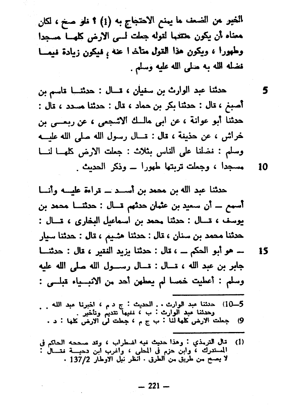 الْخَبَرِ مِنَ الضَّعْفِ مَا يَمْنَعُ الِاحْتِجَاجَ بِهِ فَلَوْ صَحَّ لَكَانَ مَعْنَاهُ أَنْ يَكُونَ مُتَقَدِّمًا لِقَوْلِهِ جُعِلَتْ لِيَ الْأَرْضُ كُلُّهَا مَسْجِدًا وَطَهُورًا وَيَكُونُ هَذَا الْقَوْلُ مُتَأَخِّرًا عَنْهُ فَيَكُونُ زِيَادَةً فِيمَا فَضَّلَهُ اللَّهُ بِهِ صَلَّى اللَّهُ عَلَيْهِ وَسَلَّمَ حَدَّثَنَا عَبْدُ الْوَارِثِ بْنُ سُفْيَانَ قَالَ حَدَّثَنَا قَاسِمُ بْنُ أَصْبَغَ قَالَ حَدَّثَنَا بَكْرُ بْنُ حَمَّادٍ قَالَ حَدَّثَنَا مُسَدَّدٌ قَالَ حَدَّثَنَا أَبُو عَوَانَةَ عَنْ أَبِي مَالِكٍ الْأَشْجَعِيِّ عَنْ رِبْعِيِّ بْنِ خِرَاشٍ عَنْ حُذَيْفَةَ قَالَ قَالَ رَسُولُ اللَّهِ صَلَّى اللَّهُ عَلَيْهِ وَسَلَّمَ فُضِّلْنَا عَلَى النَّاسِ بِثَلَاثٍ جُعِلَتِ الْأَرْضُ كُلُّهَا لَنَا مَسْجِدًا وَجُعِلَتْ تُرْبَتُهَا طَهُورًا وَذَكَرَ الْحَدِيثَ حَدَّثَنَا عَبْدُ اللَّهِ بْنُ مُحَمَّدِ بْنِ أَسَدٍ قِرَاءَةً عَلَيْهِ وَأَنَا أَسْمَعُ أَنَّ سَعِيدَ بْنَ عُثْمَانَ حَدَّثَهُمْ قَالَ حَدَّثَنَا مُحَمَّدُ بْنُ يُوسُفَ قَالَ حَدَّثَنَا مُحَمَّدُ بْنُ إِسْمَاعِيلَ الْبُخَارِيُّ قَالَ حَدَّثَنَا مُحَمَّدُ بْنُ سِنَانٍ قَالَ حَدَّثَنَا هُشَيْمٌ قَالَ حَدَّثَنَا سَيَّارُ هُوَ أَبُو الْحَكَمِ قَالَ حَدَّثَنَا يَزِيدُ الْفَقِيرُ قَالَ حَدَّثَنَا جَابِرِ بْنِ عَبْدِ اللَّهِ قَالَ قَالَ رَسُولُ اللَّهِ صَلَّى اللَّهُ عَلَيْهِ وَسَلَّمَ أُعْطِيتُ خَمْسًا لَمْ يُعْطَهُنَّ أَحَدٌ مِنَ الْأَنْبِيَاءِ قَبْلِي