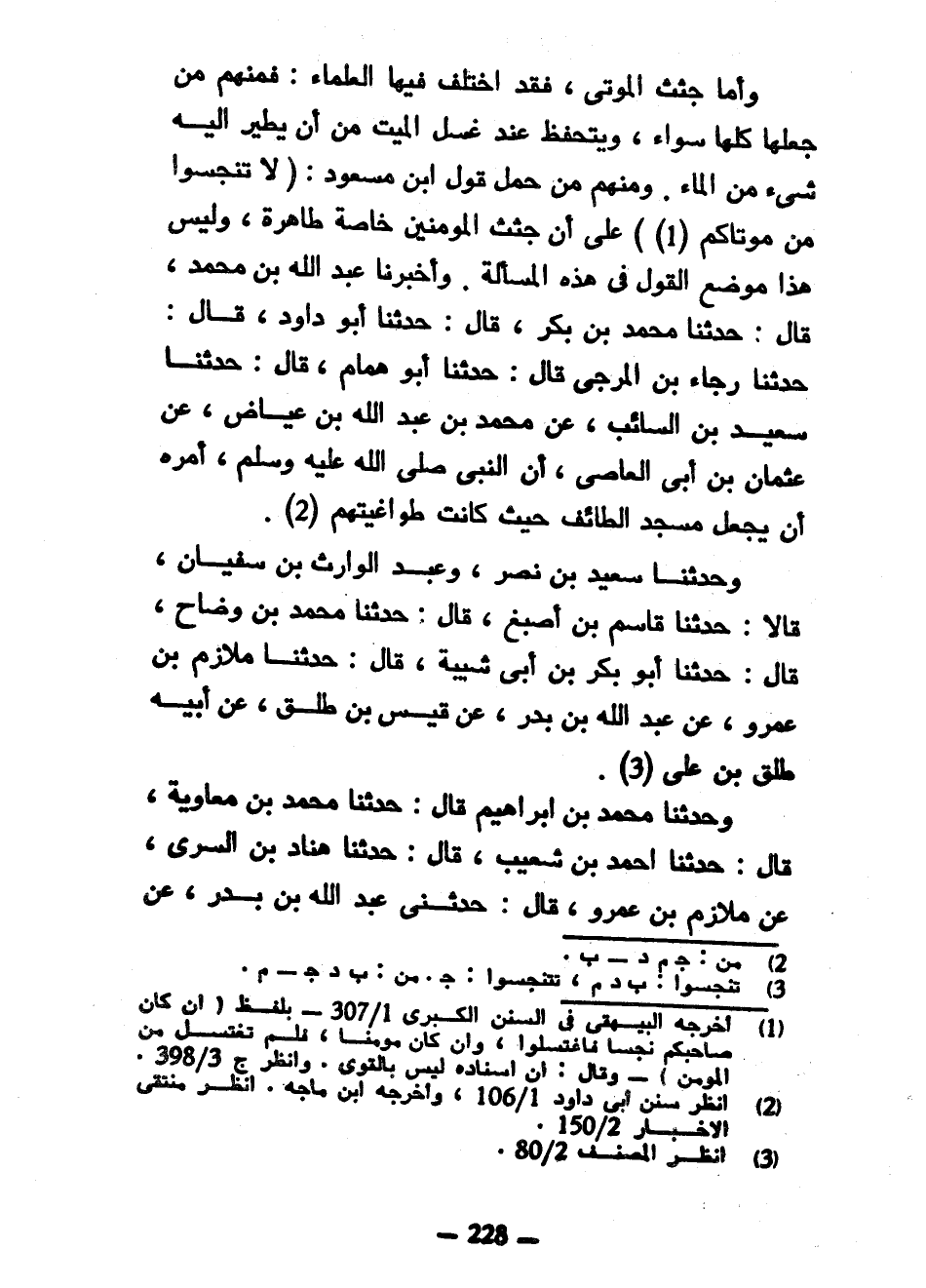 وَأَمَّا جُثَثُ الْمَوْتَى فَقَدِ اخْتَلَفَ فِيهَا الْعُلَمَاءُ فَمِنْهُمْ مَنْ جَعَلَهَا كُلَّهَا سَوَاءٌ وَيَتَحَفَّظُ عِنْدَ غُسْلِ الْمَيِّتِ مِنْ أَنْ يَطِيرَ إِلَيْهِ شَيْءٌ مِنَ الْمَاءِ وَمِنْهُمْ مَنْ حَمَلَ قَوْلَ ابْنِ مَسْعُودٍ (لَا تَنْجَسُوا مِنْ مَوْتَاكُمْ (1)) عَلَى أَنَّ جُثَثَ الْمُؤْمِنِينَ خَاصَّةً طَاهِرَةٌ وَلَيْسَ هَذَا مَوْضِعَ الْقَوْلِ فِي هَذِهِ الْمَسْأَلَةِ وَأَخْبَرَنَا عَبْدُ اللَّهِ بْنُ مُحَمَّدٍ قَالَ حَدَّثَنَا مُحَمَّدُ بْنُ بَكْرٍ قَالَ حَدَّثَنَا أَبُو دَاوُدَ قَالَ حَدَّثَنَا رَجَاءُ بْنُ الْمُرَجَّى قَالَ حَدَّثَنَا أَبُو هَمَّامٍ قَالَ حَدَّثَنَا سَعِيدُ بْنُ السَّائِبِ عَنْ مُحَمَّدِ بْنِ عَبْدِ اللَّهِ بْنِ عِيَاضٍ عَنْ عُثْمَانَ بْنِ بْنِ أَبِي الْعَاصِي أَنَّ النَّبِيَّ صَلَّى اللَّهُ عَلَيْهِ وَسَلَّمَ أَمَرَهُ أَنْ يَجْعَلَ مَسْجِدَ الطَّائِفِ حَيْثُ كَانَتْ طَوَاغِيتُهُمْ وَحَدَّثَنَا سَعِيدُ بْنُ نَصْرٍ وَعَبْدُ الْوَارِثِ بْنُ سُفْيَانَ قَالَا حَدَّثَنَا قَاسِمُ بْنُ أَصْبَغَ قَالَ حَدَّثَنَا مُحَمَّدُ بْنُ وَضَّاحٍ قَالَ حَدَّثَنَا أَبُو بَكْرِ بْنُ أَبِي شَيْبَةَ قَالَ حَدَّثَنَا مُلَازِمُ بْنُ عَمْرٍو عَنْ عَبْدِ اللَّهِ بْنُ بَدْرٍ عَنْ قَيْسِ بْنِ طلق عَنْ أَبِيهِ طَلْقِ بْنِ عَلِيٍّ وَحَدَّثَنَا مُحَمَّدُ بْنُ إِبْرَاهِيمَ قَالَ حَدَّثَنَا مُحَمَّدُ بْنُ مُعَاوِيَةَ قَالَ حَدَّثَنَا أَحْمَدُ بْنُ شُعَيْبٍ قَالَ حَدَّثَنَا هَنَّادُ بْنُ السَّرِيِّ عَنْ مُلَازِمِ بْنِ عَمْرٍو قَالَ حَدَّثَنِي عَبْدُ اللَّهِ بْنُ بَدْرٍ عَنْ