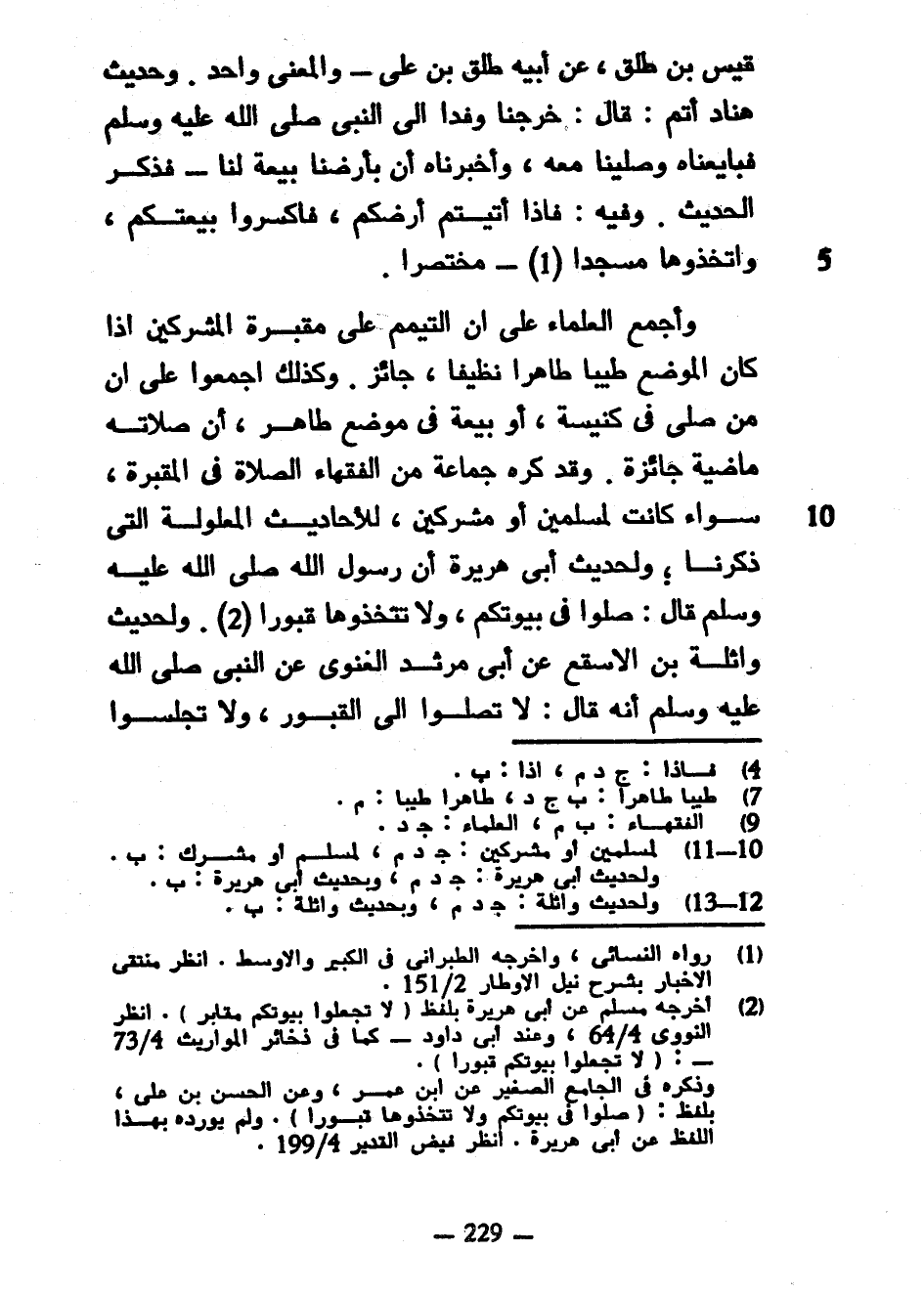 قَيْسِ بْنِ طَلْقٍ عَنْ أَبِيهِ طَلْقِ بْنِ عَلِيٍّ وَالْمَعْنَى وَاحِدٌ وَحَدِيثُ هَنَّادٍ أَتَمُّ قَالَ خَرَجْنَا وَفْدًا إِلَى النَّبِيِّ صَلَّى اللَّهُ عَلَيْهِ وسلم فبايعناه وصلينا معه وأخبرنا أَنَّ بِأَرْضِنَا بَيْعَةً لَنَا فَذَكَرَ الْحَدِيثَ وَفِيهِ فَإِذَا أَتَيْتُمْ أَرْضَكُمْ فَاكْسِرُوا بَيْعَتَكُمْ وَاتَّخِذُوهَا مَسْجِدًا مُخْتَصَرًا وَأَجْمَعَ الْعُلَمَاءُ عَلَى أَنَّ التَّيَمُّمَ عَلَى مَقْبَرَةِ الْمُشْرِكِينَ إِذَا كَانَ الْمَوْضِعُ طَيِّبًا طَاهِرًا نَظِيفًا جَائِزٌ وَكَذَلِكَ أَجْمَعُوا عَلَى أَنَّ مَنْ صَلَّى فِي كَنِيسَةٍ أَوْ بَيْعَةٍ فِي مَوْضِعٍ طَاهِرٍ أَنَّ صَلَاتَهُ مَاضِيَةٌ جَائِزَةٌ وَقَدْ كَرِهَ جَمَاعَةٌ مِنَ الْفُقَهَاءِ الصَّلَاةَ فِي الْمَقْبَرَةِ سَوَاءٌ كَانَتْ لِمُسْلِمِينَ أَوْ مُشْرِكِينَ لِلْأَحَادِيثِ الْمَعْلُولَةِ الَّتِي ذَكَرْنَا وَلِحَدِيثِ أَبِي هُرَيْرَةَ أَنَّ رَسُولَ اللَّهِ صَلَّى اللَّهُ عَلَيْهِ وَسَلَّمَ قَالَ صَلُّوا فِي بُيُوتِكُمْ وَلَا تَتَّخِذُوهَا قُبُورًا وَلِحَدِيثِ وَاثِلَةَ بْنِ الْأَسْقَعِ عَنْ أَبِي مَرْثَدٍ الْغَنَوِيِّ عَنِ النَّبِيِّ صَلَّى اللَّهُ عَلَيْهِ وَسَلَّمَ أَنَّهُ قَالَ لَا تُصَلُّوا إِلَى الْقُبُورِ وَلَا تَجْلِسُوا