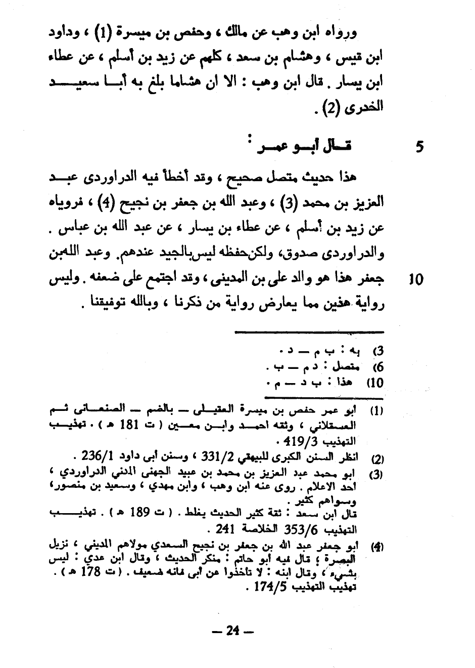 وَرَوَاهُ ابْنُ وَهْبٍ عَنْ مَالِكٍ وَحَفْصُ بْنُ مَيْسَرَةَ وَدَاوُدُ بْنُ قَيْسٍ وَهِشَامُ بْنُ سَعْدٍ كُلُّهُمْ عَنْ زَيْدِ بْنِ أَسْلَمَ عَنْ عَطَاءِ بْنِ يَسَارٍ قَالَ ابْنُ وَهْبٍ إِلَّا أَنَّ هِشَامًا بَلَغَ بِهِ أَبَا سَعِيدٍ الْخُدْرِيَّ قَالَ أَبُو عُمَرَ هَذَا حَدِيثٌ مُتَّصِلٌ صَحِيحٌ وَقَدْ أَخْطَأَ فِيهِ الدَّرَاوَرْدِيُّ عَبْدُ الْعَزِيزِ بْنُ مُحَمَّدٍ وَعَبْدُ اللَّهِ بْنُ جَعْفَرِ بْنِ نَجِيحٍ فَرَوَيَاهُ عَنْ زَيْدِ بْنِ أَسْلَمَ عَنْ عَطَاءِ بْنِ يَسَارٍ عَنْ عَبْدِ اللَّهِ بْنِ عَبَّاسٍ وَالدَّرَاوَرْدِيُّ صدوق ولكن حفظه لَيْسَ بِالْجَيِّدِ عِنْدَهُمْ وَعَبْدُ اللَّهِ بْنُ جَعْفَرٍ هَذَا هُوَ وَالِدُ عَلِيِّ بْنِ الْمَدِينِيِّ وَقَدِ اجْتُمِعَ عَلَى ضَعْفِهِ وَلَيْسَ رِوَايَةُ هَذَيْنِ مِمَّا يُعَارِضُ رِوَايَةَ مَنْ ذَكَرْنَا وَبِاللَّهِ تَوْفِيقُنَا