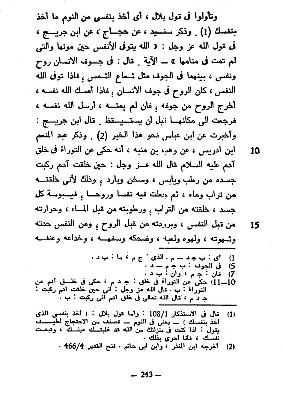 وَتَأَوَّلُوا فِي قَوْلِ بِلَالٍ أَيْ أَخَذَ بِنَفْسِي مِنَ النَّوْمِ مَا أَخَذَ بِنَفْسِكَ وَذَكَرَ سُنَيْدٌ عَنْ حَجَّاجٍ عَنِ ابْنِ جُرَيْجِ فِي قَوْلِ اللَّهِ عَزَّ وَجَلَّ اللَّهُ يَتَوَفَّى الْأَنْفُسَ حِينَ مَوْتِهَا وَالَّتِي لَمْ تَمُتْ فِي مَنَامِهَا الْآيَةَ قَالَ فِي جَوْفِ الْإِنْسَانِ رُوحٌ وَنَفْسٌ بَيْنِهِمَا فِي الْجَوْفِ مِثْلُ شُعَاعِ الشَّمْسِ فَإِذَا تَوَفَّى اللَّهُ النَّفْسَ كَانَ الرُّوحُ فِي جَوْفِ الْإِنْسَانِ فَإِذَا أَمْسَكَ اللَّهُ نَفْسَهُ أَخْرَجَ الرُّوحَ مِنْ جَوْفِهِ فَإِنْ لَمْ يُمِتْهُ أَرْسَلَ اللَّهُ نَفْسَهُ فَرَجَعَتْ إِلَى مَكَانِهَا قَبْلَ أَنْ يَسْتَيْقِظَ قَالَ ابْنُ جُرَيْجٍ وَأُخْبِرْتُ عَنِ ابْنِ عَبَّاسٍ نَحْوَ هَذَا الْخَبَرِ وَذَكَرَ عَبْدُ الْمُنْعِمِ بْنُ إِدْرِيسَ عَنْ وَهْبِ بْنِ مُنَبِّهٍ أَنَّهُ حَكَى عَنِ التَّوْرَاةِ فِي خَلْقِ آدَمَ عَلَيْهِ السَّلَامُ قَالَ اللَّهُ عَزَّ وَجَلَّ حِينَ خَلَقْتُ آدَمَ رَكَّبْتُ جَسَدَهُ مِنْ رَطْبٍ وَيَابِسٍ وَسُخْنٍ وَبَارِدٍ وَذَلِكَ لِأَنِّي خَلَقْتُهُ مِنْ تُرَابٍ وَمَاءٍ ثُمَّ جَعَلْتُ فِيهِ نَفْسًا وَرُوحًا فَيُبُوسَةُ كُلُّ جَسَدٍ خَلَقْتُهُ مِنَ التُّرَابِ وَرُطُوبَتُهُ مِنْ قِبَلِ الْمَاءِ وَحَرَارَتُهُ مِنْ قِبَلِ النَّفْسِ وَبُرُودَتُهُ مِنْ قِبَلِ الرُّوحِ وَمِنَ النَّفْسِ حِدَّتُهُ وَشَهْوَتُهُ وَلَهْوُهُ وَلَعِبُهُ وَضَحِكُهُ وَسَفَهُهُ وَخِدَاعُهُ وَعُنْفُهُ