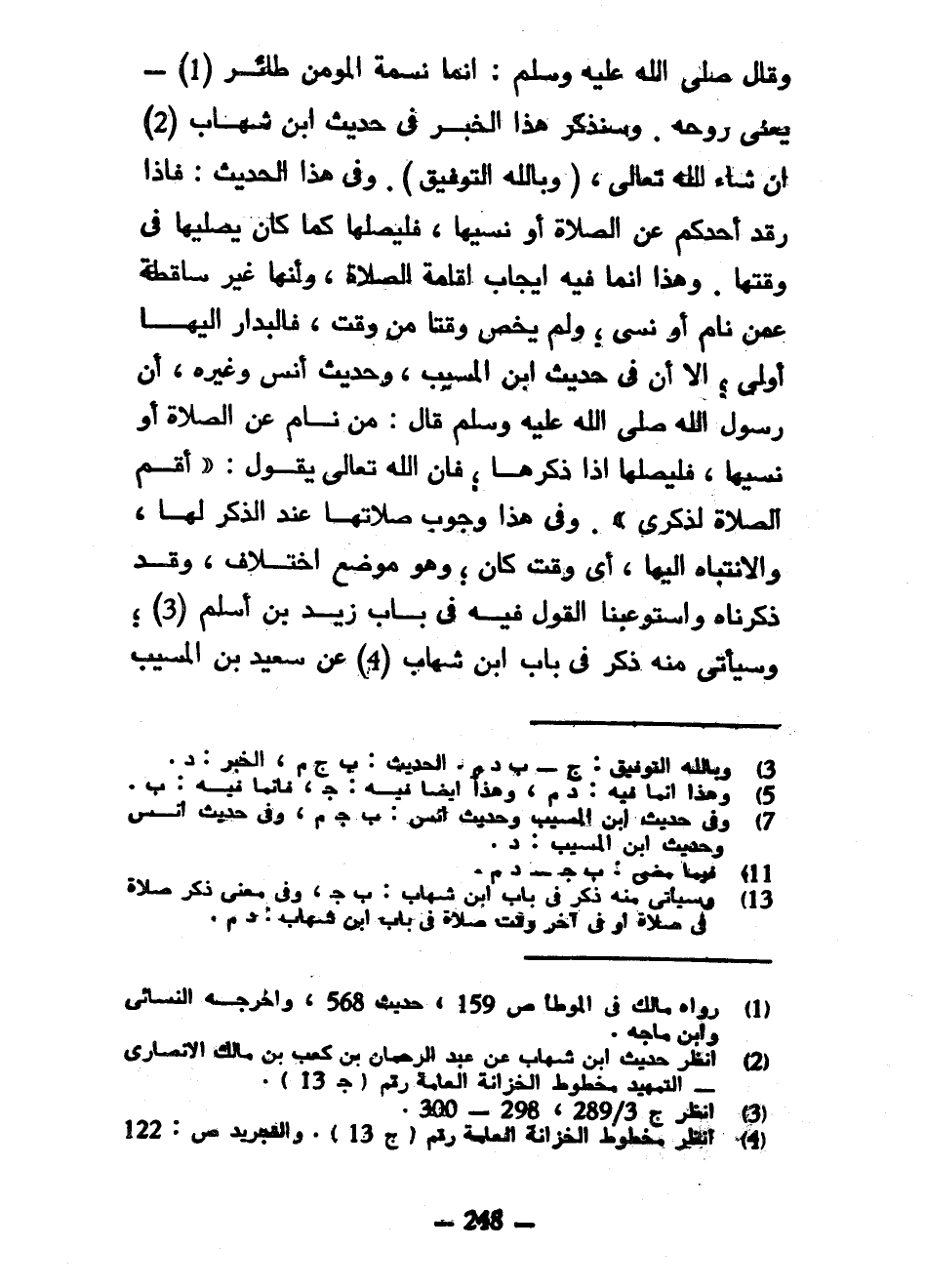 وَقَالَ صَلَّى اللَّهُ عَلَيْهِ وَسَلَّمَ إِنَّمَا نَسَمَةُ الْمُؤْمِنِ طائر يعني روحه وسنذكر هذاالخبر فِي حَدِيثِ ابْنِ شِهَابٍ إِنْ شَاءَ اللَّهُ تَعَالَى (وَبِاللَّهِ التَّوْفِيقِ) وَفِي هَذَا الْحَدِيثِ فَإِذَا رَقَدَ أَحَدُكُمْ عَنِ الصَّلَاةِ أَوْ نَسِيَهَا فَلْيُصَلِّهَا كَمَا كَانَ يُصَلِّيهَا فِي وَقْتِهَا وَهَذَا إِنَّمَا فِيهِ إِيجَابُ إِقَامَةِ الصَّلَاةِ وَأَنَّهَا غَيْرُ سَاقِطَةٍ عَمَّنْ نَامَ أَوْ نَسِيَ وَلَمْ يَخُصَّ وَقْتًا مِنْ وَقْتٍ فَالْبِدَارُ إِلَيْهَا أَوْلَى إِلَّا أَنَّ فِي حَدِيثِ ابْنِ الْمُسَيِّبِ وَحَدِيثِ أَنَسٍ وَغَيْرِهِ أَنَّ رَسُولَ اللَّهِ صَلَّى اللَّهُ عَلَيْهِ وسلم قَالَ مَنْ نَامَ عَنِ الصَّلَاةِ أَوْ نَسِيَهَا فَلْيُصَلِّهَا إِذَا ذَكَرَهَا فَإِنَّ اللَّهَ تَعَالَى يَقُولُ وأقم الصلاة لذكري وفي هذا وجوب صلاتها عندالذكر لَهَا وَالِانْتِبَاهِ إِلَيْهَا أَيَّ وَقْتٍ كَانَ وَهُوَ مَوْضِعُ اخْتِلَافٍ وَقَدْ ذَكَرْنَاهُ وَاسْتَوْعَبْنَا الْقَوْلَ فِيهِ فِي بَابِ زَيْدِ بْنِ أَسْلَمَ وَسَيَأْتِي مِنْهُ ذِكْرٌ فِي بَابِ ابْنِ شِهَابٍ عَنِ سَعِيدِ بْنِ المسيب