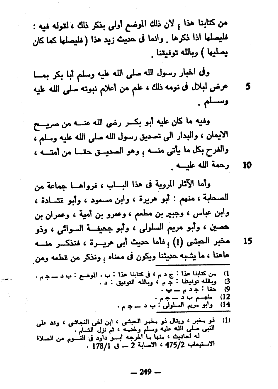 مِنْ كِتَابِنَا هَذَا لِأَنَّ ذَلِكَ الْمَوْضِعَ أَوْلَى بِذِكْرِ ذَلِكَ لِقَوْلِهِ فِيهِ فَلَيُصَلِّهَا إِذَا ذَكَرَهَا وَإِنَّمَا فِي حَدِيثِ زَيْدٍ هَذَا (فَلْيُصَلِّهَا كَمَا كَانَ يُصَلِّيهَا) وَبِاللَّهِ تَوْفِيقُنَا وَفِي إِخْبَارِ رَسُولُ اللَّهِ صَلَّى اللَّهُ عَلَيْهِ وَسَلَّمَ أَبَا بَكْرٍ بِمَا عَرَضَ لِبِلَالٍ فِي نَوْمِهِ ذَلِكَ عَلَمٌ مِنْ أَعْلَامِ نُبُوَّتِهِ صَلَّى اللَّهُ عَلَيْهِ وَسَلَّمَ وَفِيهِ مَا كَانَ عَلَيْهِ أَبُو بَكْرٍ رَضِيَ اللَّهُ عَنْهُ مِنْ صَرِيحِ الْإِيمَانِ وَالْبِدَارِ إِلَى تَصْدِيقِ رَسُولِ اللَّهِ صَلَّى اللَّهُ عَلَيْهِ وَسَلَّمَ وَالْفَرَحِ بِكُلِّ مَا يَأْتِي مِنْهُ وَهُوَ الصِّدِّيقُ حَقًّا مِنْ أُمَّتِهِ رَحْمَةُ اللَّهِ عَلَيْهِ وَأَمَّا الْآثَارُ الْمَرْوِيَّةُ فِي هَذَا الْبَابِ فَرَوَاهَا جَمَاعَةٌ مِنَ الصَّحَابَةِ مِنْهُمْ أَبُو هُرَيْرَةَ وَابْنُ مَسْعُودٍ وَأَبُو قَتَادَةَ وَابْنُ عَبَّاسٍ وَجُبَيْرِ بْنِ مُطْعِمٍ وَعَمْرُو بْنُ أُمَيَّةَ وَعِمْرَانُ بْنُ حُصَيْنٍ وَأَبُو مَرْيَمَ السَّلُولِيُّ وَأَبُو جُحَيْفَةَ السِّوَائِيُّ وَذُو مِخْبَرٍ الْحَبَشِيُّ فَأَمَّا حَدِيثُ أَبِي هُرَيْرَةَ فَنَذْكُرُ مِنْهُ هاهنا مَا يُشْبِهُ حَدِيثَنَا وَيَكُونُ فِي مَعْنَاهُ وَنَذْكُرُ مَنْ قَطَعَهُ وَمَنْ