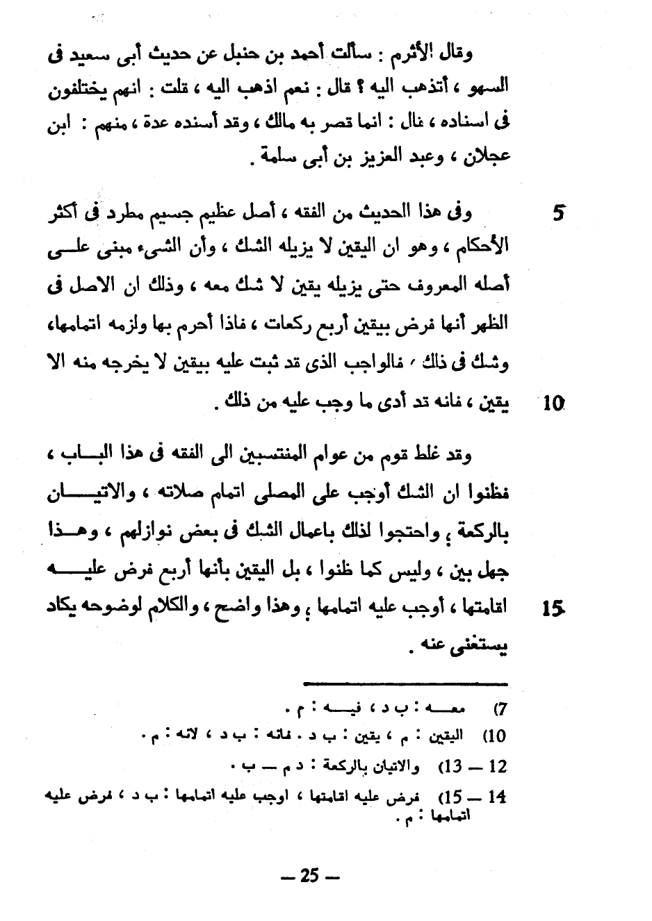 وَقَالَ الْأَثْرَمُ سَأَلْتُ أَحْمَدَ بْنَ حَنْبَلٍ عَنْ حَدِيثِ أَبِي سَعِيدٍ فِي السَّهْوِ أَتَذْهَبُ إِلَيْهِ قَالَ نَعَمْ أَذْهَبُ إِلَيْهِ قُلْتُ إِنَّهُمْ يَخْتَلِفُونَ فِي إِسْنَادِهِ قَالَ إِنَّمَا قَصَّرَ بِهِ مَالِكٌ وَقَدْ أَسْنَدَهُ عِدَّةٌ مِنْهُمْ ابْنُ عَجْلَانَ وَعَبْدُ الْعَزِيزِ بْنُ أَبِي سَلَمَةَ وَفِي هَذَا الْحَدِيثِ مِنَ الْفِقْهِ أَصْلٌ عَظِيمٌ جَسِيمٌ مُطَّرِدٌ فِي أَكْثَرِ الْأَحْكَامِ وَهُوَ أَنَّ الْيَقِينَ لَا يُزِيلُهُ الشَّكُّ وَأَنَّ الشَّيْءَ مَبْنِيٌّ عَلَى أَصْلِهِ الْمَعْرُوفِ حَتَّى يُزِيلَهُ يَقِينٌ لَا شَكَّ مَعَهُ وَذَلِكَ أَنَّ الْأَصْلَ فِي الظُّهْرِ أَنَّهَا فَرْضٌ بِيَقِينٍ أَرْبَعُ رَكَعَاتٍ فَإِذَا أَحْرَمَ بِهَا وَلَزِمَهُ إِتْمَامُهَا وَشَكَّ فِي ذَلِكَ فَالْوَاجِبُ الَّذِي قَدْ ثَبَتَ عَلَيْهِ بِيَقِينٍ لَا يُخْرِجُهُ مِنْهُ إِلَّا يَقِينٌ فَإِنَّهُ قَدْ أَدَّى مَا وَجَبَ عَلَيْهِ مِنْ ذَلِكَ وَقَدْ غَلِطَ قَوْمٌ مِنْ عَوَامِّ الْمُنْتَسِبِينَ إِلَى الْفِقْهِ فِي هَذَا الْبَابِ فَظَنُّوا أَنَّ الشَّكَّ أَوْجَبَ عَلَى الْمُصَلِّي إِتْمَامَ صَلَاتِهِ وَالْإِتْيَانَ بِالرَّكْعَةِ وَاحْتَجُّوا لِذَلِكَ بِأَعْمَالِ الشَّكِّ فِي بَعْضِ نَوَازِلِهِمْ وَهَذَا جَهْلٌ بَيِّنٌ وَلَيْسَ كَمَا ظَنُّوا بَلِ الْيَقِينُ بِأَنَّهَا أَرْبَعٌ فُرِضَ عَلَيْهِ إِقَامَتُهَا أوجب عليه إتمامها وهذا واضح والكلام لِوُضُوحِهِ يَكَادُ يُسْتَغْنَى عَنْهُ