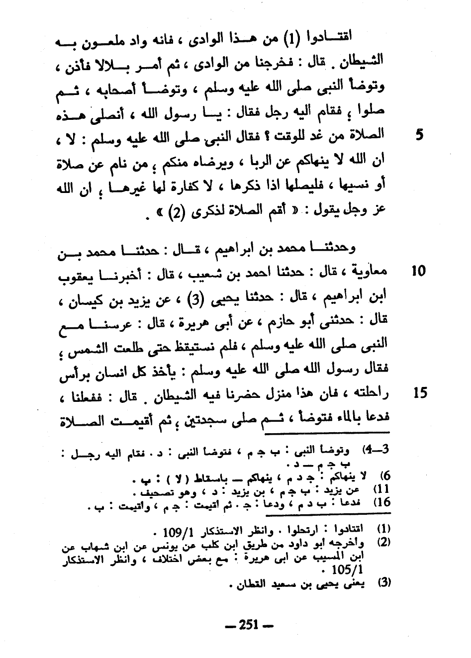 اقْتَادُوا مِنْ هَذَا الْوَادِي فَإِنَّهُ وَادٍ مَلْعُونٌ الشَّيْطَانُ قَالَ فَخَرَجْنَا مِنَ الْوَادِي ثُمَّ أَمَرَ بِلَالًا فَأَذَّنَ وَتَوَضَّأَ النَّبِيُّ صَلَّى اللَّهُ عَلَيْهِ وَسَلَّمَ وَتَوَضَّأَ أَصْحَابُهُ ثُمَّ صَلَّوْا فَقَامَ إِلَيْهِ رَجُلٌ فَقَالَ يَا رَسُولَ اللَّهِ أَنُصَلِّي هَذِهِ الصَّلَاةَ مِنْ غَدٍ لِلْوَقْتِ فَقَالَ النَّبِيُّ صَلَّى اللَّهُ عَلَيْهِ وَسَلَّمَ لَا إِنَّ اللَّهَ لَا يَنْهَاكُمْ عَنِ الرِّبَا وَيَرْضَاهُ مِنْكُمْ مَنْ نَامَ عَنْ صَلَاةٍ أَوْ نَسِيَهَا فَلْيُصَلِّهَا إِذَا ذَكَرَهَا لَا كَفَّارَةَ لَهَا غَيْرُهَا إِنَّ اللَّهَ عَزَّ وَجَلَّ يَقُولُ وَأَقِمِ الصَّلَاةَ لِذِكْرِي وَحَدَّثَنَا مُحَمَّدُ بْنُ إِبْرَاهِيمَ قَالَ حَدَّثَنَا مُحَمَّدُ بْنُ مُعَاوِيَةَ قَالَ حَدَّثَنَا أَحْمَدُ بْنُ شُعَيْبٍ قَالَ أَخْبَرَنَا يَعْقُوبُ بْنُ إِبْرَاهِيمَ قَالَ حَدَّثَنَا يَحْيَى عَنْ يَزِيدَ بْنِ كَيْسَانَ قَالَ حَدَّثَنِي أَبُو حَازِمٍ عَنْ أَبِي هُرَيْرَةَ قَالَ عَرَّسْنَا مَعَ النَّبِيِّ صَلَّى اللَّهُ عَلَيْهِ وَسَلَّمَ فَلَمْ نَسْتَيْقِظْ حَتَّى طَلَعَتِ الشَّمْسُ فَقَالَ رَسُولُ اللَّهِ صَلَّى اللَّهُ عَلَيْهِ وَسَلَّمَ يَأْخُذُ كُلُّ إِنْسَانٍ بِرَأْسِ رَاحِلَتِهِ فَإِنَّ هَذَا مَنْزِلٌ حَضَرَنَا فِيهِ الشَّيْطَانُ قَالَ فَفَعَلْنَا فَدَعَا بِالْمَاءِ فَتَوَضَّأَ ثُمَّ صَلَّى سَجْدَتَيْنِ ثُمَّ أُقِيمَتِ الصَّلَاةُ