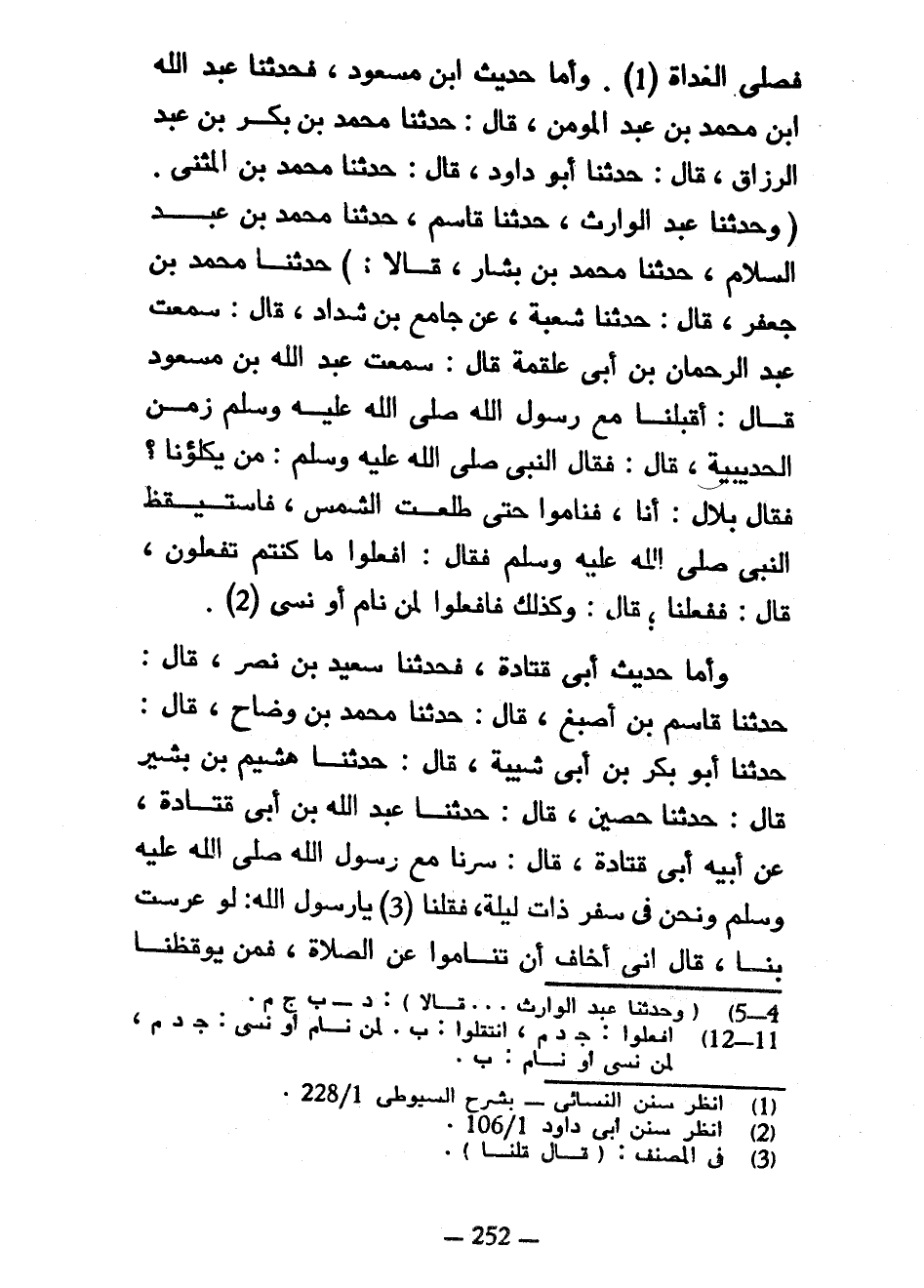 فَصَلَّى الْغَدَاةَ وَأَمَّا حَدِيثُ ابْنِ مَسْعُودٍ فَحَدَّثْنَا عَبْدُ اللَّهِ بْنُ مُحَمَّدِ بْنِ عَبْدِ الْمُؤْمِنِ قَالَ حَدَّثَنَا مُحَمَّدُ بْنُ بَكْرِ بْنِ عَبْدِ الرَّزَّاقِ قَالَ حَدَّثَنَا أَبُو دَاوُدَ قَالَ حَدَّثَنَا مُحَمَّدُ بْنُ الْمُثَنَّى (وَحَدَّثَنَا عَبْدُ الْوَارِثِ حَدَّثَنَا قَاسِمٌ حَدَّثَنَا مُحَمَّدُ بْنُ عَبْدِ السَّلَامِ حَدَّثَنَا مُحَمَّدُ بْنُ بَشَّارٍ قَالَا) حَدَّثَنَا مُحَمَّدُ بْنُ جَعْفَرٍ قَالَ حَدَّثَنَا شُعْبَةُ عَنْ جَامِعِ بْنِ شَدَّادٍ قَالَ سَمِعْتُ عَبْدَ الرَّحْمَنِ بْنَ أَبِي عَلْقَمَةَ قَالَ سَمِعْتُ عَبْدَ اللَّهِ بْنَ مَسْعُودٍ قَالَ أَقْبَلْنَا مَعَ رَسُولِ اللَّهِ صَلَّى اللَّهُ عَلَيْهِ وَسَلَّمَ زَمَنَ الْحُدَيْبِيَةِ قَالَ فَقَالَ النَّبِيُّ صَلَّى اللَّهُ عَلَيْهِ وَسَلَّمَ مَنْ يَكْلَؤُنَا فَقَالَ بِلَالٌ أَنَا فَنَامُوا حَتَّى طَلَعَتِ الشَّمْسُ فَاسْتَيْقَظَ النَّبِيُّ صَلَّى اللَّهُ عَلَيْهِ وَسَلَّمَ فَقَالَ افْعَلُوا مَا كُنْتُمْ تَفْعَلُونَ قَالَ فَفَعَلْنَا قَالَ وَكَذَلِكَ فَافْعَلُوا لِمَنْ نَامَ أَوْ نَسِيَ وَأَمَّا حَدِيثُ أَبِي قَتَادَةَ فَحَدَّثَنَا سَعِيدُ بْنُ نَصْرٍ قَالَ حَدَّثَنَا قَاسِمُ بْنُ أَصْبَغَ قَالَ حَدَّثَنَا مُحَمَّدُ بْنُ وَضَّاحٍ قَالَ حَدَّثَنَا أَبُو بَكْرِ بْنُ أَبِي شَيْبَةَ قَالَ حَدَّثَنَا هُشَيْمُ بْنُ بَشِيرٍ قَالَ حَدَّثَنَا حُصَيْنٌ قَالَ حَدَّثَنَا عَبْدُ اللَّهِ بْنُ أَبِي قَتَادَةَ عَنْ أَبِيهِ أَبِي قَتَادَةَ قَالَ سِرْنَا مَعَ رَسُولِ اللَّهِ صَلَّى اللَّهُ عَلَيْهِ وَسَلَّمَ وَنَحْنُ فِي سَفَرٍ ذَاتِ لَيْلَةٍ فَقُلْنَا يَا رَسُولَ اللَّهِ لَوْ عَرَّسْتَ بِنَا قَالَ إِنِّي أَخَافُ أَنْ تَنَامُوا عَنِ الصَّلَاةِ فمن يوقظنا