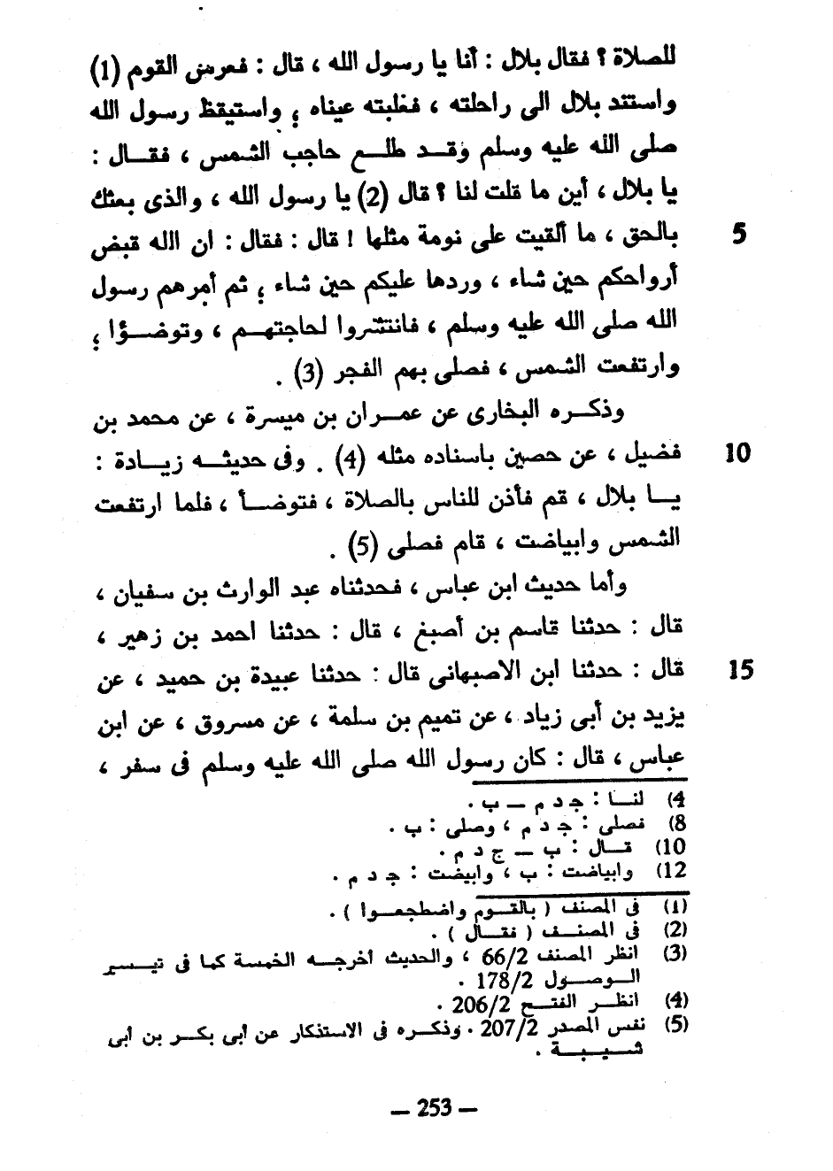 لِلصَّلَاةِ فَقَالَ بِلَالٌ أَنَا يَا رَسُولَ اللَّهِ قَالَ فَعَرَّسَ الْقَوْمُ وَاسْتَنَدَ بِلَالٌ إِلَى رَاحِلَتِهِ فَغَلَبَتْهُ عَيْنَاهُ وَاسْتَيْقَظَ رَسُولُ اللَّهِ صَلَّى اللَّهُ عَلَيْهِ وَسَلَّمَ وَقَدْ طَلَعَ حَاجِبُ الشَّمْسِ فَقَالَ يَا بِلَالُ أَيْنَ مَا قُلْتَ لَنَا قَالَ يَا رَسُولَ اللَّهِ وَالَّذِي بَعَثَكَ بِالْحَقِّ مَا أُلْقِيَتْ عَلَيَّ نَوْمَةٌ مِثْلَهَا قَالَ فَقَالَ إِنَّ اللَّهَ قَبَضَ أَرْوَاحَكُمْ حِينَ شَاءَ وَرَدَّهَا عَلَيْكُمْ حِينَ شَاءَ ثُمَّ أَمَرَهُمْ رَسُولُ اللَّهِ صَلَّى اللَّهُ عَلَيْهِ وَسَلَّمَ فانتشروا لحاجتهم وتوضؤا وَارْتَفَعَتِ الشَّمْسُ فَصَلَّى بِهِمُ الْفَجْرَ وَذَكَرَهُ الْبُخَارِيُّ عَنْ عِمْرَانَ بْنِ مَيْسَرَةَ عَنْ مُحَمَّدِ بْنِ فُضَيْلٍ عَنْ حُصَيْنٍ بِإِسْنَادِهِ مِثْلَهُ وَفِي حَدِيثِهِ زِيَادَةٌ يَا بِلَالُ قُمْ فَأَذِّنْ لِلنَّاسِ بِالصَّلَاةِ فَتَوَضَّأَ فَلَمَّا ارْتَفَعَتِ الشَّمْسُ وَابْيَاضَّتْ قَامَ فَصَلَّى وَأَمَّا حَدِيثُ ابْنُ عَبَّاسٍ فَحَدَّثَنَاهُ عَبْدُ الْوَارِثِ بْنُ سُفْيَانَ قَالَ حَدَّثَنَا قَاسِمُ بْنُ أَصْبَغَ قَالَ حَدَّثَنَا أَحْمَدُ بْنُ زُهَيْرٍ قَالَ حَدَّثَنَا ابْنُ الْأَصْبَهَانِيِّ قَالَ حَدَّثَنَا عُبَيْدَةُ بْنُ حُمَيْدٍ عَنْ يَزِيدَ بْنِ أَبِي زِيَادٍ عَنْ تَمِيمِ بْنِ سَلَمَةَ عَنْ مَسْرُوقٍ عَنِ ابْنِ عَبَّاسٍ قَالَ كَانَ رَسُولُ اللَّهِ صَلَّى اللَّهُ عَلَيْهِ وَسَلَّمَ فِي سَفَرٍ