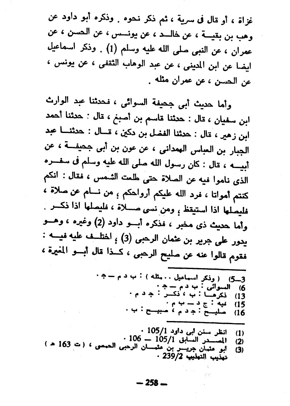 غَزَاةٍ أَوْ قَالَ فِي سَرِيَّةٍ ثُمَّ ذَكَرَ نَحْوَهُ وَذَكَرَهُ أَبُو دَاوُدَ عَنْ وَهْبِ بْنِ بَقِيَّةَ عَنْ خَالِدٍ عَنْ يُونُسَ عَنِ الْحَسَنِ عَنْ عِمْرَانَ عَنِ النَّبِيِّ صَلَّى اللَّهُ عَلَيْهِ وَسَلَّمَ وَذَكَرَ إِسْمَاعِيلَ أَيْضًا عَنِ ابْنِ الْمَدِينِيِّ عَنْ عَبْدِ الْوَهَّابِ الثَّقَفِيِّ عَنْ يُونُسَ عَنِ الْحَسَنِ عَنْ عِمْرَانَ مِثْلَهُ وَأَمَّا حَدِيثُ أَبِي جُحَيْفَةَ السِّوَائِيِّ فَحَدَّثَنَا عَبْدُ الْوَارِثِ بْنُ سُفْيَانَ قَالَ حَدَّثَنَا قَاسِمُ بْنُ أَصْبَغَ قَالَ حَدَّثَنَا أَحْمَدُ ابْنُ زُهَيْرٍ قَالَ حَدَّثَنَا الْفَضْلُ بْنُ دُكَيْنٍ قَالَ حَدَّثَنَا عَبْدُ الْجَبَّارِ بْنُ الْعَبَّاسِ الْهَمْدَانِيُّ عَنْ عَوْنِ بْنِ أَبِي جُحَيْفَةَ عَنْ أَبِيهِ قَالَ كَانَ رَسُولُ اللَّهِ صَلَّى اللَّهُ عَلَيْهِ وَسَلَّمَ فِي سَفَرِهِ الَّذِي نَامُوا فِيهِ عَنِ الصَّلَاةِ حَتَّى طَلَعَتِ الشَّمْسُ فَقَالَ إِنَّكُمْ كُنْتُمْ أَمْوَاتًا فَرَدَّ اللَّهُ عَلَيْكُمْ أَرْوَاحَكُمْ مَنْ نَامَ عَنْ صَلَاةٍ فَلْيُصَلِّهَا إِذَا اسْتَيْقَظَ وَمَنْ نَسِيَ صَلَاةً فَلْيُصَلِّهَا إِذَا ذَكَرَ وَأَمَّا حَدِيثُ ذِي مِخْبَرٍ فَذَكَرَهُ أَبُو دَاوُدَ وَغَيْرُهُ وَهُوَ يَدُورُ عَلَى جَرِيرِ بْنِ عُثْمَانَ الرَّحَبِيِّ اخْتُلِفَ عَلَيْهِ فِيهِ فَقَوْمٌ قَالُوا عَنْهُ عَنْ صُلَيْحٍ الرَّحَبِيِّ كَذَا قَالَ أَبُو الْمُغِيرَةِ