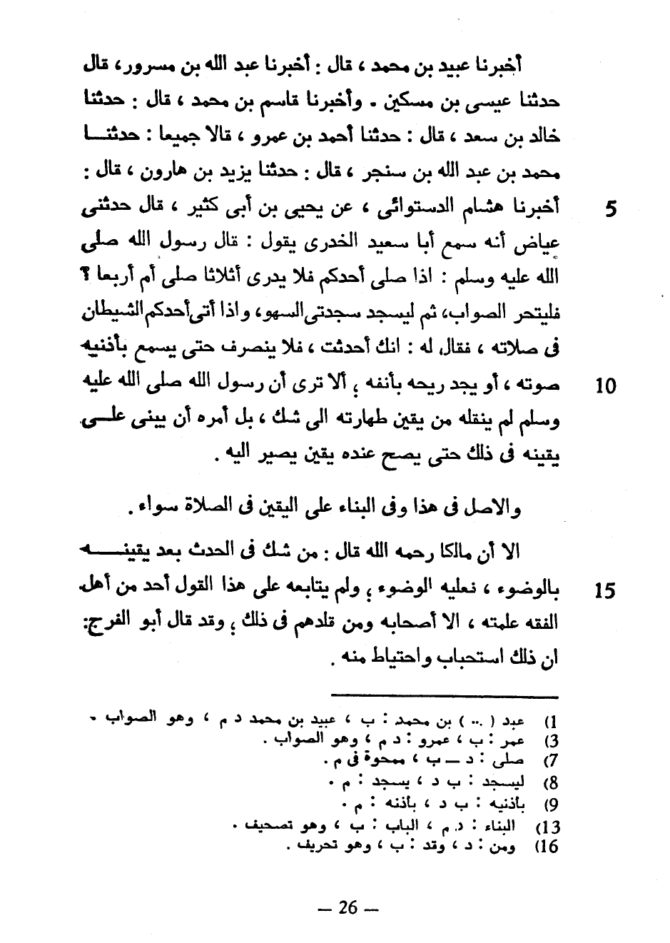 أَخْبَرَنَا عُبَيْدُ بْنُ مُحَمَّدٍ قَالَ أَخْبَرَنَا عَبْدُ اللَّهِ بْنُ مَسْرُورٍ قَالَ حَدَّثَنَا عِيسَى بْنُ مِسْكِينٍ وَأَخْبَرَنَا قَاسِمُ بْنُ مُحَمَّدٍ قَالَ حَدَّثَنَا خَالِدُ بْنُ سَعْدٍ قَالَ حَدَّثَنَا أَحْمَدُ بْنُ عَمْرٍو قَالَا جَمِيعًا حَدَّثَنَا مُحَمَّدُ بْنُ عَبْدِ اللَّهِ بْنِ سَنْجَرٍ قَالَ حَدَّثَنَا يَزِيدُ بْنُ هَارُونَ قَالَ أَخْبَرَنَا هِشَامٌ الدَّسْتُوَائِيُّ عَنْ يَحْيَى بْنِ أَبِي كَثِيرٍ قَالَ حَدَّثَنِي عِيَاضٌ أَنَّهُ سَمِعَ أَبَا سَعِيدٍ الْخُدْرِيَّ يَقُولُ قَالَ رَسُولُ اللَّهِ صَلَّى اللَّهُ عَلَيْهِ وَسَلَّمَ إِذَا صَلَّى أَحَدُكُمْ فَلَا يَدْرِي أَثَلَاثًا صَلَّى أَمْ أَرْبَعًا فَلْيَتَحَرَّ الصَّوَابَ ثُمَّ لِيَسْجُدْ سَجْدَتَيِ السَّهْوِ وَإِذَا أَتَى أَحَدَكُمُ الشَّيْطَانُ فِي صَلَاتِهِ فَقَالَ لَهُ إِنَّكَ أَحْدَثْتَ فَلَا يَنْصَرِفْ حَتَّى يَسْمَعَ بِأُذُنَيْهِ صَوْتَهُ أَوْ يَجِدَ رِيحَهُ بِأَنْفِهِ أَلَا تَرَى أَنَّ رَسُولَ اللَّهِ صَلَّى اللَّهُ عليه وسلم لَمْ يَنْقُلْهُ مِنْ يَقِينِ طَهَارَتِهِ إِلَى شَكٍّ بَلْ أَمَرَهُ أَنْ يَبْنِيَ عَلَى يَقِينِهِ فِي ذَلِكَ حَتَّى يَصِحَّ عِنْدَهُ يَقِينٌ يَصِيرُ إِلَيْهِ وَالْأَصْلُ فِي هَذَا وَفِي الْبِنَاءِ عَلَى الْيَقِينِ فِي الصَّلَاةِ سَوَاءٌ إِلَّا أَنَّ مَالِكًا رَحِمَهُ اللَّهُ قَالَ مَنْ شَكَّ فِي الْحَدَثِ بَعْدَ يَقِينِهِ بِالْوُضُوءِ فَعَلَيْهِ الْوُضُوءُ وَلَمْ يُتَابِعْهُ عَلَى هَذَا الْقَوْلِ أَحَدٌ مِنْ أَهْلِ الْفِقْهِ عَلِمْتُهُ إِلَّا أَصْحَابُهُ وَمَنْ قَلَّدَهُمْ فِي ذَلِكَ وَقَدْ قَالَ أَبُو الْفَرَجِ إِنَّ ذَلِكَ اسْتِحْبَابٌ وَاحْتِيَاطٌ منه