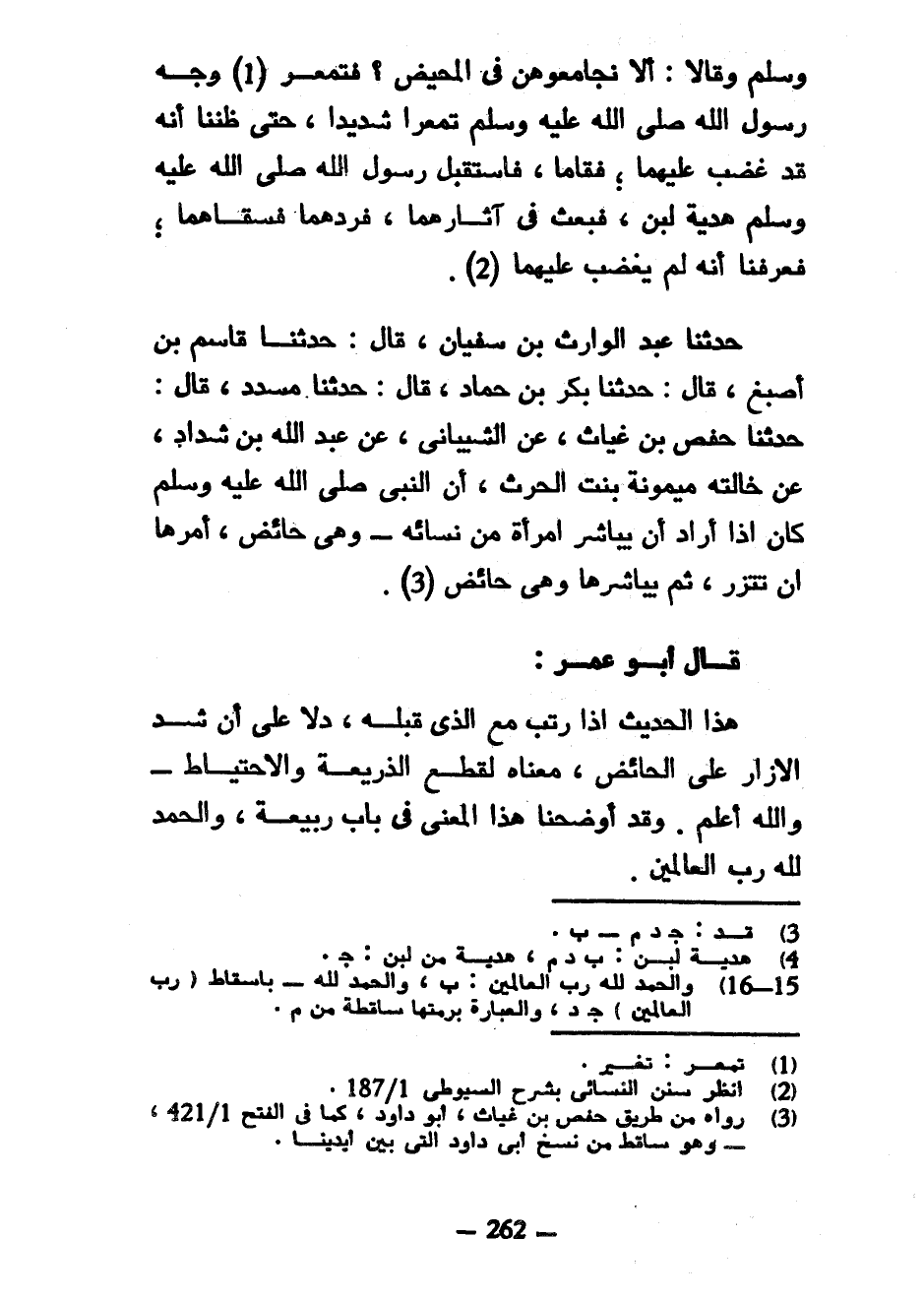 وَسَلَّمَ وَقَالَا أَلَا نُجَامِعُوهُنَّ فِي الْمَحِيضِ فَتَمَعَّرَ وَجْهُ رَسُولِ اللَّهِ صَلَّى اللَّهُ عَلَيْهِ وَسَلَّمَ تَمَعُّرًا شَدِيدًا حَتَّى ظَنَنَّا أَنَّهُ قَدْ غَضِبَ عَلَيْهِمَا فَقَامَا فَاسْتَقْبَلَ رَسُولُ اللَّهِ صَلَّى اللَّهُ عَلَيْهِ وَسَلَّمَ هَدِيَّةَ لَبَنٍ فَبَعَثَ فِي آثَارِهِمَا فَرَدَّهُمَا فَسَقَاهُمَا فَعَرَفْنَا أَنَّهُ لَمْ يَغْضَبْ عَلَيْهِمَا حَدَّثَنَا عَبْدُ الْوَارِثِ بْنُ سُفْيَانَ قَالَ حَدَّثَنَا قَاسِمُ بْنُ أَصْبَغَ قَالَ حَدَّثَنَا بَكْرُ بْنُ حَمَّادٍ قَالَ حَدَّثَنَا مُسَدَّدٌ قَالَ حَدَّثَنَا حَفْصُ بْنُ غِيَاثٍ عَنِ الشَّيْبَانِيِّ عَنْ عَبْدِ اللَّهِ بن شداد عن خالته ميمونة بنت الحرث أَنَّ النَّبِيَّ صَلَّى اللَّهُ عَلَيْهِ وَسَلَّمَ كَانَ إِذَا أَرَادَ أَنْ يُبَاشِرَ امْرَأَةً مِنْ نِسَائِهِ وَهِيَ حَائِضٌ أَمَرَهَا أَنْ تَتَّزِرَ ثُمَّ يُبَاشِرُهَا وَهِيَ حَائِضٌ قَالَ أَبُو عُمَرَ هَذَا الْحَدِيثُ إِذَا رُتِّبَ مَعَ الَّذِي قَبْلَهُ دَلَّا عَلَى أَنَّ شَدَّ الْإِزَارِ عَلَى الْحَائِضِ مَعْنَاهُ لِقَطْعِ الذَّرِيعَةِ وَالِاحْتِيَاطِ وَاللَّهُ أَعْلَمُ وَقَدْ أَوْضَحْنَا هَذَا الْمَعْنَى فِي بَابِ رَبِيعَةَ وَالْحَمْدُ لِلَّهِ رَبِّ العالمبن