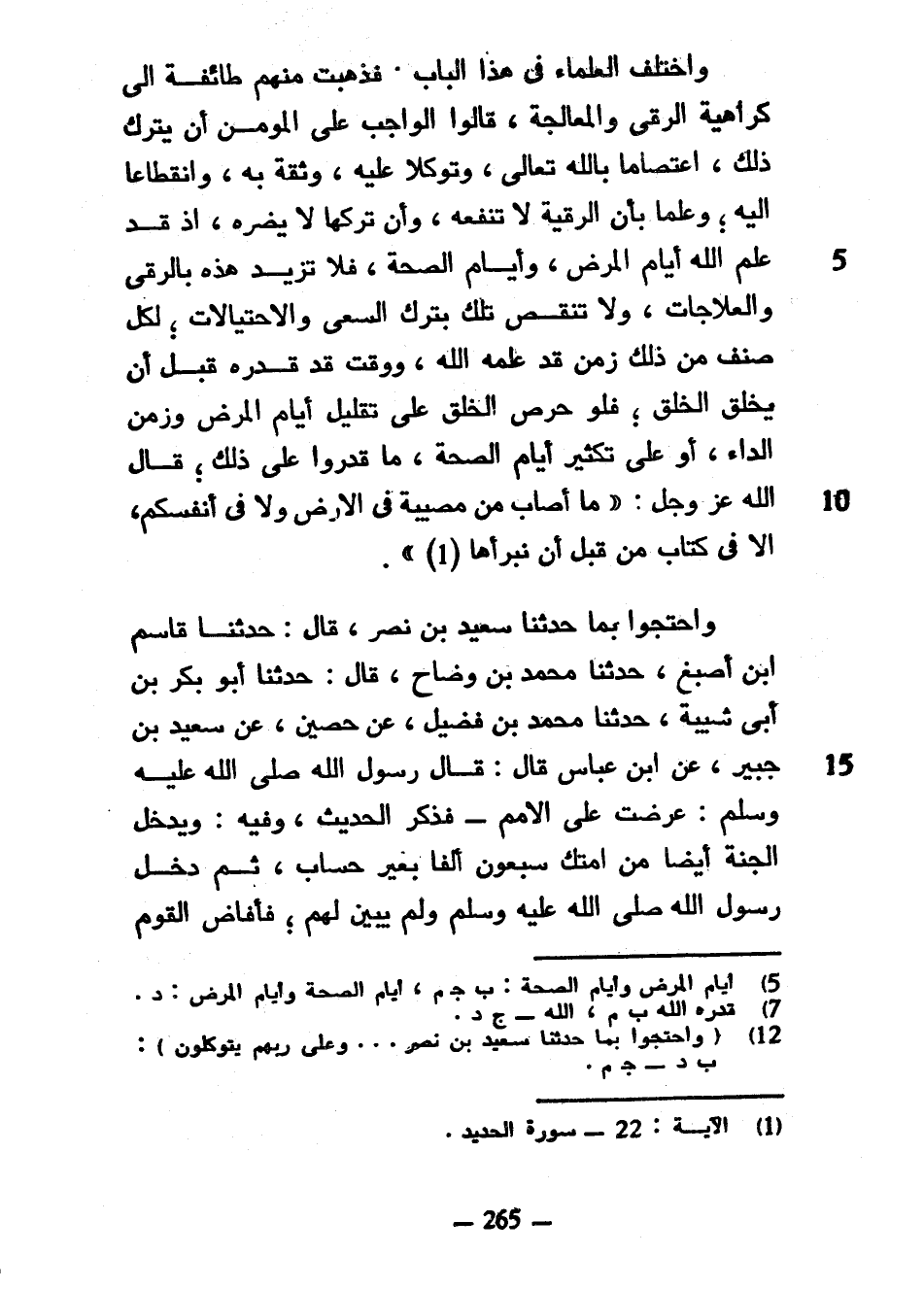 وَاخْتَلَفَ الْعُلَمَاءُ فِي هَذَا الْبَابِ فَذَهَبَتْ مِنْهُمْ طَائِفَةٌ إِلَى كَرَاهِيَةِ الرُّقَى وَالْمُعَالَجَةِ قَالُوا الْوَاجِبُ عَلَى الْمُؤْمِنِ أَنْ يَتْرُكَ ذَلِكَ اعْتِصَامًا بِاللَّهِ تَعَالَى وَتَوَكُّلًا عَلَيْهِ وَثِقَةً بِهِ وَانْقِطَاعًا إِلَيْهِ وعلما بأن الرقية لاتنفعه وَأَنَّ تَرْكَهَا لَا يَضُرُّهُ إِذْ قَدْ عَلِمَ اللَّهُ أَيَّامَ الْمَرَضِ وَأَيَّامَ الصِّحَّةِ فَلَا تَزِيدُ هَذِهِ بِالرُّقَى وَالْعِلَاجَاتِ وَلَا تَنْقُصُ تِلْكَ بِتَرْكِ السَّعْيِ وَالِاحْتِيَالَاتِ لِكُلِّ صِنْفٍ مِنْ ذَلِكَ زَمَنٌ قَدْ عَلِمَهُ اللَّهُ وَوَقْتٌ قَدْ قَدَّرَهُ قَبْلَ أَنْ يَخْلُقَ الْخَلْقَ فَلَوْ حَرَصَ الْخَلْقُ عَلَى تَقْلِيلِ أَيَّامِ الْمَرَضِ وَزَمَنِ الدَّاءِ أَوْ عَلَى تَكْثِيرِ أَيَّامِ الصِّحَّةِ مَا قَدَرُوا عَلَى ذَلِكَ قَالَ اللَّهُ عَزَّ وَجَلَّ مَا أَصَابَ مِنْ مُصِيبَةٍ فِي الْأَرْضِ وَلَا فِي أَنْفُسِكُمْ إِلَّا فِي كِتَابٍ مِنْ قَبْلِ أَنْ نَبْرَأَهَا وَاحْتَجُّوا بِمَا حَدَّثَنَا سَعِيدُ بْنُ نَصْرٍ قَالَ حَدَّثَنَا قَاسِمُ ابن أَصْبَغَ حَدَّثَنَا مُحَمَّدُ بْنُ وَضَّاحٍ قَالَ حَدَّثَنَا أَبُو بَكْرِ بْنُ أَبِي شَيْبَةَ حَدَّثَنَا مُحَمَّدُ بْنُ فُضَيْلٍ عَنْ حُصَيْنٍ عَنْ سَعِيدِ بْنِ جُبَيْرٍ عَنِ ابْنِ عَبَّاسٍ قَالَ قَالَ رَسُولُ اللَّهِ صَلَّى اللَّهُ عَلَيْهِ وَسَلَّمَ عُرِضَتْ عَلَيَّ الْأُمَمُ فَذَكَرَ الْحَدِيثَ وَفِيهِ وَيَدْخُلُ الْجَنَّةَ أَيْضًا مِنْ أُمَّتِكَ سَبْعُونَ أَلْفًا بِغَيْرِ حِسَابٍ ثُمَّ دَخَلَ رَسُولُ اللَّهِ صَلَّى اللَّهُ عَلَيْهِ وَسَلَّمَ وَلَمْ يُبَيِّنْ لَهُمْ فَأَفَاضَ الْقَوْمُ