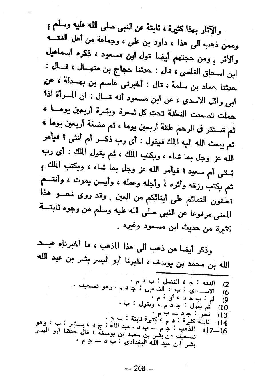 وَالْآثَارُ بِهَذَا كَثِيرَةٌ ثَابِتَةٌ عَنِ النَّبِيِّ صَلَّى اللَّهُ عَلَيْهِ وَسَلَّمَ وَمِمَّنْ ذَهَبَ إِلَى هَذَا دَاوُدُ بْنُ عَلِيٍّ وَجَمَاعَةٌ مِنْ أَهْلِ الْفِقْهِ وَالْأَثَرِ وَمِنْ حُجَّتِهِمْ أَيْضًا قَوْلُ ابْنِ مَسْعُودٍ ذَكَرَهُ إِسْمَاعِيلُ بْنُ إِسْحَاقَ الْقَاضِي قَالَ حَدَّثَنَا حَجَّاجُ بْنُ مِنْهَالٍ قَالَ حَدَّثَنَا حَمَّادُ بْنُ سَلَمَةَ قال أخبرني عاصم بن بَهْدَلَةَ عَنْ أَبِي وَائِلٍ الْأَسَدِيِّ عَنِ ابْنِ مَسْعُودٍ أَنَّهُ قَالَ إِنَّ الْمَرْأَةَ إِذَا حَمَلَتْ تَصَعَّدَتِ النُّطْفَةُ تَحْتَ كُلِّ شَعْرَةٍ وَبَشَرَةٍ أَرْبَعِينَ يَوْمًا ثُمَّ تَسْتَقِرُّ فِي الرَّحِمِ عَلَقَةً أَرْبَعِينَ يَوْمًا ثُمَّ مُضْغَةً أَرْبَعِينَ يَوْمًا ثُمَّ يَبْعَثُ اللَّهُ إِلَيْهِ الْمَلَكَ فَيَقُولُ أَيْ رَبِّ ذَكَرٌ أَمْ أُنْثَى فَيَأْمُرُ اللَّهُ عَزَّ وَجَلَّ بِمَا شَاءَ وَيَكْتُبُ الْمَلَكُ ثُمَّ يَقُولُ الْمَلَكُ أَيْ رَبِّ شَقِيٌّ أَمْ سَعِيدٌ فَيَأْمُرُ اللَّهُ عَزَّ وَجَلَّ بِمَا شَاءَ وَيَكْتُبُ الْمَلَكُ ثُمَّ يَكْتُبُ رِزْقَهُ وَأَثَرَهُ وَأَجَلَهُ وَعَمَلَهُ وَأَيْنَ يَمُوتُ وَأَنْتُمْ تُعَلِّقُونَ التَّمَائِمَ عَلَى أَبْنَائِكُمْ مِنَ الْعَيْنِ وَقَدْ رُوِيَ نَحْوَ هَذَا الْمَعْنَى مَرْفُوعًا عَنِ النَّبِيِّ صَلَّى اللَّهُ عَلَيْهِ وَسَلَّمَ مِنْ وُجُوهٍ ثَابِتَةٍ كَثِيرَةٍ مِنْ حَدِيثِ ابْنِ مَسْعُودٍ وَغَيْرِهِ وَذَكَرَ أَيْضًا مَنْ ذَهَبَ إِلَى هَذَا الْمَذْهَبِ مَا أَخْبَرَنَاهُ عَبْدُ اللَّهِ بْنُ مُحَمَّدِ بْنِ يُوسُفَ أَخْبَرَنَا أَبُو الْيُسْرِ بِشْرُ بْنُ عَبْدِ اللَّهِ
