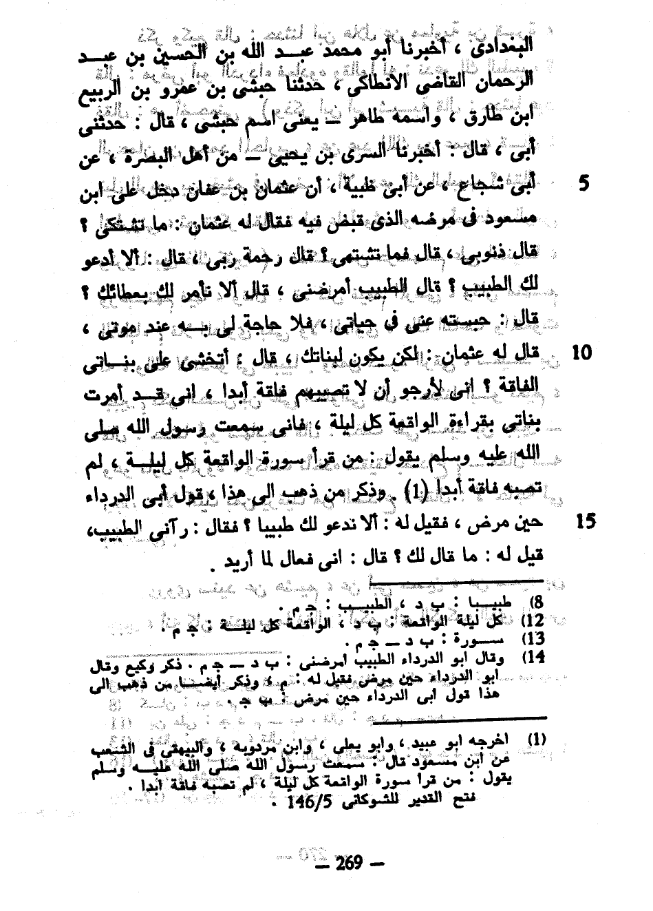 الْبَغْدَادِيُّ أَخْبَرَنَا أَبُو مُحَمَّدٍ عَبْدُ اللَّهِ بْنُ الْحُسَيْنِ بْنُ عَبْدِ الرَّحْمَنِ الْقَاضِي الْأَنْطَاكِيُّ حَدَّثَنَا حَبَشِيُّ بْنُ عَمْرِو بْنِ الرَّبِيعِ بْنِ طَارِقٍ وَاسْمُهُ طَاهِرٌ يَعْنِي اسْمَ حَبَشِيٍّ قَالَ حَدَّثَنِي أَبِي قَالَ أَخْبَرَنَا السَّرِيُّ بْنُ يَحْيَى مِنْ أَهْلِ الْبَصْرَةِ عَنْ أَبِي شُجَاعٍ عَنْ أَبِي ظَبْيَةَ أَنَّ عُثْمَانَ بْنَ عَفَّانَ دَخَلَ عَلَى ابْنِ مَسْعُودٍ فِي مَرَضِهِ الَّذِي قُبِضَ فِيهِ فَقَالَ لَهُ عُثْمَانُ مَا تَشْتَكِي قَالَ ذُنُوبِي قَالَ فَمَا تَشْتَهِي قَالَ رَحْمَةَ رَبِّي قَالَ أَلَا أَدْعُو لَكَ الطَّبِيبَ قَالَ الطَّبِيبُ أَمْرَضَنِي قَالَ أَلَا نَأْمُرُ لَكَ بِعَطَائِكَ قَالَ حَبَسْتُهُ عَنِّي فِي حَيَاتِي فَلَا حَاجَةَ لِي بِهِ عِنْدَ مَوْتِي قَالَ لَهُ عُثْمَانُ لَكِنْ يَكُونُ لِبَنَاتِكَ قَالَ أَتَخْشَى عَلَى بَنَاتِي الْفَاقَةَ إِنِّي لَأَرْجُو أَنْ لَا تُصِيبَهُمْ فَاقَةٌ أَبَدًا إِنِّي قَدْ أَمَرْتُ بَنَاتِي بِقِرَاءَةِ الْوَاقِعَةِ كُلَّ لَيْلَةٍ فَإِنِّي سَمِعْتُ رَسُولَ اللَّهِ صَلَّى اللَّهُ عَلَيْهِ وَسَلَّمَ يَقُولُ مَنْ قَرَأَ سُورَةَ الْوَاقِعَةِ كُلَّ لَيْلَةٍ لَمْ تُصِبْهُ فَاقَةٌ أَبَدًا وَذَكَرَ مَنْ ذَهَبَ إِلَى هَذَا قَوْلَ أَبِي الدَّرْدَاءِ حِينَ مَرِضَ فَقِيلَ لَهُ أَلَا نَدْعُو لَكَ طَبِيبًا فَقَالَ رَآنِي الطَّبِيبُ قِيلَ لَهُ مَا قَالُ لَكَ قَالَ إِنِّي فَعَّالٌ لِمَا أُرِيدُ