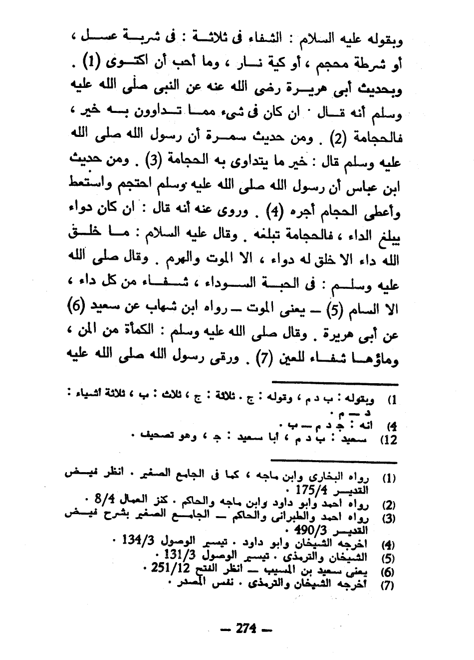وَبِقَوْلِهِ عَلَيْهِ السَّلَامُ الشِّفَاءُ فِي ثَلَاثَةٍ فِي شَرْبَةِ عَسَلٍ أَوْ شَرْطَةِ مِحْجَمٍ أَوْ كَيَّةِ نَارٍ وَمَا أُحِبُّ أَنْ أَكْتَوِيَ وَبِحَدِيثِ أَبِي هُرَيْرَةَ رَضِيَ اللَّهُ عَنْهُ عَنِ النَّبِيِّ صَلَّى اللَّهُ عَلَيْهِ وَسَلَّمَ أَنَّهُ قَالَ إِنْ كَانَ فِي شَيْءٍ مِمَّا تَدَاوُونَ بِهِ خَيْرٌ فَالْحِجَامَةُ وَمِنْ حَدِيثِ سَمُرَةَ أَنَّ رَسُولَ اللَّهِ صَلَّى اللَّهُ عَلَيْهِ وَسَلَّمَ قَالَ خَيْرُ مَا يُتَدَاوَى بِهِ الْحِجَامَةُ وَمِنْ حَدِيثِ ابْنِ عَبَّاسٍ أَنَّ رَسُولَ اللَّهِ صَلَّى اللَّهُ عَلَيْهِ وَسَلَّمَ احْتَجَمَ وَاسْتَعَطَ وَأَعْطَى الْحَجَّامَ أَجْرَهُ وَرُوِيَ عَنْهُ أَنَّهُ قَالَ إِنْ كَانَ دَوَاءٌ يَبْلُغُ الدَّاءَ فَالْحِجَامَةُ تَبْلُغُهُ وَقَالَ عَلَيْهِ السَّلَامُ مَا خَلَقَ اللَّهُ دَاءً إِلَّا خَلْقَ لَهُ دَوَاءً إِلَّا الْمَوْتَ وَالْهَرَمَ وَقَالَ صَلَّى اللَّهُ عَلَيْهِ وَسَلَّمَ فِي الْحَبَّةِ السَّوْدَاءِ شِفَاءٌ مِنْ كُلِّ دَاءٍ إِلَّا السَّامَ يَعْنِي الْمَوْتَ رَوَاهُ ابْنُ شِهَابٍ عَنْ سَعِيدٍ عَنْ أَبِي هُرَيْرَةَ وَقَالَ صَلَّى اللَّهُ عَلَيْهِ وَسَلَّمَ الْكَمْأَةُ مِنَ الْمَنِّ وَمَاؤُهَا شِفَاءٌ لِلْعَيْنِ وَرَقَى رَسُولُ اللَّهِ صَلَّى اللَّهُ عَلَيْهِ وَسَلَّمَ