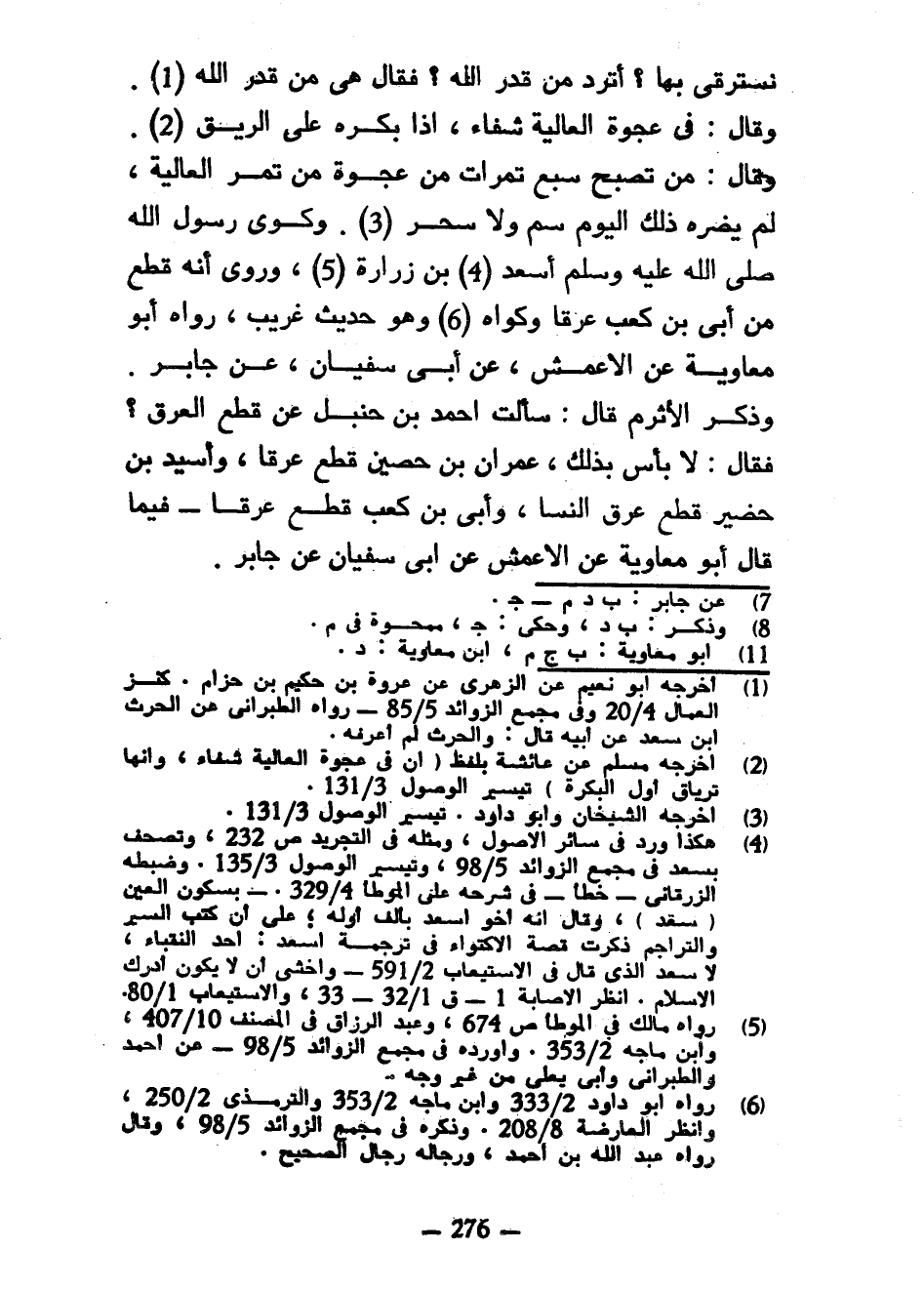 نَسْتَرْقِي بِهَا أَتَرُدُّ مِنْ قَدَرِ اللَّهِ فَقَالَ هِيَ مِنْ قَدَرِ اللَّهِ وَقَالَ فِي عَجْوَةِ الْعَالِيَةِ شِفَاءٌ إِذَا بَكَرَهُ عَلَى الرِّيقِ وَقَالَ مَنْ تَصَبَّحَ سَبْعَ تَمَرَاتٍ مِنْ عَجْوَةٍ مِنْ تَمْرِ الْعَالِيَةِ لَمْ يَضُرَّهُ ذَلِكَ الْيَوْمَ سُمٌّ وَلَا سِحْرٌ وَكَوَى رَسُولُ اللَّهِ صَلَّى اللَّهُ عَلَيْهِ وَسَلَّمَ أَسْعَدَ بْنَ زُرَارَةَ وَرُوِيَ أَنَّهُ قَطَعَ مِنْ أُبَيِّ بْنِ كَعْبٍ عِرْقًا وَكَوَاهُ وَهُوَ حَدِيثٌ غَرِيبٌ رَوَاهُ أَبُو مُعَاوِيَةَ عَنِ الْأَعْمَشِ عَنْ أَبِي سُفْيَانَ عَنْ جَابِرٍ وَذَكَرَ الأثرم قال سألت أحمد بن حنبل عن قَطْعِ الْعِرْقِ فَقَالَ لَا بَأْسَ بِذَلِكَ عِمْرَانُ بْنُ حُصَيْنٍ قَطَعَ عِرْقًا وَأُسِيدُ بْنُ حُضَيْرٍ قطع عرق النساء وَأُبَيُّ بْنُ كَعْبٍ قَطَعَ عِرْقًا فِيمَا قَالَ أَبُو مُعَاوِيَةَ عَنِ الْأَعْمَشِ عَنْ أَبِي سُفْيَانَ عَنْ جَابِرٍ