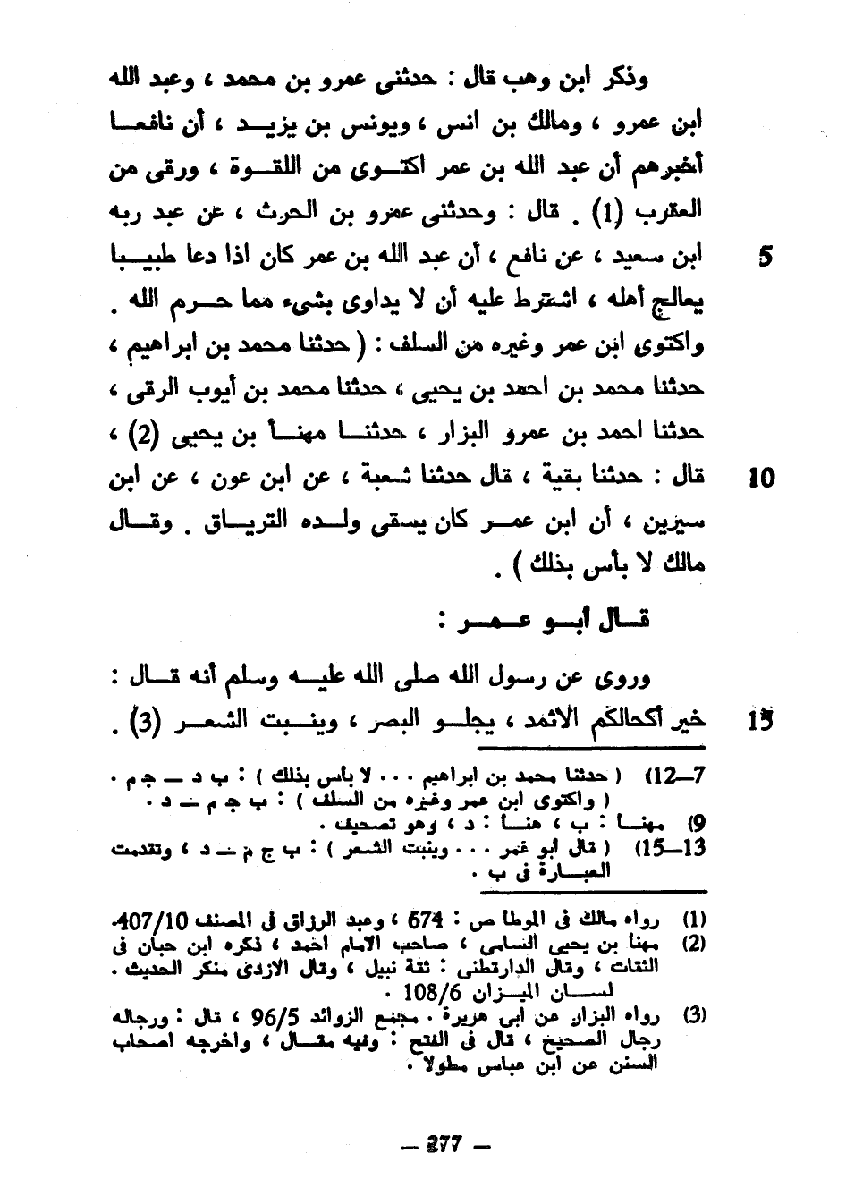 وَذَكَرَ ابْنُ وَهْبٍ قَالَ حَدَّثَنِي عَمْرُو بْنُ مُحَمَّدٍ وَعَبْدُ اللَّهِ بْنُ عَمْرٍو وَمَالِكُ بْنُ أَنَسٍ وَيُونُسُ بْنُ يَزِيدَ أَنَّ نَافِعًا أَخْبَرَهُمْ أَنَّ عَبْدَ اللَّهِ بْنَ عُمَرَ اكْتَوَى مِنَ اللَّقْوَةِ وَرُقِيَ مِنَ الْعَقْرَبِ قَالَ وَحَدَّثَنِي عَمْرُو بن الحرث عَنْ عَبْدِ رَبِّهِ بْنِ سَعِيدٍ عَنْ نَافِعٍ أَنَّ عَبْدَ اللَّهِ بْنَ عُمَرَ كَانَ إِذَا دَعَا طَبِيبًا يُعَالِجُ أَهْلَهُ اشْتَرَطَ عَلَيْهِ أَنْ لَا يُدَاوِيَ بِشَيْءٍ مِمَّا حَرَّمَ اللَّهُ وَاكْتَوَى ابْنُ عُمَرَ وَغَيْرُهُ مِنَ السَّلَفِ (حَدَّثَنَا مُحَمَّدُ بْنُ إِبْرَاهِيمَ حَدَّثَنَا مُحَمَّدُ بْنُ أَحْمَدَ بْنِ يَحْيَى حَدَّثَنَا مُحَمَّدُ بْنُ أَيُّوبَ الرَّقِّيُّ حَدَّثَنَا أَحْمَدُ بْنُ عَمْرٍو الْبَزَّارُ حَدَّثَنَا مُهَنَّأُ بْنُ يَحْيَى (2) قَالَ حَدَّثَنَا بَقِيَّةُ قَالَ حَدَّثَنَا شُعْبَةُ عَنِ ابْنِ عَوْنٍ عَنِ ابْنِ سِيرِينَ أَنَّ ابْنَ عُمَرَ كَانَ يَسْقِي وَلَدَهُ التِّرْيَاقَ وَقَالَ مَالِكٌ لَا بَأْسَ بِذَلِكَ) قَالَ أَبُو عُمَرَ وَرُوِيَ عَنْ رَسُولِ اللَّهِ صَلَّى اللَّهُ عَلَيْهِ وَسَلَّمَ أَنَّهُ قَالَ خَيْرُ أَكْحَالِكُمُ الْإِثْمِدُ يَجْلُو الْبَصَرَ وَيُنْبِتُ الشَّعْرَ