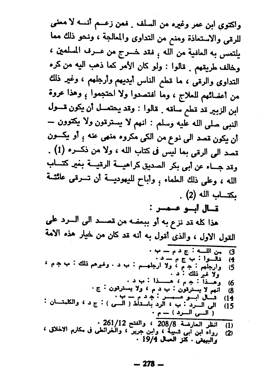 وَاكْتَوَى ابْنُ عُمَرَ وَغَيْرُهُ مِنَ السَّلَفِ فَمَنْ زَعَمَ أَنَّهُ لَا مَعْنَى لِلرُّقَى وَالِاسْتِعَاذَةِ وَمَنَعَ مِنَ التَّدَاوِي وَالْمُعَالَجَةِ وَنَحْوِ ذَلِكَ مِمَّا يُلْتَمَسُ بِهِ الْعَافِيَةُ مِنَ اللَّهِ فَقَدْ خَرَجَ مِنْ عُرْفِ الْمُسْلِمِينَ وَخَالَفَ طَرِيقَهُمْ قَالُوا وَلَوْ كَانَ الْأَمْرُ كَمَا ذَهَبَ إِلَيْهِ مَنْ كَرِهَ التَّدَاوِيَ وَالرُّقَى مَا قَطَعَ النَّاسُ أَيْدِيَهُمْ وَأَرْجُلَهُمْ وَغَيْرَ ذَلِكَ مِنْ أَعْضَائِهِمْ لِلْعِلَاجِ وَمَا افْتَصَدُوا وَلَا احْتَجَمُوا وَهَذَا عُرْوَةُ بْنُ الزُّبَيْرِ قَدْ قَطَعَ سَاقَهُ قَالُوا وَقَدْ يُحْتَمَلُ أَنْ يَكُونَ قَوْلُ النَّبِيِّ صَلَّى اللَّهُ عَلَيْهِ وَسَلَّمَ أَنَّهُمْ لَا يَسْتَرْقُونَ وَلَا يَكْتَوُونَ أَنْ يَكُونَ قَصَدَ إِلَى نَوْعٍ مِنَ الْكَيِّ مَكْرُوهٍ مَنْهِيٍّ عَنْهُ أَوْ يَكُونَ قَصَدَ إِلَى الرُّقَى بِمَا لَيْسَ فِي كِتَابِ اللَّهِ وَلَا مِنْ ذِكْرِهِ وَقَدْ جَاءَ عَنْ أَبِي بَكْرٍ الصِّدِّيقِ كَرَاهِيَةُ الرُّقْيَةِ بِغَيْرِ كِتَابِ اللَّهِ وَعَلَى ذَلِكَ الْعُلَمَاءُ وَأَبَاحَ لِلْيَهُودِيَّةِ أَنْ تَرْقِيَ عَائِشَةَ بِكِتَابِ اللَّهِ قَالَ أَبُو عُمَرَ هَذَا كُلُّهُ قَدْ نَزَعَ بِهِ أَوْ بِبَعْضِهِ مَنْ قَصَدَ إِلَى الرَّدِّ عَلَى الْقَوْلِ الْأَوَّلِ وَالَّذِي أَقُولُ بِهِ أَنَّهُ قَدْ كَانَ مِنْ خِيَارِ هَذِهِ الْأُمَّةِ