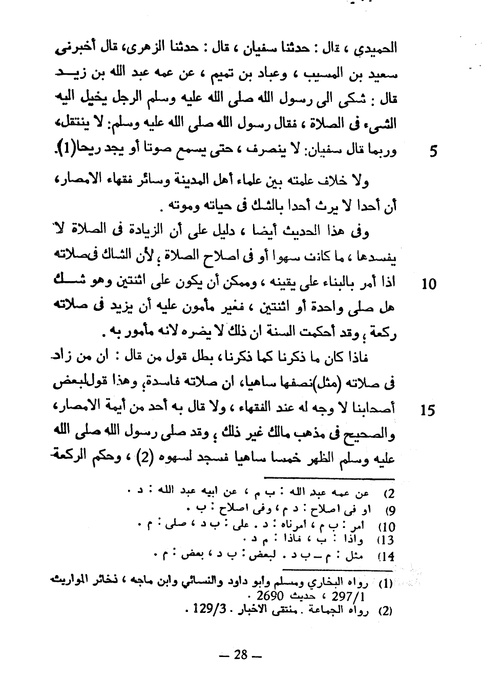 الْحُمَيْديُّ قَالَ حَدَّثَنَا سُفْيَانُ قَالَ حَدَّثَنَا الزُّهْرِيُّ قَالَ أَخْبَرَنِي سَعِيدُ بْنُ الْمُسَيَّبِ وَعَبَّادُ بْنُ تَمِيمٍ عَنْ عَمِّهِ عَبْدِ اللَّهِ بْنِ زَيْدٍ قَالَ شُكِيَ إِلَى رَسُولِ اللَّهِ صَلَّى اللَّهُ عَلَيْهِ وَسَلَّمَ الرَّجُلُ يُخَيَّلُ إِلَيْهِ الشَّيْءُ فِي الصَّلَاةِ فَقَالَ رَسُولُ اللَّهِ صَلَّى اللَّهُ عَلَيْهِ وَسَلَّمَ لَا يَنْتَقِلُ وَرُبَّمَا قَالَ سُفْيَانُ لَا يَنْصَرِفُ حَتَّى يَسْمَعَ صَوْتًا أَوْ يَجِدَ رِيحًا وَلَا خِلَافَ عَلِمْتُهُ بَيْنَ عُلَمَاءِ أَهْلِ الْمَدِينَةِ وَسَائِرِ فُقَهَاءِ الْأَمْصَارِ أَنَّ أَحَدًا لَا يَرِثُ أَحَدًا بِالشَّكِّ فِي حَيَاتِهِ وَمَوْتِهِ وَفِي هَذَا الْحَدِيثِ أَيْضًا دَلِيلٌ عَلَى أَنَّ الزِّيَادَةَ فِي الصَّلَاةِ لَا يُفْسِدُهَا مَا كَانَتْ سَهْوًا أَوْ فِي إِصْلَاحِ الصَّلَاةِ لِأَنَّ الشَّاكَّ فِي صَلَاتِهِ إِذَا أُمِرَ بِالْبِنَاءِ عَلَى يَقِينِهِ وَمُمْكِنٌ أَنْ يَكُونَ عَلَى اثْنَتَيْنِ وَهُوَ شَكَّ هَلْ صَلَّى وَاحِدَةً أَوِ اثْنَتَيْنِ فَغَيْرُ مَأْمُونٍ عَلَيْهِ أَنْ يَزِيدَ فِي صَلَاتِهِ رَكْعَةً وَقَدْ أَحْكَمَتِ السُّنَّةُ أَنَّ ذَلِكَ لَا يَضُرُّهُ لِأَنَّهُ مَأْمُورٌ بِهِ فَإِذَا كَانَ مَا ذَكَرْنَا كَمَا ذَكَرْنَا بَطُلَ قَوْلُ مَنْ قَالَ إِنَّ مَنْ زَادَ فِي صَلَاتِهِ (مِثْلَ) نِصْفِهَا سَاهِيًا أَنَّ صَلَاتَهُ فَاسِدَةٌ وَهَذَا قَوْلٌ لِبَعْضِ أَصْحَابِنَا لَا وَجْهَ لَهُ عِنْدَ الْفُقَهَاءِ وَلَا قَالَ بِهِ أَحَدٌ مِنْ أيمة الْأَمْصَارِ وَالصَّحِيحُ فِي مَذْهَبِ مَالِكٍ غَيْرُ ذَلِكَ وَقَدْ صَلَّى رَسُولُ اللَّهِ صَلَّى اللَّهُ عَلَيْهِ وَسَلَّمَ الظُّهْرَ خَمْسًا سَاهِيًا فَسَجَدَ لِسَهْوِهِ وَحُكْمُ الركعة