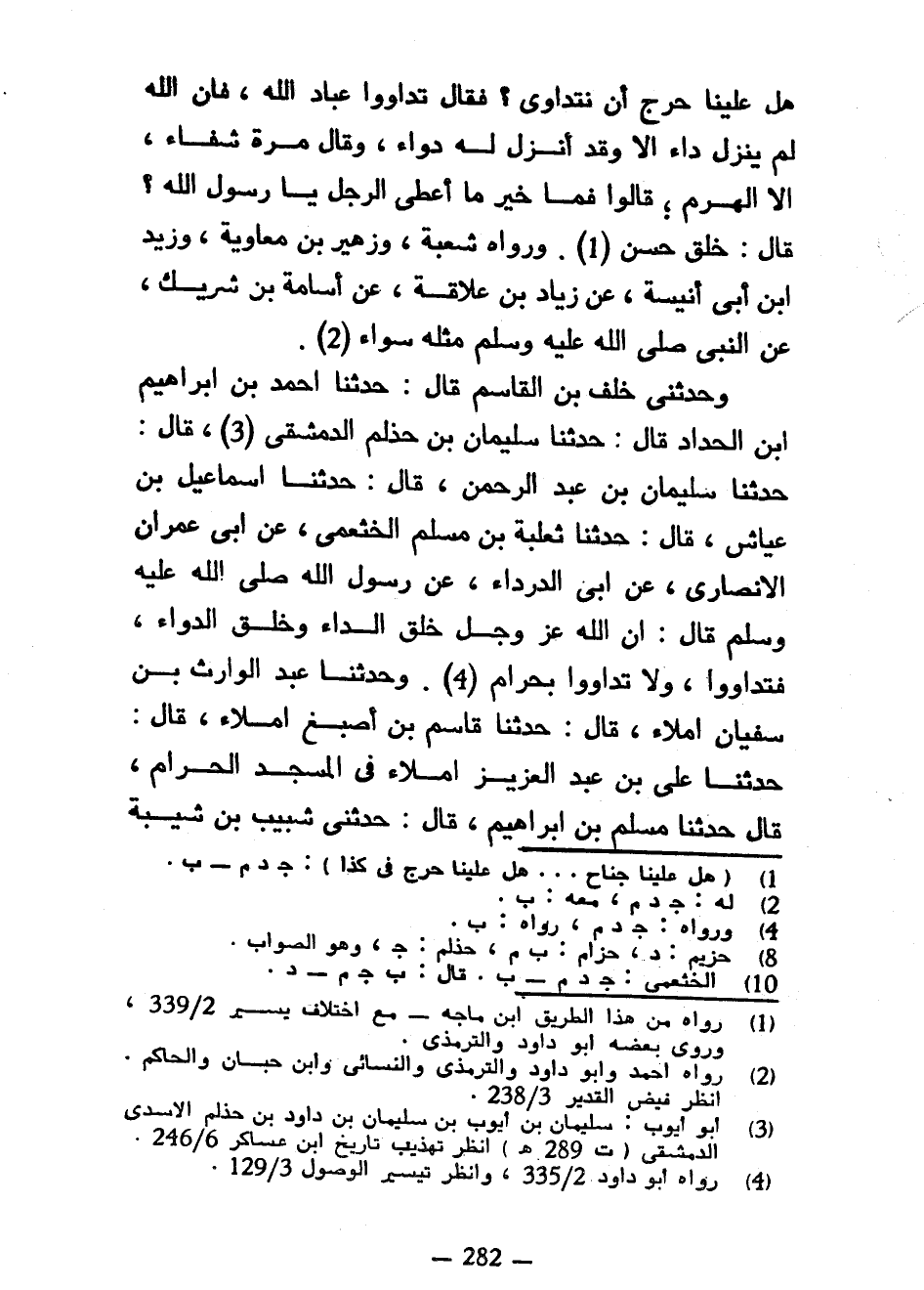 هَلْ عَلَيْنَا حَرَجٌ أَنْ نَتَدَاوَى فَقَالَ تَدَاوَوْا عِبَادَ اللَّهِ فَإِنَّ اللَّهَ لَمْ يُنْزِلْ دَاءً إِلَّا وَقَدْ أَنْزَلَ لَهُ دَوَاءً وَقَالَ مَرَّةً شِفَاءً إِلَّا الْهَرَمَ قَالُوا فَمَا خَيْرُ مَا أُعْطِيَ الرَّجُلُ يَا رَسُولَ اللَّهِ قَالَ خُلُقٌ حَسَنٌ وَرَوَاهُ شُعْبَةُ وَزُهَيْرُ بْنُ مُعَاوِيَةَ وَزَيْدُ بْنُ أَبِي أُنَيْسَةَ عَنْ زِيَادِ بْنِ عِلَاقَةَ عَنْ أُسَامَةِ بْنِ شَرِيكٍ عَنِ النَّبِيِّ صَلَّى اللَّهُ عَلَيْهِ وَسَلَّمَ مِثْلَهُ سَوَاءً وَحَدَّثَنِي خَلَفُ بْنُ الْقَاسِمِ قَالَ حَدَّثَنَا أَحْمَدُ بْنُ إِبْرَاهِيمَ بْنِ الْحَدَّادِ قَالَ حَدَّثَنَا سُلَيْمَانُ بْنُ حَذْلَمَ الدِّمَشْقِيُّ قَالَ حَدَّثَنَا سُلَيْمَانُ بْنُ عَبْدِ الرَّحْمَنِ قَالَ حَدَّثَنَا إِسْمَاعِيلُ بْنُ عَيَّاشٍ قَالَ حَدَّثَنَا ثَعْلَبَةُ بْنُ مُسْلِمٍ الْخَثْعَمِيُّ عَنْ أَبِي عِمْرَانَ الْأَنْصَارِيِّ عَنْ أَبِي الدَّرْدَاءَ عَنْ رَسُولِ اللَّهِ صَلَّى اللَّهُ عَلَيْهِ وَسَلَّمَ قَالَ إِنَّ اللَّهَ عَزَّ وَجَلَّ خَلَقَ الدَّاءَ وَخَلَقَ الدَّوَاءَ فَتَدَاوَوْا وَلَا تَدَاوَوْا بِحَرَامٍ وَحَدَّثَنَا عَبْدُ الْوَارِثِ بْنُ سُفْيَانَ إِمْلَاءً قَالَ حَدَّثَنَا قَاسِمُ بْنُ أَصْبَغَ إِمْلَاءً قَالَ حَدَّثَنَا عَلِيُّ بْنُ عَبْدِ الْعَزِيزِ إِمْلَاءً فِي الْمَسْجِدِ الْحَرَامِ قَالَ حَدَّثَنَا مُسْلِمُ بْنُ إِبْرَاهِيمَ قَالَ حَدَّثَنِي شَبِيبُ بْنُ شَيْبَةَ