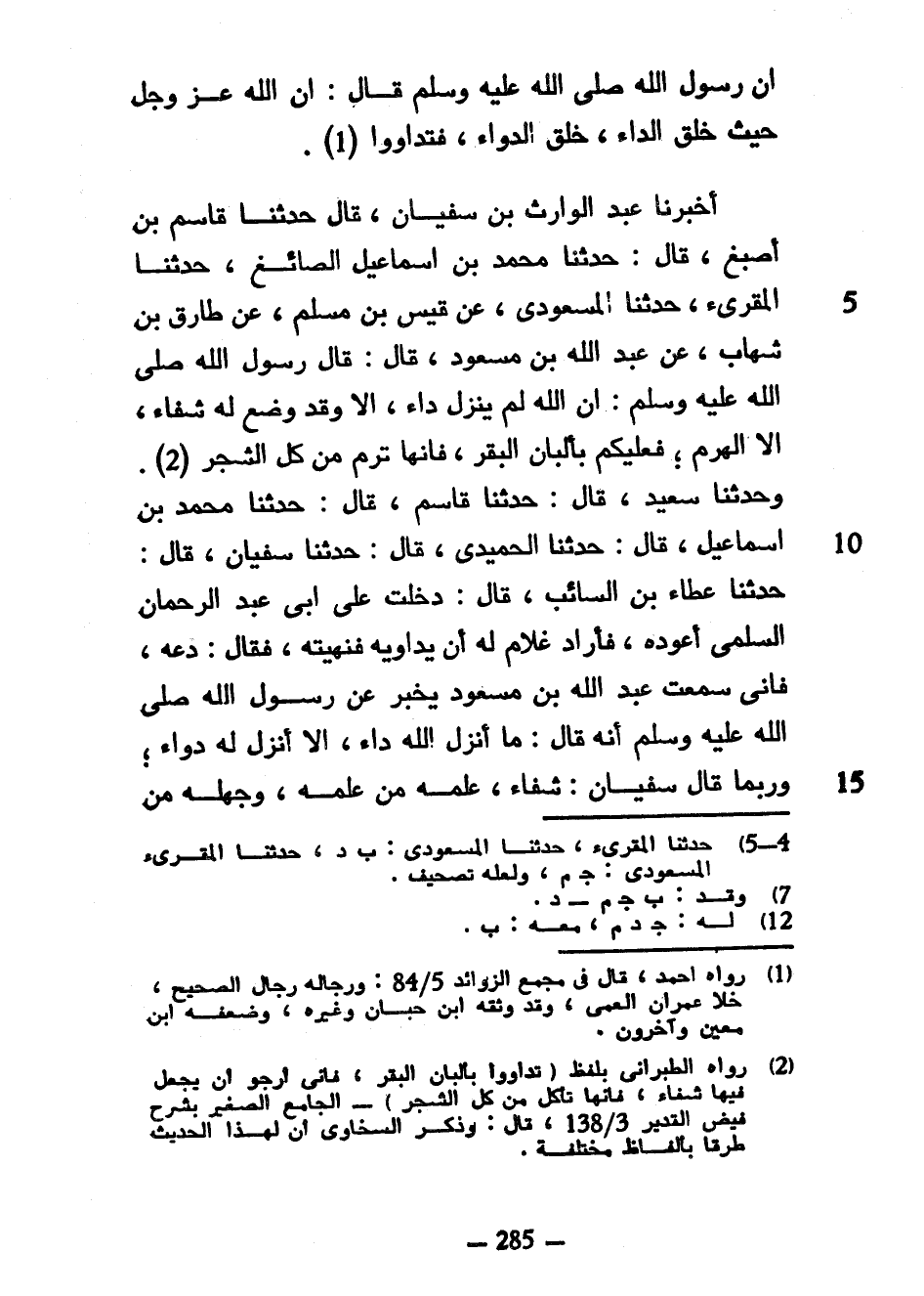 أن رسول الله صلى الله عليه وسلم قَالَ إِنَّ اللَّهَ عَزَّ وَجَلَّ حَيْثُ خَلَقَ الدَّاءَ خَلَقَ الدَّوَاءَ فَتَدَاوَوْا أَخْبَرَنَا عَبْدُ الْوَارِثِ بْنُ سُفْيَانَ قَالَ حَدَّثَنَا قَاسِمُ بْنُ أَصْبَغَ قَالَ حَدَّثَنَا مُحَمَّدُ بْنُ إِسْمَاعِيلَ الصَّائِغُ حَدَّثَنَا المقرىء حَدَّثَنَا الْمَسْعُودِيُّ عَنْ قَيْسِ بْنِ مُسْلِمٍ عَنْ طَارِقِ بْنِ شِهَابٍ عَنْ عَبْدِ اللَّهِ بْنِ مَسْعُودٍ قَالَ قَالَ رَسُولُ اللَّهِ صَلَّى اللَّهُ عَلَيْهِ وَسَلَّمَ إِنَّ اللَّهَ لَمْ يُنْزِلْ دَاءً إِلَّا وَقَدْ وَضَعَ لَهُ شِفَاءً إِلَّا الْهَرَمَ فَعَلَيْكُمْ بِأَلْبَانِ الْبَقَرِ فَإِنَّهَا تَرُمُّ مِنْ كُلِّ الشَّجَرِ وَحَدَّثَنَا سَعِيدٌ قَالَ حَدَّثَنَا قَاسِمٌ قَالَ حَدَّثَنَا مُحَمَّدُ بْنُ إسماعيل قال حدثناالحميدي قَالَ حَدَّثَنَا سُفْيَانُ قَالَ حَدَّثَنَا عَطَاءُ بْنُ السَّائِبِ قَالَ دَخَلْتُ عَلَى أَبِي عَبْدِ الرَّحْمَنِ السُّلَمِيِّ أَعُودُهُ فَأَرَادَ غُلَامٌ لَهُ أَنْ يُدَاوِيَهُ فَنَهَيْتُهُ فَقَالَ دَعْهُ فَإِنِّي سَمِعْتُ عَبْدَ اللَّهِ بْنَ مَسْعُودٍ يُخْبِرُ عَنْ رَسُولِ اللَّهِ صَلَّى اللَّهُ عَلَيْهِ وَسَلَّمَ أَنَّهُ قَالَ مَا أَنْزَلَ اللَّهُ دَاءً إِلَّا أَنْزَلَ لَهُ دَوَاءً وَرُبَّمَا قَالَ سُفْيَانُ شِفَاءً عَلِمَهُ مَنْ عَلِمَهُ وَجَهِلَهُ من
