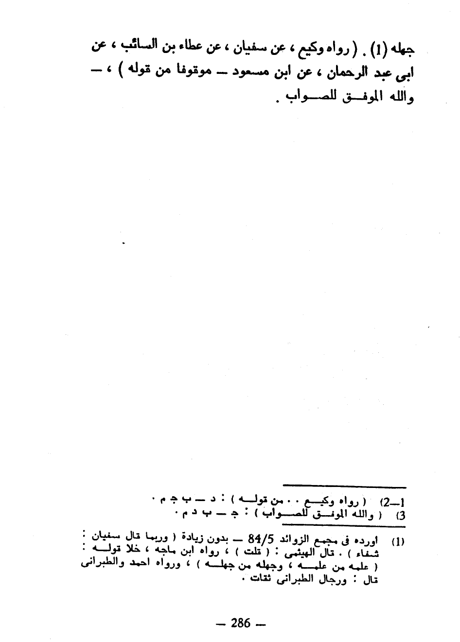جَهِلَهُ (رَوَاهُ وَكِيعٌ عَنْ سُفْيَانَ عَنْ عَطَاءِ بْنِ السَّائِبِ عَنْ أَبِي عَبْدِ الرَّحْمَنِ عَنِ ابْنِ مَسْعُودٍ مَوْقُوفًا مِنْ قَوْلِهِ) وَاللَّهُ الْمُوَفِّقُ للصواب