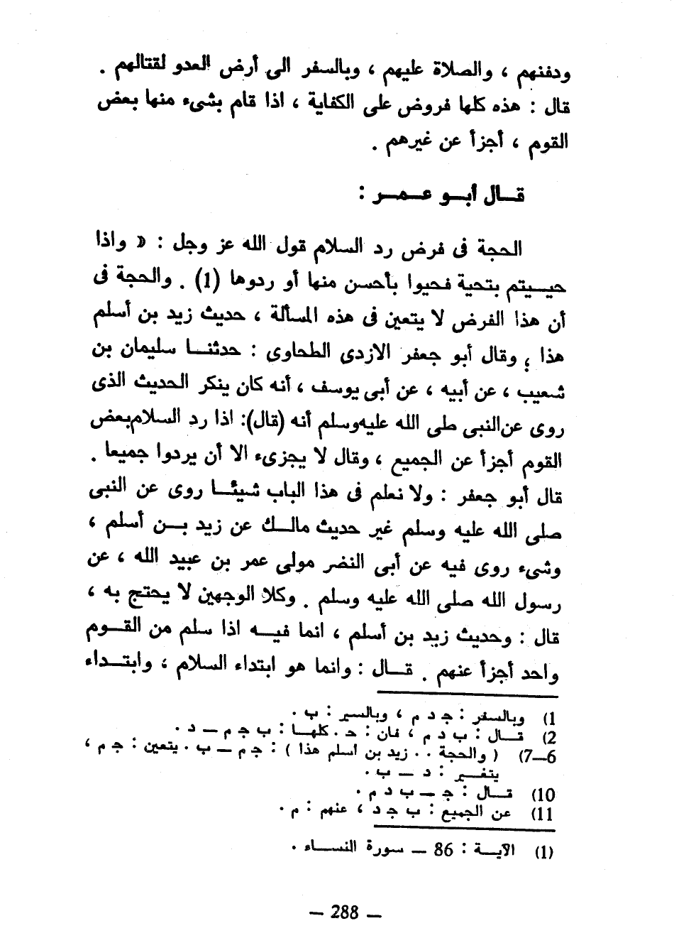 وَدَفْنِهِمْ وَالصَّلَاةِ عَلَيْهِمْ وَبِالسَّفَرِ إِلَى أَرْضِ الْعَدُوِّ لِقِتَالِهِمْ قَالَ هَذِهِ كُلُّهَا فُرُوضٌ عَلَى الْكِفَايَةِ إِذَا قَامَ بِشَيْءٍ مِنْهَا بَعْضُ الْقَوْمِ أَجْزَأَ عَنْ غَيْرِهِمْ قَالَ أَبُو عُمَرَ الْحُجَّةُ فِي فَرْضِ رَدِّ السَّلَامِ قَوْلُ اللَّهِ عَزَّ وَجَلَّ وَإِذَا حُيِّيتُمْ بِتَحِيَّةٍ فَحَيُّوا بِأَحْسَنَ مِنْهَا أَوْ رُدُّوهَا وَالْحُجَّةُ فِي أَنَّ هَذَا الْفَرْضَ لَا يَتَعَيَّنُ فِي هَذِهِ الْمَسْأَلَةِ حَدِيثُ زَيْدِ بْنِ أَسْلَمَ هَذَا وَقَالَ أَبُو جَعْفَرٍ الْأَزْدِيُّ الطَّحَاوِيُّ حَدَّثَنَا سُلَيْمَانُ بْنُ شُعَيْبٍ عَنْ أَبِيهِ عَنْ أَبِي يُوسُفَ أَنَّهُ كَانَ يُنْكِرُ الْحَدِيثَ الَّذِي رُوِيَ عَنِ النَّبِيِّ صَلَّى اللَّهُ عَلَيْهِ وَسَلَّمَ أَنَّهُ (قَالَ) إِذَا رَدَّ السَّلَامَ بَعْضُ الْقَوْمِ أجزأ عن الجميع وقال لا يجزىء إِلَّا أَنْ يَرُدُّوا جَمِيعًا قَالَ أَبُو جَعْفَرٍ وَلَا نَعْلَمُ فِي هَذَا الْبَابِ شَيْئًا رُوِيَ عَنِ النَّبِيِّ صَلَّى اللَّهُ عَلَيْهِ وَسَلَّمَ غَيْرَ حَدِيثِ مَالِكٍ عَنْ زَيْدِ بْنِ أَسْلَمَ وَشَيْءٌ رُوِيَ فِيهِ عَنْ أَبِي النَّضْرِ مَوْلَى عُمَرَ بْنِ عُبَيْدِ اللَّهِ عَنْ رَسُولِ اللَّهِ صَلَّى اللَّهُ عَلَيْهِ وَسَلَّمَ وَكِلَا الْوَجْهَيْنِ لَا يُحْتَجُّ بِهِ قَالَ وَحَدِيثُ زَيْدِ بْنِ أَسْلَمَ إِنَّمَا فِيهِ إِذَا سَلَّمَ مِنَ الْقَوْمِ وَاحِدٌ أَجْزَأَ عَنْهُمْ قَالَ وَإِنَّمَا هُوَ ابْتِدَاءُ السَّلَامِ وَابْتِدَاءُ