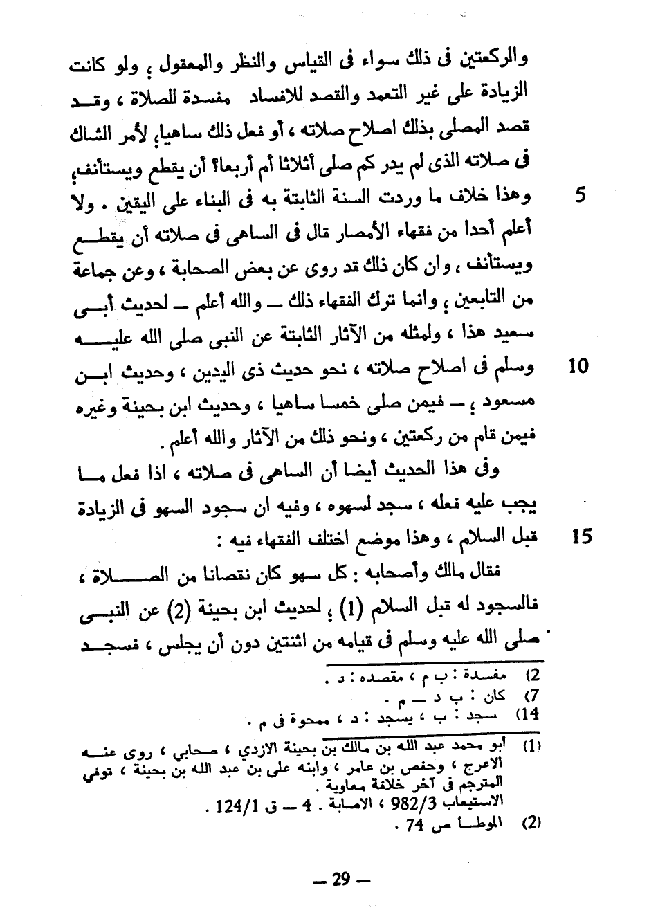 وَالرَّكْعَتَيْنِ فِي ذَلِكَ سَوَاءٌ فِي الْقِيَاسِ وَالنَّظَرِ وَالْمَعْقُولِ وَلَوْ كَانَتِ الزِّيَادَةُ عَلَى غَيْرِ التَّعَمُّدِ وَالْقَصْدِ لِلْإِفْسَادِ مُفْسِدَةً لِلصَّلَاةِ وَقَدْ قَصَدَ الْمُصَلِّي بِذَلِكَ إِصْلَاحَ صَلَاتِهِ أَوْ فَعَلَ ذَلِكَ سَاهِيًا لِأَمْرِ الشَّاكِّ فِي صَلَاتِهِ الَّذِي لَمْ يَدْرِ كَمْ صَلَّى أَثَلَاثًا أَمْ أَرْبَعًا أَنْ يَقْطَعَ وَيَسْتَأْنِفَ وَهَذَا خِلَافُ مَا وَرَدَتِ السُّنَّةُ الثَّابِتَةُ بِهِ فِي الْبِنَاءِ عَلَى الْيَقِينِ وَلَا أَعْلَمُ أَحَدًا مِنْ فُقَهَاءِ الْأَمْصَارِ قَالَ فِي السَّاهِي فِي صَلَاتِهِ أَنْ يَقْطَعَ وَيَسْتَأْنِفَ وَإِنْ كَانَ ذَلِكَ قَدْ رُوِيَ عَنْ بَعْضِ الصَّحَابَةِ وَعَنْ جَمَاعَةٍ مِنَ التَّابِعِينَ وَإِنَّمَا تَرَكَ الْفُقَهَاءُ ذَلِكَ وَاللَّهُ أَعْلَمُ لِحَدِيثِ أَبِي سَعِيدٍ هَذَا وَلِمِثْلِهِ مِنَ الْآثَارِ الثَّابِتَةِ عَنِ النَّبِيِّ صَلَّى اللَّهُ عَلَيْهِ وَسَلَّمَ فِي إِصْلَاحِ صَلَاتِهِ نَحْوِ حَدِيثِ ذِي الْيَدَيْنِ وَحَدِيثِ ابْنِ مَسْعُودٍ فِيمَنْ صَلَّى خَمْسًا سَاهِيًا وَحَدِيثِ ابْنِ بُحَيْنَةَ وَغَيْرِهِ فِيمَنْ قَامَ مِنْ رَكْعَتَيْنِ وَنَحْوِ ذَلِكَ مِنَ الْآثَارِ وَاللَّهُ أَعْلَمُ وَفِي هَذَا الْحَدِيثِ أَيْضًا أَنَّ السَّاهِيَ فِي صَلَاتِهِ إِذَا فَعَلَ مَا يَجِبُ عَلَيْهِ فِعْلُهُ سَجَدَ لِسَهْوِهِ وَفِيهِ أَنَّ سُجُودَ السَّهْوِ فِي الزِّيَادَةِ قَبْلَ السَّلَامِ وَهَذَا مَوْضِعٌ اخْتَلَفَ الْفُقَهَاءُ فِيهِ فَقَالَ مَالِكٌ وَأَصْحَابُهُ كُلُّ سَهْوٍ كَانَ نُقْصَانًا مِنَ الصَّلَاةِ فَالسُّجُودُ لَهُ قَبْلَ السَّلَامِ لِحَدِيثِ ابْنِ بُحَيْنَةَ عَنِ النَّبِيِّ صَلَّى اللَّهُ عَلَيْهِ وَسَلَّمَ فِي قِيَامِهِ مِنِ اثْنَتَيْنِ دُونَ أَنْ يَجْلِسَ فَسَجَدَ