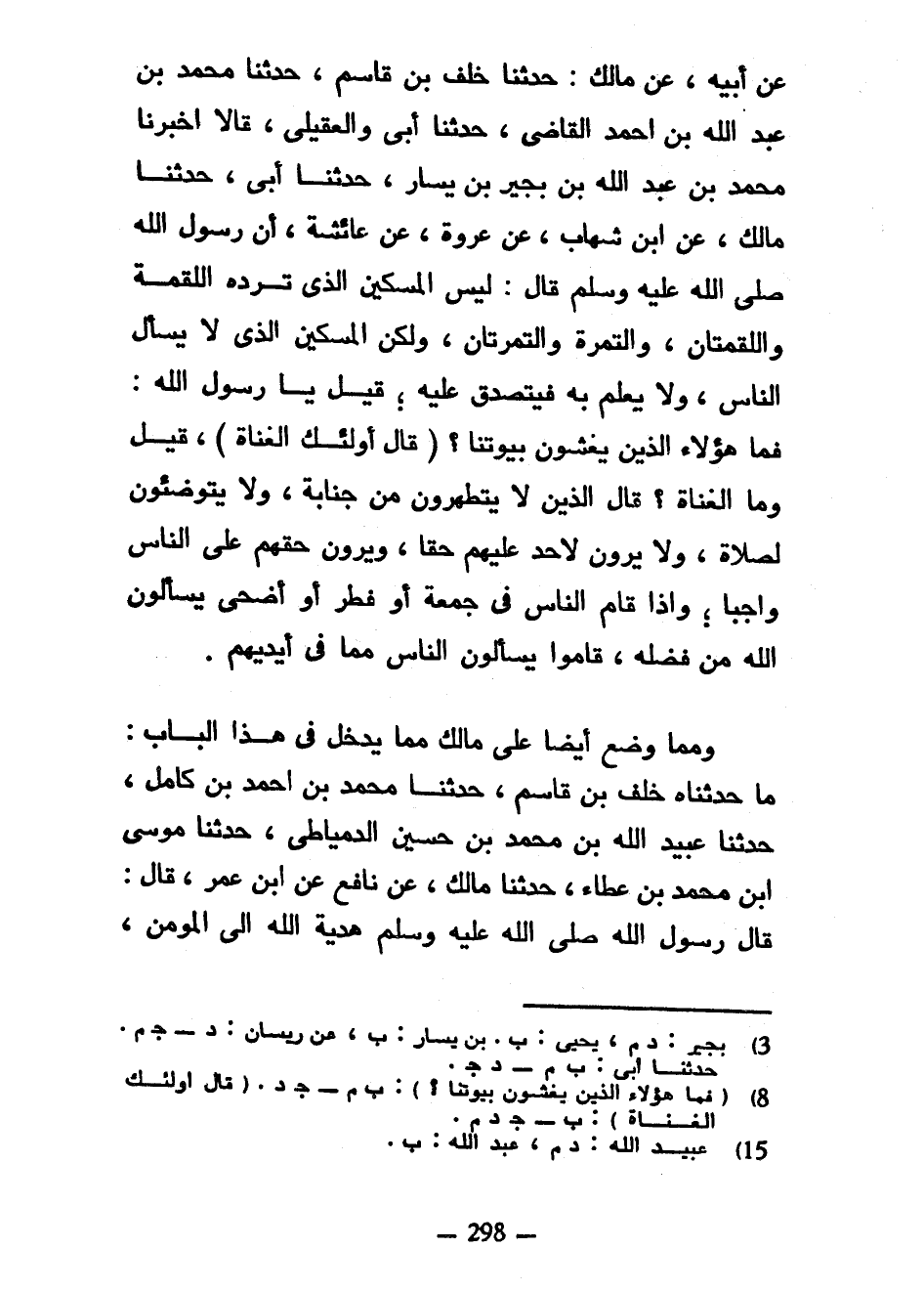 عَنْ أَبِيهِ عَنْ مَالِكٍ حَدَّثَنَا خَلَفُ بْنُ قَاسِمٍ حَدَّثَنَا مُحَمَّدُ بْنُ عَبْدِ اللَّهِ بْنِ أَحْمَدَ الْقَاضِي حَدَّثَنَا أَبِي وَالْعُقَيْلِيُّ قَالَا أَخْبَرَنَا مُحَمَّدُ بْنُ عَبْدِ اللَّهِ بْنُ بُجَيْرِ بْنِ يَسَارٍ حَدَّثَنَا أَبِي حَدَّثَنَا مَالِكٌ عَنِ ابْنِ شِهَابٍ عَنْ عُرْوَةَ عَنْ عَائِشَةَ أَنَّ رَسُولَ اللَّهِ صَلَّى اللَّهُ عَلَيْهِ وَسَلَّمَ قَالَ لَيْسَ الْمِسْكِينُ الَّذِي تَرُدُّهُ اللُّقْمَةُ وَاللُّقْمَتَانِ وَالتَّمْرَةُ وَالتَّمْرَتَانِ وَلَكِنَّ الْمِسْكِينَ الَّذِي لَا يَسْأَلُ النَّاسَ وَلَا يُعْلَمُ بِهِ فَيُتَصَدَّقُ عَلَيْهِ قِيلَ يَا رَسُولَ اللَّهِ فَمَا هَؤُلَاءِ الَّذِينَ يَغْشُونَ بُيُوتَنَا (قَالَ أُولَئِكَ الْغُنَاةُ) قِيلَ وَمَا الْغُنَاةُ قَالَ الَّذِينَ لَا يَتَطَهَّرُونَ مِنْ جَنَابَةٍ وَلَا يَتَوَضَّئُونَ لِصَلَاةٍ ولا يرون لأحد عليم حَقًّا وَيُرُونَ حَقَّهُمْ عَلَى النَّاسِ وَاجِبًا وَإِذَا قَامَ النَّاسُ فِي جُمُعَةٍ أَوْ فِطْرٍ أَوْ أَضْحَى يَسْأَلُونَ اللَّهَ مِنْ فَضْلِهِ قَامُوا يَسْأَلُونَ النَّاسَ مِمَّا فِي أَيْدِيهِمْ وَمِمَّا وُضِعَ أَيْضًا عَلَى مَالِكٍ مِمَّا يَدْخُلُ فِي هَذَا الْبَابِ مَا حَدَّثَنَاهُ خَلَفُ بْنُ قَاسِمٍ حَدَّثَنَا مُحَمَّدُ بْنُ أَحْمَدَ بْنِ كَامِلٍ حَدَّثَنَا عُبَيْدُ اللَّهِ بْنُ مُحَمَّدِ بْنِ حُسَيْنٍ الدِّمْيَاطِيُّ حَدَّثَنَا مُوسَى ابن مُحَمَّدِ بْنِ عَطَاءٍ حَدَّثَنَا مَالِكٌ عَنْ نَافِعٍ عَنِ ابْنِ عُمَرَ قَالَ قَالَ رَسُولُ اللَّهِ صَلَّى اللَّهُ عَلَيْهِ وَسَلَّمَ هَدِيَّةُ اللَّهِ إِلَى المومن