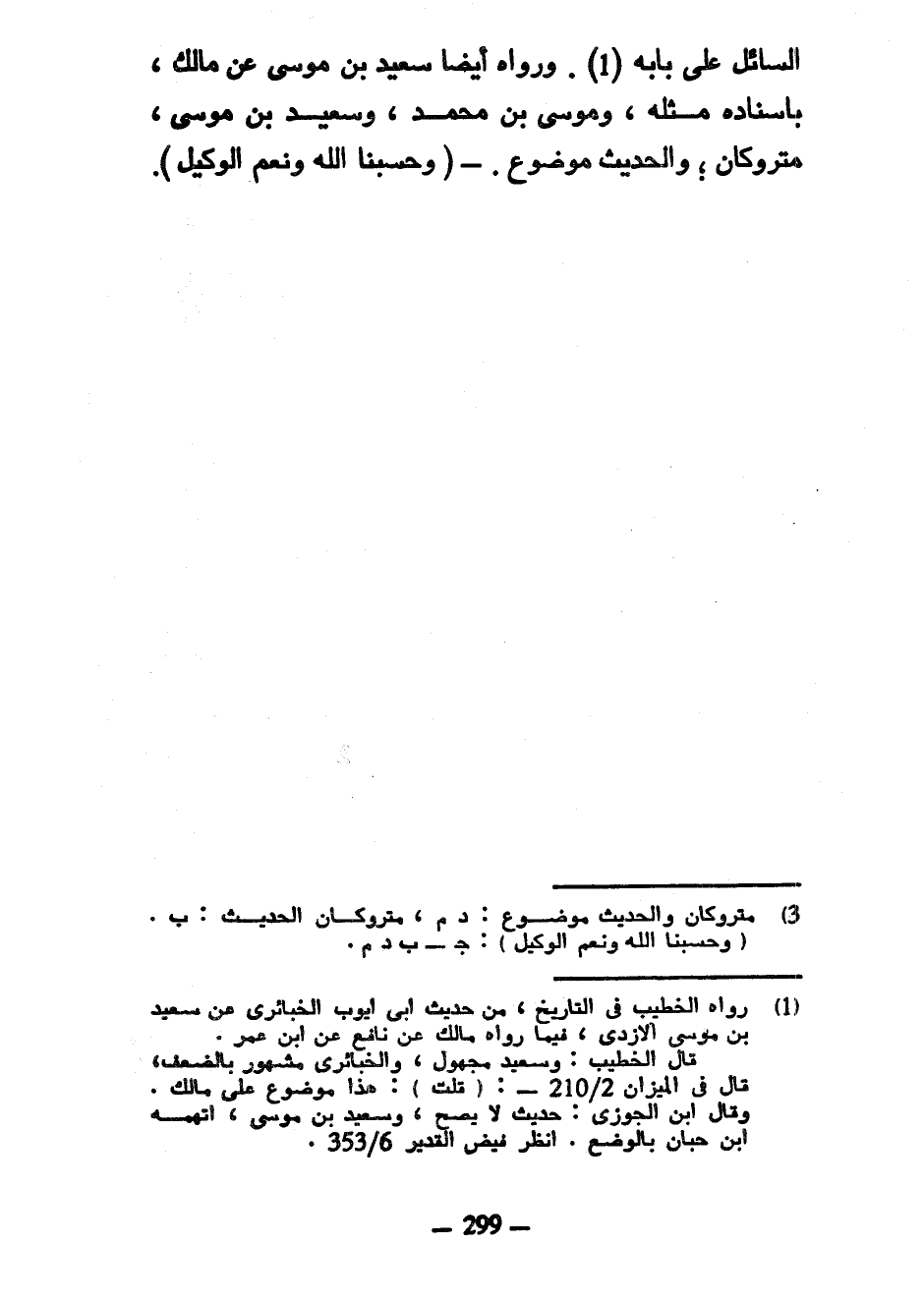 السَّائِلُ عَلَى بَابِهِ وَرَوَاهُ أَيْضًا سَعِيدُ بْنُ مُوسَى عَنْ مَالِكٍ بِإِسْنَادِهِ مِثْلَهُ وَمُوسَى بْنُ مُحَمَّدٍ وَسَعِيدُ بْنُ مُوسَى مَتْرُوكَانِ وَالْحَدِيثُ مَوْضُوعٌ (وَحَسْبُنَا اللَّهُ وَنِعْمَ الْوَكِيلُ)