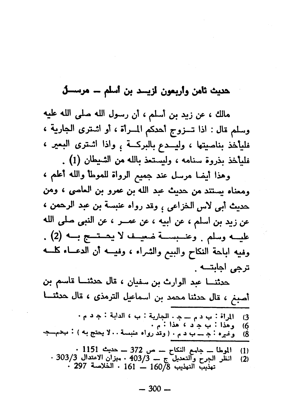 حَدِيثٌ ثَامِنٌ وَأَرْبَعُونَ لِزَيْدِ بْنِ أَسْلَمَ مُرْسَلٌ مَالِكٌ عَنْ زَيْدِ بْنِ أَسْلَمَ أَنَّ رَسُولَ اللَّهِ صَلَّى اللَّهُ عَلَيْهِ وَسَلَّمَ قَالَ إِذَا تَزَوَّجَ أَحَدُكُمُ الْمَرْأَةَ أَوِ اشْتَرَى الْجَارِيَةَ فَلْيَأْخُذْ بِنَاصِيَتِهَا وَلْيَدْعُ بِالْبَرَكَةِ وَإِذَا اشْتَرَى الْبَعِيرَ فَلْيَأْخُذْ بِذِرْوَةِ سَنَامِهِ وَلْيَسْتَعِذْ بِاللَّهِ مِنَ الشَّيْطَانِ وَهَذَا أَيْضًا مُرْسَلٌ عِنْدَ جَمِيعِ الرُّوَاةِ لِلْمُوَطَّأِ وَاللَّهُ أَعْلَمُ وَمَعْنَاهُ يَسْتَنِدُ مِنْ حَدِيثِ عَبْدِ اللَّهِ بْنِ عَمْرِو بْنِ الْعَاصِي وَمِنْ حَدِيثِ أَبِي لَاسٍّ الْخُزَاعِيِّ وَقَدْ رَوَاهُ عَنْبَسَةُ بْنُ عَبْدِ الرَّحْمَنِ عَنْ زَيْدِ بْنِ أَسْلَمَ عَنْ أَبِيهِ عَنْ عُمَرَ عَنِ النَّبِيِّ صَلَّى اللَّهُ عَلَيْهِ وَسَلَّمَ وَعَنْبَسَةُ ضَعِيفٌ لَا يُحْتَجُّ بِهِ وَفِيهِ إِبَاحَةُ النِّكَاحِ وَالْبَيْعِ وَالشِّرَاءِ وَفِيهِ أَنَّ الدُّعَاءَ كُلَّهُ تُرْجَى إِجَابَتُهِ حَدَّثَنَا عَبْدُ الْوَارِثِ بْنُ سُفْيَانَ قَالَ حَدَّثَنَا قَاسِمُ بْنُ أَصْبَغَ قَالَ حَدَّثَنَا مُحَمَّدُ بْنُ إِسْمَاعِيلَ التِّرْمِذِيُّ قَالَ حَدَّثَنَا
