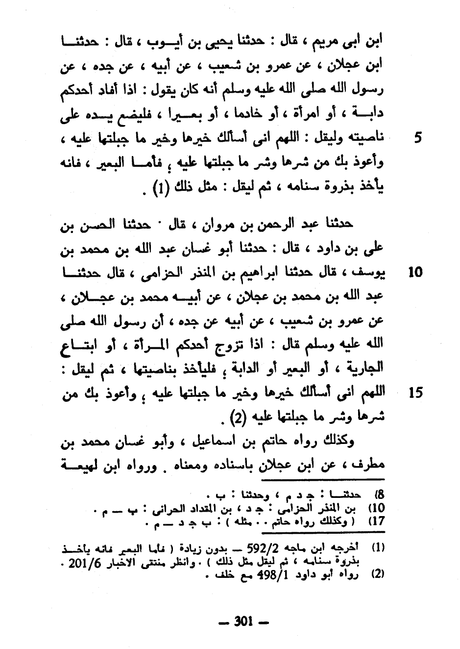 ابْنُ أَبِي مَرْيَمَ قَالَ حَدَّثَنَا يَحْيَى بْنُ أَيُّوبَ قَالَ حَدَّثَنَا ابْنُ عَجْلَانَ عَنْ عَمْرِو بْنِ شُعَيْبٍ عَنْ أَبِيهِ عَنْ جَدِّهِ عَنْ رَسُولِ اللَّهِ صَلَّى اللَّهُ عَلَيْهِ وَسَلَّمَ أنه كَانَ يَقُولُ إِذَا أَفَادَ أَحَدُكُمْ دَابَّةً أَوِ امرأة أو خادما أو بعيرا فَلْيَضَعْ يَدَهُ عَلَى نَاصِيَتِهِ وَلْيَقُلِ اللَّهُمَّ إِنِّي أَسْأَلُكَ خَيْرَهَا وَخَيْرَ مَا جَبَلْتَهَا عَلَيْهِ وَأَعُوذُ بك من شرها ومن شر مَا جَبَلْتَهَا عَلَيْهِ فَأَمَّا الْبَعِيرُ فَإِنَّهُ يَأْخُذُ بِذِرْوَةِ سَنَامِهِ ثُمَّ لِيَقُلْ مِثْلَ ذَلِكَ حَدَّثَنَا عَبْدُ الرَّحْمَنِ بْنُ مَرْوَانَ قَالَ حَدَّثَنَا الْحَسَنُ بْنُ عَلِيِّ بْنِ دَاوُدَ قَالَ حَدَّثَنَا أَبُو غَسَّانَ عَبْدُ اللَّهِ بْنُ مُحَمَّدِ بْنِ يُوسُفَ قَالَ حَدَّثَنَا إِبْرَاهِيمُ بْنُ الْمُنْذِرِ الْحَزَّامِيُّ قَالَ حَدَّثَنَا عَبْدُ اللَّهِ بْنُ مُحَمَّدِ بْنِ عَجْلَانَ عَنْ أَبِيهِ مُحَمَّدِ بْنِ عَجْلَانَ عَنْ عَمْرِو بْنِ شُعَيْبٍ عَنْ أَبِيهِ عَنْ جَدِّهِ أَنَّ رَسُولَ اللَّهِ صَلَّى اللَّهُ عَلَيْهِ وَسَلَّمَ قَالَ إِذَا تَزَوَّجَ أَحَدُكُمُ الْمَرْأَةَ أَوِ ابْتَاعَ الْجَارِيَةَ أَوِ الْبَعِيرَ أَوِ الدَّابَّةَ فَلْيَأْخُذْ بِنَاصِيَتِهَا ثُمَّ لِيَقُلِ اللَّهُمَّ إِنِّي أَسْأَلُكَ خَيْرَهَا وَخَيْرَ مَا جبلتها عليه وأعوذ بك من شرها ومن وَشَرِّ مَا جَبَلْتَهَا عَلَيْهِ وَكَذَلِكَ رَوَاهُ حَاتِمُ بْنُ إِسْمَاعِيلَ وَأَبُو غَسَّانَ مُحَمَّدُ بْنُ مُطَرِّفٍ عَنِ ابْنِ عَجْلَانَ بِإِسْنَادِهِ وَمَعْنَاهُ وَرَوَاهُ ابْنُ لهيعة