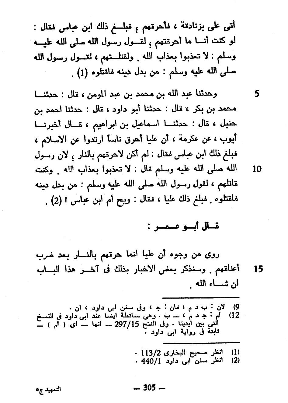 أَتَى عَلِيٌّ بِزَنَادِقَةٍ فَأَحْرَقَهُمْ فَبَلَغَ ذَلِكَ ابْنَ عَبَّاسٍ فَقَالَ لَوْ كُنْتُ أَنَا مَا أَحْرَقْتُهُمْ لِقَوْلِ رَسُولِ اللَّهِ صَلَّى اللَّهُ عَلَيْهِ وَسَلَّمَ لَا تُعَذِّبُوا بِعَذَابِ اللَّهِ وَلَقَتَلْتُهُمْ لِقَوْلِ رَسُولِ اللَّهِ صَلَّى اللَّهُ عَلَيْهِ وَسَلَّمَ من بدل دِينَهُ فَاقْتُلُوهُ وَحَدَّثَنَا عَبْدُ اللَّهِ بْنُ مُحَمَّدِ بْنِ عَبْدِ الْمُومِنِ قَالَ حَدَّثَنَا مُحَمَّدُ بْنُ بَكْرٍ قَالَ حَدَّثَنَا أَبُو دَاوُدَ قَالَ حَدَّثَنَا أَحْمَدُ بْنُ حَنْبَلٍ قَالَ حَدَّثَنَا إِسْمَاعِيلُ بْنُ إِبْرَاهِيمَ قَالَ أَخْبَرَنَا أَيُّوبُ عَنْ عِكْرِمَةَ أَنَّ عَلِيًّا أَحْرَقَ نَاسًا ارْتَدُّوا عَنِ الْإِسْلَامِ فَبَلَغَ ذَلِكَ ابْنَ عَبَّاسٍ فَقَالَ لَمْ أَكُنْ لِأَحْرِقُهُمْ بِالنَّارِ لِأَنَّ رَسُولَ اللَّهِ صَلَّى اللَّهُ عَلَيْهِ وَسَلَّمَ قَالَ لَا تُعَذِّبُوا بِعَذَابِ اللَّهِ وَكُنْتُ قَاتِلَهُمْ لِقَوْلِ رَسُولِ اللَّهِ صَلَّى اللَّهُ عَلَيْهِ وَسَلَّمَ مَنْ بَدَّلَ دِينَهُ فَاقْتُلُوهُ فَبَلَغَ ذَلِكَ عَلِيًّا فَقَالَ وَيْحَ أُمِّ ابْنِ عَبَّاسٍ قَالَ أَبُو عُمَرَ رُوِيَ مِنْ وُجُوهٍ أَنَّ عَلِيًّا إِنَّمَا حَرَّقَهُمْ بِالنَّارِ بَعْدَ ضَرْبِ أَعْنَاقِهِمْ وَسَنَذْكُرُ بَعْضَ الْأَخْبَارِ بِذَلِكَ فِي آخِرِ هَذَا الْبَابِ إِنْ شَاءَ اللَّهُ