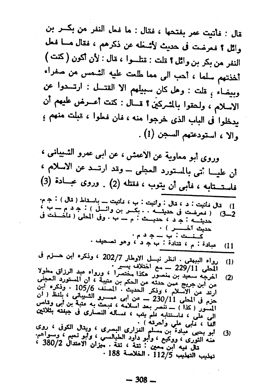 قَالَ فَأَتَيْتُ عُمَرَ بِفَتْحِهَا فَقَالَ مَا فَعَلَ النَّفَرُ مِنْ بَكْرِ بْنِ وَائِلٍ فَعَرَضْتُ فِي حَدِيثٍ لِأَشْغَلَهُ عَنْ ذِكْرِهِمْ فَقَالَ مَا فَعَلَ النَّفَرُ مِنْ بَكْرِ بْنِ وَائِلٍ قُلْتُ قُتِلُوا قَالَ لَأَنْ أَكُونَ (كُنْتُ) أَخَذْتُهُمْ سِلْمًا أَحَبُّ إِلَيَّ مِمَّا طَلَعَتْ عَلَيْهِ الشَّمْسُ مِنْ صَفْرَاءَ وَبَيْضَاءَ قُلْتُ وَهَلْ كَانَ سَبِيلَهُمْ إِلَّا الْقَتْلُ ارْتَدُّوا عَنِ الْإِسْلَامِ وَلَحِقُوا بِالْمُشْرِكِينَ قَالَ كُنْتُ أَعْرِضُ عَلَيْهِمْ أَنْ يَدْخُلُوا فِي الْبَابِ الَّذِي خَرَجُوا مِنْهُ فَإِنْ فَعَلُوا قَبِلْتُ مِنْهُمْ وَإِلَّا اسْتَوْدَعْتُهُمُ السِّجْنَ وَرَوَى أَبُو مُعَاوِيَةَ عَنِ الْأَعْمَشِ عَنْ أَبِي عَمْرٍو الشَّيْبَانِيِّ أَنَّ عَلِيًّا أَتَى بِالْمُسْتَوْرِدِ الْعِجْلِيِّ وَقَدِ ارْتَدَّ عَنِ الْإِسْلَامِ فَاسْتَتَابَهُ فَأَبَى أَنْ يَتُوبَ فَقَتَلَهُ وَرَوَى عُبَادَةُ