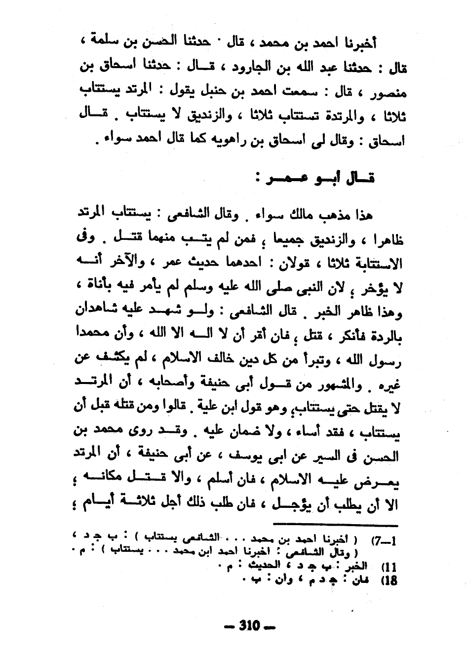 أَخْبَرَنَا أَحْمَدُ بْنُ مُحَمَّدٍ قَالَ حَدَّثَنَا الْحَسَنُ بْنُ سَلَمَةَ حَدَّثَنَا عَبْدُ اللَّهِ بْنُ الْجَارُودِ قَالَ حَدَّثَنَا إسحاق بن قَالَ سَمِعْتُ أَحْمَدَ بْنَ حَنْبَلٍ يَقُولُ الْمُرْتَدُّ يُسْتَتَابُ ثَلَاثًا وَالْمُرْتَدَّةُ تُسْتَتَابُ ثَلَاثًا وَالزِّنْدِيقُ لَا يُسْتَتَابُ قَالَ إِسْحَاقُ وَقَالَ لِي إِسْحَاقُ بْنُ رَاهَوَيْهِ كَمَا قَالَ أَحْمَدُ سَوَاءٌ قَالَ أَبُو عُمَرَ هَذَا مَذْهَبُ مَالِكٍ سَوَاءٌ وَقَالَ الشَّافِعِيُّ يُسْتَتَابُ الْمُرْتَدُّ ظَاهِرًا وَالزِّنْدِيقُ جَمِيعًا فَمَنْ لَمْ يَتُبْ مِنْهُمَا قُتِلَ وَفِي الِاسْتِتَابَةِ ثَلَاثًا قَوْلَانِ أَحَدُهُمَا حَدِيثُ عُمَرَ وَالْآخِرُ أَنَّهُ لَا يُؤَخَّرُ لِأَنَّ النَّبِيَّ صَلَّى اللَّهُ عَلَيْهِ وَسَلَّمَ لَمْ يَأْمُرْ فِيهِ بِأَنَاةٍ وَهَذَا ظَاهِرُ الْخَبَرِ قَالَ الشَّافِعِيُّ وَلَوْ شَهِدَ عَلَيْهِ شَاهِدَانِ بِالرِّدَّةِ فَأَنْكَرَ قُتِلَ فَإِنْ أَقَرَّ أَنْ لَا إِلَهَ إِلَّا اللَّهُ وَأَنَّ مُحَمَّدًا رَسُولُ اللَّهِ وَتَبَرَّأَ مِنْ كُلِّ دِينٍ خَالَفَ الْإِسْلَامَ لَمْ يَكْشِفْ عَنْ غَيْرِهِ وَالْمَشْهُورُ مِنْ قَوْلِ أَبِي حَنِيفَةَ وَأَصْحَابِهِ أَنَّ الْمُرْتَدَّ لَا يُقْتَلُ حَتَّى يُسْتَتَابَ وَهُوَ قَوْلُ ابْنُ عُلَيَّةَ قَالُوا وَمَنْ قَتَلَهُ قَبْلَ أَنْ يُسْتَتَابَ فَقَدْ أَسَاءَ وَلَا ضَمَانَ عَلَيْهِ وَقَدْ رَوَى مُحَمَّدُ بْنُ الْحَسَنِ فِي السِّيَرِ عَنْ أَبِي يُوسُفَ عَنْ أَبِي حَنِيفَةَ أَنَّ الْمُرْتَدَّ يُعْرَضُ عَلَيْهِ الْإِسْلَامُ فَإِنْ أَسْلَمَ وَإِلَّا قُتِلَ مَكَانَهُ إِلَّا أَنْ يَطْلُبَ أَنْ يُؤَجَّلَ فَإِنْ طَلَبَ ذَلِكَ أُجِّلَ ثَلَاثَةَ أَيَّامٍ