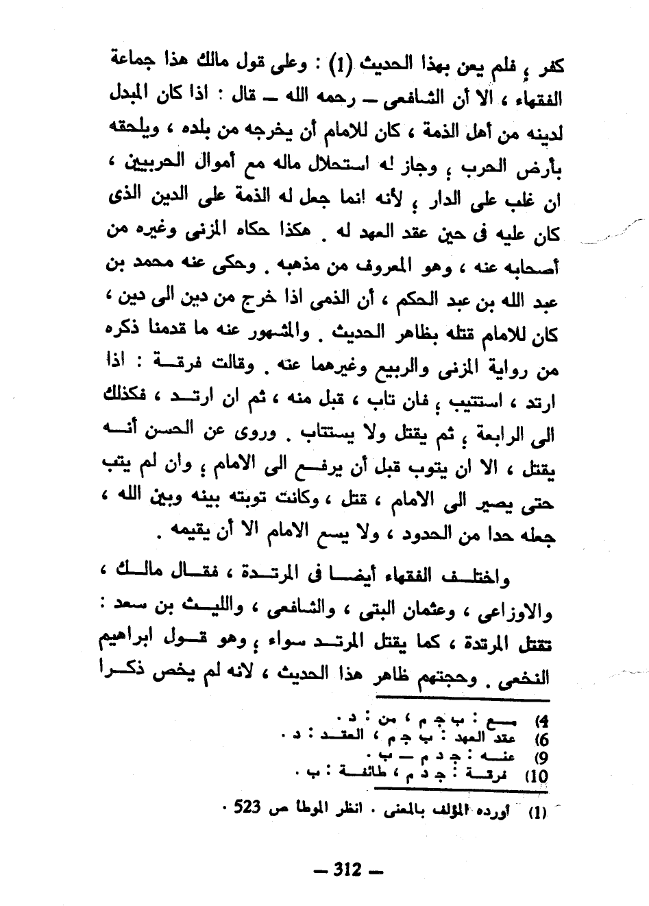 كُفْرٍ فَلَمْ يُعْنَ بِهَذَا الْحَدِيثِ وَعَلَى قَوْلِ مَالِكٍ هَذَا جَمَاعَةُ الْفُقَهَاءِ إِلَّا أَنَّ الشَّافِعِيَّ رَحِمَهُ اللَّهُ قَالَ إِذَا كَانَ الْمُبَدِّلُ لِدِينِهِ مِنْ أَهْلِ الذِّمَّةِ كَانَ لِلْإِمَامِ أَنْ يُخْرِجَهُ مِنْ بَلَدِهِ وَيُلْحِقَهُ بِأَرْضِ الْحَرْبِ وَجَازَ لَهُ اسْتِحْلَالُ مَالِهِ مَعَ أَمْوَالِ الْحَرْبِيِّينَ إِنْ غَلَبَ عَلَى الدَّارِ لِأَنَّهُ إِنَّمَا جَعَلَ لَهُ الذِّمَّةَ عَلَى الدِّينِ الَّذِي كَانَ عَلَيْهِ فِي حِينِ عَقَدَ الْعَهْدَ لَهُ هَكَذَا حَكَاهُ الْمُزَنِيُّ وَغَيْرُهُ مِنْ أَصْحَابِهِ عَنْهُ وَهُوَ الْمَعْرُوفُ مِنْ مَذْهَبِهِ وَحَكَى عَنْهُ مُحَمَّدُ بْنُ عَبْدِ اللَّهِ بْنِ عَبْدِ الْحَكَمِ أَنَّ الذِّمِّيَّ إِذَا خَرَجَ مِنْ دِينٍ إِلَى دِينٍ كَانَ لِلْإِمَامِ قَتْلُهُ بِظَاهِرِ الْحَدِيثِ وَالْمَشْهُورُ عَنْهُ مَا قَدَّمْنَا ذِكْرَهُ مِنْ رِوَايَةِ الْمُزَنِيِّ وَالرَّبِيعِ وَغَيْرِهِمَا عَنْهُ وَقَالَتْ فِرْقَةٌ إِذَا ارْتَدَّ اسْتُتِيبَ فَإِنْ تَابَ قُبِلَ مِنْهُ ثُمَّ إِنِ ارْتَدَّ فَكَذَلِكَ إِلَى الرَّابِعَةِ ثُمَّ يُقْتَلُ وَلَا يُسْتَتَابُ وَرُوِيَ عَنِ الْحَسَنِ أَنَّهُ يُقْتَلُ إِلَّا أَنْ يَتُوبَ قَبْلَ أَنْ يُرْفَعَ إِلَى الْإِمَامِ وَإِنْ لَمْ يَتُبْ حَتَّى يَصِيرَ إِلَى الْإِمَامِ قُتِلَ وَكَانَتْ تَوْبَتُهُ بَيْنَهُ وَبَيْنَ اللَّهِ جَعَلَهُ حَدَّا مِنَ الْحُدُودِ وَلَا يَسَعُ الْإِمَامُ إِلَّا أَنْ يُقِيمَهُ وَاخْتَلَفَ الْفُقَهَاءُ أَيْضًا فِي الْمُرْتَدَّةِ فَقَالَ مَالِكٌ وَالْأَوْزَاعِيُّ وَعُثْمَانُ الْبَتِّيُّ وَالشَّافِعِيُّ وَاللَّيْثُ بْنُ سَعْدٍ تُقْتَلُ الْمُرْتَدَّةُ كَمَا يُقْتَلُ الْمُرْتَدُّ سَوَاءٌ وَهُوَ قَوْلُ إِبْرَاهِيمَ النَّخَعِيِّ وَحُجَّتُهُمْ ظَاهِرُ هَذَا الْحَدِيثِ لِأَنَّهُ لَمْ يَخُصَّ ذكرا
