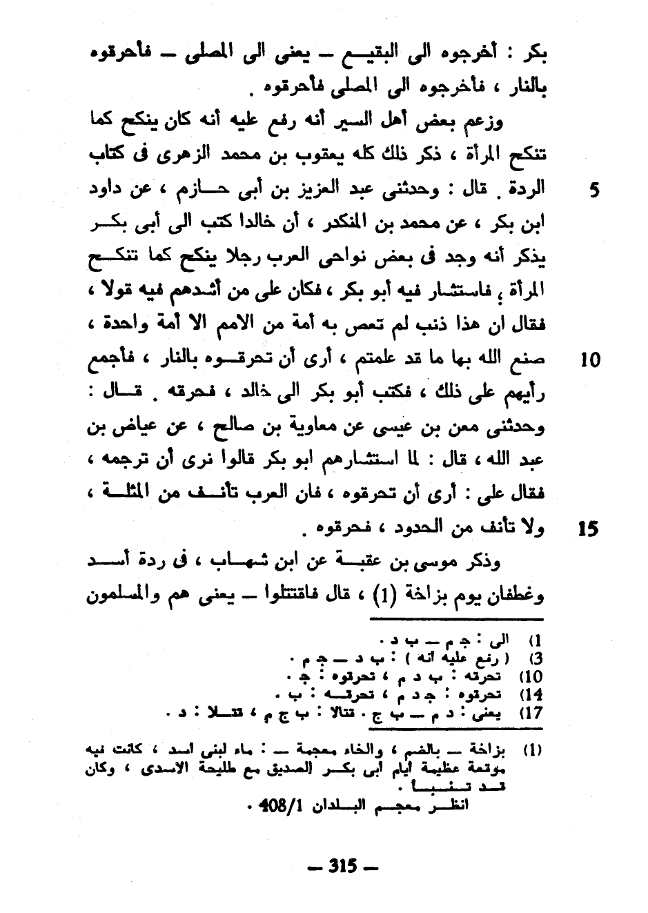 بَكْرٍ أَخْرِجُوهُ إِلَى الْبَقِيعِ يَعْنِي إِلَى الْمُصَلَّى فَأَحْرِقُوهُ بِالنَّارِ فَأَخْرَجُوهُ إِلَى الْمُصَلَّى فَأَحْرَقُوهُ وَزَعَمَ بَعْضُ أَهْلِ السِّيَرِ أَنَّهُ رُفِعَ عَلَيْهِ أَنَّهُ كَانَ يُنْكَحُ كَمَا تُنْكَحُ الْمَرْأَةُ ذَكَرَ ذَلِكَ كُلَّهُ يَعْقُوبُ بْنُ مُحَمَّدٍ الزُّهْرِيُّ فِي كِتَابِ الرِّدَّةِ قَالَ وَحَدَّثَنِي عَبْدُ الْعَزِيزِ بْنُ أَبِي حازم عن داود ابن بَكْرٍ عَنْ مُحَمَّدِ بْنِ الْمُنْكَدِرِ أَنَّ خَالِدًا كَتَبَ إِلَى أَبِي بَكْرٍ يَذْكُرُ أَنَّهُ وَجَدَ فِي بَعْضِ نَوَاحِي الْعَرَبِ رَجُلًا يُنْكَحُ كَمَا تُنْكَحُ الْمَرْأَةُ فَاسْتَشَارَ فِيهِ أَبُو بَكْرٍ فَكَانَ عَلِيٌّ مِنْ أَشَدِّهِمْ فِيهِ قَوْلًا فَقَالَ إِنَّ هَذَا ذَنْبٌ لَمْ تَعْصِ بِهِ أُمَّةٌ مِنَ الْأُمَمِ إِلَّا أُمَّةً وَاحِدَةً صَنَعَ اللَّهُ بِهَا مَا قَدْ عَلِمْتُمْ أَرَى أَنْ تَحْرِقُوهُ بِالنَّارِ فَأَجْمَعَ رَأْيَهُمْ عَلَى ذَلِكَ فَكَتَبَ أَبُو بَكْرٍ إِلَى خَالِدٍ فَحَرَّقَهُ قَالَ وَحَدَّثَنِي مَعْنُ بْنُ عِيسَى عَنْ مُعَاوِيَةَ بْنِ صَالِحٍ عَنْ عِيَاضِ بْنِ عَبْدِ اللَّهِ قَالَ لَمَّا اسْتَشَارَهُمْ أَبُو بَكْرٍ قَالُوا نَرَى أَنْ تَرْجُمَهُ فَقَالَ عَلِيٌّ أَرَى أَنْ تُحَرِّقُوهُ فَإِنَّ الْعَرَبَ تَأْنَفُ مِنَ الْمُثْلَةِ وَلَا تَأْنَفُ مِنَ الْحُدُودِ فَحَرَّقُوهُ وَذَكَرَ مُوسَى بْنُ عُقَبَةَ عَنِ ابْنِ شِهَابٍ فِي رِدَّةِ أَسَدٍ وَغَطْفَانَ يَوْمَ بُزَاخَةَ قَالَ فَاقْتَتَلُوا يَعْنِي هُمْ وَالْمُسْلِمُونَ