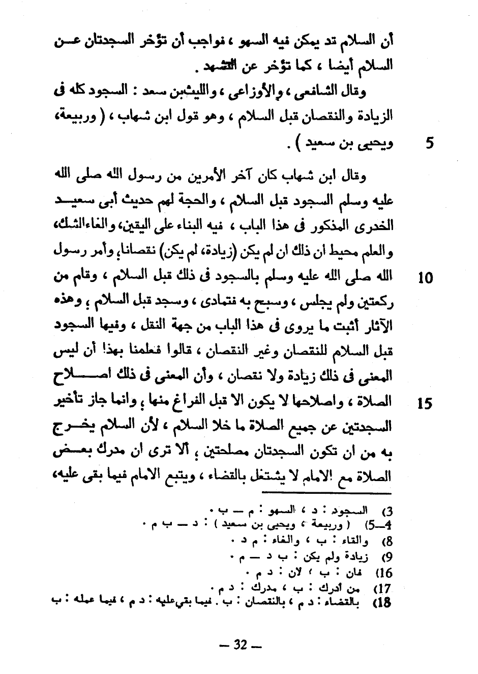 أَنَّ السَّلَامَ قَدْ يُمْكِنُ فِيهِ السَّهْوُ فَوَاجِبٌ أَنْ تُؤَخَّرَ السَّجْدَتَانِ عَنِ السَّلَامِ أَيْضًا كَمَا تُؤَخَّرَ عَنِ التَّشَهُّدِ وَقَالَ الشَّافِعِيُّ وَالْأَوْزَاعِيُّ وَاللَّيْثُ بْنُ سَعْدٍ السُّجُودُ كُلُّهُ فِي الزِّيَادَةِ وَالنُّقْصَانِ قَبْلَ السَّلَامِ وَهُوَ قَوْلُ ابْنِ شِهَابٍ (وَرَبِيعَةَ وَيَحْيَى بْنِ سَعِيدٍ) وَقَالَ ابْنُ شِهَابٍ كَانَ آخِرُ الْأَمْرَيْنِ مِنْ رَسُولِ اللَّهِ صَلَّى اللَّهُ عَلَيْهِ وَسَلَّمَ السُّجُودَ قَبْلَ السَّلَامِ وَالْحُجَّةُ لَهُمْ حَدِيثُ أَبِي سَعِيدٍ الْخُدْرِيِّ الْمَذْكُورُ فِي هَذَا الْبَابِ فِيهِ الْبِنَاءُ عَلَى الْيَقِينِ وَإِلْغَاءُ الشَّكِّ والعلم محيط أن ذاك إِنْ لَمْ يَكُنْ (زِيَادَةٌ لَمْ يَكُنْ) نُقْصَانًا وَأَمَّرَ رَسُولُ اللَّهِ صَلَّى اللَّهُ عَلَيْهِ وَسَلَّمَ بِالسُّجُودِ فِي ذَلِكَ قَبْلَ السَّلَامِ وَقَامَ مِنْ رَكْعَتَيْنِ وَلَمْ يَجْلِسْ وَسَبَّحَ بِهِ فَتَمَادَى وَسَجَدَ قَبْلَ السَّلَامِ وَهَذِهِ الْآثَارُ أَثْبَتُ مَا يُرْوَى فِي هَذَا الْبَابِ مِنْ جِهَةِ النَّقْلِ وَفِيهَا السُّجُودُ قَبْلَ السَّلَامِ لِلنُّقْصَانِ وَغَيْرِ النُّقْصَانِ قَالُوا فَعَلِمْنَا بِهَذَا أَنْ لَيْسَ الْمَعْنَى فِي ذَلِكَ زيادة ولا نقصان وَأَنَّ الْمَعْنَى فِي ذَلِكَ إِصْلَاحُ الصَّلَاةِ وَإِصْلَاحُهَا لَا يَكُونُ إِلَّا قَبْلَ الْفَرَاغِ مِنْهَا وَإِنَّمَا جاز تأخير السجدتين عن جميع الصلاة ماخلا السَّلَامَ لِأَنَّ السَّلَامَ يَخْرُجُ بِهِ مِنْ أَنْ تَكُونَ السَّجْدَتَانِ مُصْلِحَتَيْنِ أَلَا تَرَى أَنَّ مُدْرِكَ بَعْضِ الصَّلَاةِ مَعَ الْإِمَامِ لَا يَشْتَغِلُ بِالْقَضَاءِ ويتبع الإمام فيما بقي عليه