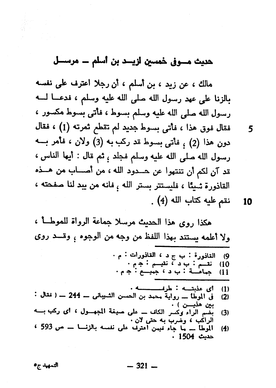 حَدِيثٌ مُوَفَّى خَمْسِينَ لِزَيْدِ بْنِ أَسْلَمَ مُرْسَلٌ مَالِكٌ عَنْ زَيْدِ بْنِ أَسْلَمَ أَنَّ رَجُلًا اعْتَرَفَ عَلَى نَفْسِهِ بِالزِّنَا عَلَى عَهْدِ رَسُولِ اللَّهِ صَلَّى اللَّهُ عَلَيْهِ وَسَلَّمَ فَدَعَا لَهُ رَسُولُ اللَّهِ صَلَّى اللَّهُ عَلَيْهِ وَسَلَّمَ بِسَوْطٍ فَأْتِي بِسَوْطٍ مَكْسُورٍ فَقَالَ فَوْقَ هَذَا فَأُتِي بِسَوْطٍ جَدِيدٍ لَمْ تُقْطَعْ ثَمَرَتُهُ فَقَالَ دُونَ هَذَا فَأْتِي بِسَوْطٍ قَدْ رُكِبَ بِهِ وَلَانَ فَأَمَرَ بِهِ رَسُولُ اللَّهِ صَلَّى اللَّهُ عَلَيْهِ وَسَلَّمَ فَجُلِدَ ثُمَّ قَالَ أَيُّهَا النَّاسُ قَدْ آن لكن أَنْ تَنْتَهُوا عَنْ حُدُودِ اللَّهِ مَنْ أَصَابَ من هذه القاذورة شَيْئًا فَلْيَسْتَتِرْ بِسِتْرِ اللَّهِ فَإِنَّهُ مَنْ يُبْدِ لَنَا صَفْحَتَهُ نُقِمْ عَلَيْهِ كِتَابَ اللَّهِ هَكَذَا رَوَى هَذَا الْحَدِيثَ مُرْسِلًا جَمَاعَةُ الرُّوَاةِ لِلْمُوَطَّأِ وَلَا أَعْلَمُهُ يَسْتَنِدُ بِهَذَا اللَّفْظِ مِنْ وَجْهٍ مِنَ الْوُجُوهِ وَقَدْ رَوَى