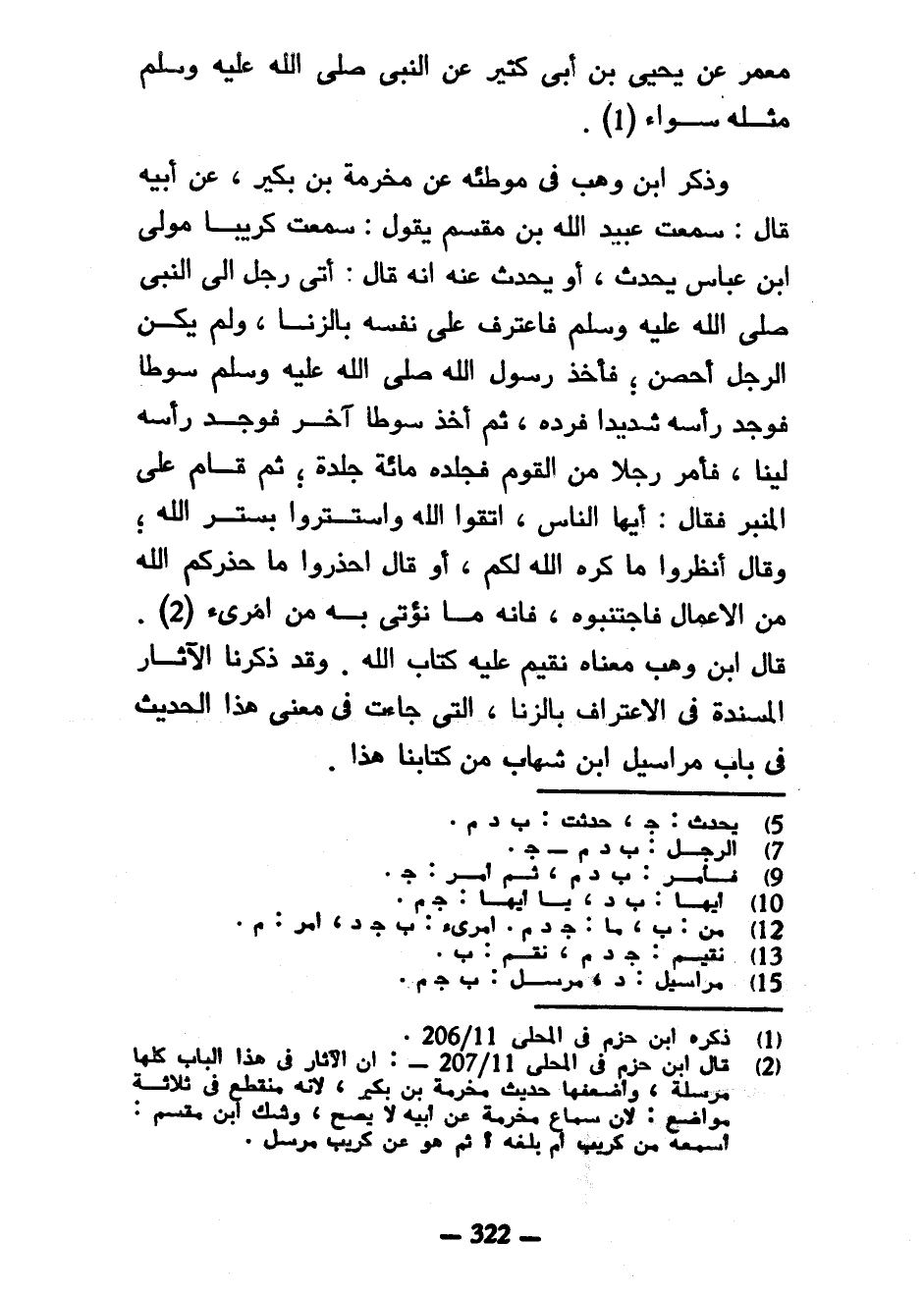مَعْمَرٌ عَنْ يَحْيَى بْنِ أَبِي كَثِيرٍ عَنْ النَّبِيِّ صَلَّى اللَّهُ عَلَيْهِ وَسَلَّمَ مِثْلَهُ سَوَاءٌ وَذَكَرَ ابْنُ وَهْبٍ فِي مُوَّطَئِهِ عَنْ مَخْرَمَةَ بن بكر عَنْ أَبِيهِ قَالَ سَمِعْتُ عُبَيْدَ اللَّهِ بْنَ مِقْسَمٍ يَقُولُ سَمِعْتُ كُرَيْبًا مَوْلَى ابْنِ عَبَّاسٍ يُحَدِّثُ أَوْ يُحَدِّثُ عَنْهُ أَنَّهُ قَالَ أَتَى رَجُلٌ إِلَى النَّبِيِّ صَلَّى اللَّهُ عَلَيْهِ وَسَلَّمَ فَاعْتَرَفَ عَلَى نَفْسِهِ بِالزِّنَا وَلَمْ يَكُنِ الرَّجُلُ أُحْصِنَ فَأَخَذَ رَسُولُ اللَّهِ صَلَّى اللَّهُ عَلَيْهِ وَسَلَّمَ سَوْطًا فَوَجَدَ رَأْسَهُ شَدِيدًا فَرَدَّهُ ثُمَّ أَخَذَ سَوْطًا آخَرَ فَوَجَدَ رَأْسَهُ لَيِّنًا فَأَمَرَ رَجُلًا مِنَ الْقَوْمِ فَجَلَدَهُ مِائَةَ جَلْدَةٍ ثُمَّ قام على المنبر فقال أيهاالناس اتَّقُوا اللَّهَ وَاسْتَتِرُوا بِسِتْرِ اللَّهِ وَقَالَ انْظُرُوا مَا كَرِهَ اللَّهُ لَكُمْ أَوْ قَالَ احْذَرُوا مَا حَذَّرَكُمُ اللَّهُ مِنَ الْأَعْمَالِ فَاجْتَنِبُوهُ فَإِنَّهُ ما نؤتى به من امرىء قَالَ ابْنُ وَهْبٍ مَعْنَاهُ نُقِيمُ عَلَيْهِ كِتَابَ اللَّهِ وَقَدْ ذَكَرْنَا الْآثَارَ الْمُسْنَدَةَ فِي الِاعْتِرَافِ بِالزِّنَا الَّتِي جَاءَتْ فِي مَعْنَى هَذَا الْحَدِيثِ فِي بَابِ مَرَاسِيلِ ابْنِ شِهَابٍ مِنْ كِتَابِنَا هذا