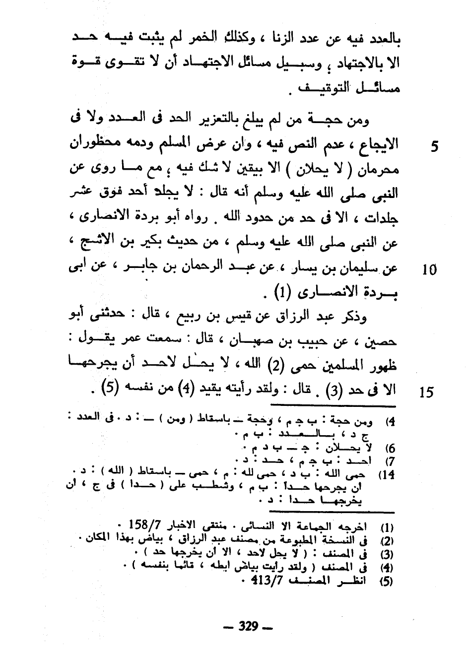 بِالْعَدَدِ فِيهِ عَنْ عَدَدِ الزِّنَا وَكَذَلِكَ الْخَمْرُ لَمْ يَثْبُتْ فِيهِ حَدٌّ إِلَّا بِالِاجْتِهَادِ وَسَبِيلُ مَسَائِلِ الِاجْتِهَادِ أَنْ لَا تَقْوَى قُوَّةَ مَسَائِلِ التَّوْقِيفِ وَمِنْ حُجَّةِ مَنْ لَمْ يَبْلُغْ بِالتَّعْزِيرِ الْحَدَّ فِي الْعَدَدِ وَلَا فِي الْإِيجَاعِ عَدَمُ النَّصِّ فِيهِ وَإِنَّ عِرْضَ الْمُسْلِمِ وَدَمَهُ مَحْظُورَانِ مُحَرَّمَانِ (لَا يَحُلَّانِ) إِلَّا بِيَقِينٍ لَا شَكَّ فِيهِ مَعَ مَا رُوِيَ عَنِ النَّبِيِّ صَلَّى اللَّهُ عَلَيْهِ وَسَلَّمَ أَنَّهُ قَالَ لَا يُجْلَدُ أَحَدٌ فَوْقَ عَشْرِ جَلْدَاتٍ إِلَّا فِي حَدٍّ مِنْ حُدُودِ اللَّهِ رَوَاهُ أَبُو بُرْدَةَ الْأَنْصَارِيُّ عَنِ النَّبِيِّ صَلَّى اللَّهُ عَلَيْهِ وَسَلَّمَ من حديث بُكَيْرُ بْنِ الْأَشَجِّ عَنْ سُلَيْمَانَ بْنِ يَسَارٍ عَنْ عَبْدِ الرَّحْمَنِ بْنِ جَابِرٍ عَنْ أَبِي بُرْدَةَ الْأَنْصَارِيِّ وَذَكَرَ عَبْدُ الرَّزَّاقِ عَنْ قَيْسِ بْنِ رَبِيعٍ قَالَ حَدَّثَنِي أَبُو حُصَيْنٍ عَنْ حَبِيبِ بْنِ صَهْبَانَ قَالَ سَمِعْتُ عُمَرَ يَقُولُ ظُهُورُ الْمُسْلِمِينَ حِمَى اللَّهِ لَا يَحِلُّ لِأَحَدٍ أَنْ يَجْرَحَهَا إِلَّا فِي حَدٍّ قَالَ وَلَقَدْ رَأَيْتُهُ يُقَيِّدُ مِنْ نفسه