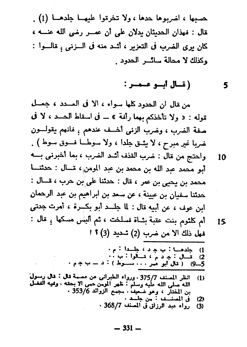 حَسَبَهَا اضْرِبُوهَا حَدَّهَا وَلَا تَخْرِقُوا عَلَيْهَا جِلْدَهَا قَالَ فَهَذَانِ الْحَدِيثَانِ يَدُلَّانِ عَلَى أَنَّ عُمَرَ رَضِيَ اللَّهُ عَنْهُ كَانَ يَرَى الضَّرْبَ فِي التعزير أشد منه في الزنى قَالُوا وَكَذَلِكَ لَا مَحَالَةَ سَائِرُ الْحُدُودِ قَالَ أَبُو عُمَرَ مَنْ قَالَ إِنَّ الْحُدُودَ كُلَّهَا سَوَاءٌ إِلَّا فِي الْعَدَدِ جَعَلَ قَوْلَهُ ((وَلَا تَأْخُذْكُمْ بِهِمَا رَأْفَةٌ)) فِي إِسْقَاطِ الْحَدِّ لَا في صفة الضرب وضرب الزنى أَخَفُّ عِنْدَهُمْ فَإِنَّهُمْ يَقُولُونَ ضَرْبًا غَيْرَ مُبَرِّحٍ لَا يَشُقُّ جِلْدًا وَلَا سَوْطًا فَوْقَ سَوْطٍ) وَاحْتَجَّ مَنْ قَالَ ضَرْبُ الْقَذْفِ أَشَدُّ الضَّرْبِ بِمَا أَخْبَرَنِي بِهِ أَبُو مُحَمَّدٍ عَبْدُ اللَّهِ بْنُ مُحَمَّدِ بْنِ عَبْدِ الْمُؤْمِنِ قَالَ حَدَّثَنَا مُحَمَّدُ بْنُ يَحْيَى بْنِ عُمَرَ قَالَ حَدَّثَنَا عَلِيُّ بْنُ حَرْبٍ قَالَ حَدَّثَنَا سُفْيَانُ بْنُ عُيَيْنَةَ عَنْ سَعْدِ بْنِ إِبْرَاهِيمَ بْنِ عَبْدِ الرَّحْمَنِ بْنِ عَوْفٍ عَنْ أَبِيهِ قَالَ لَمَّا جُلِدَ أَبُو بَكْرَةَ أَمَرَتْ جَدَّتِي أُمُّ كُلْثُومٍ بِنْتُ عُقْبَةَ بِشَاةٍ فَسُلِخَتْ ثُمَّ أُلْبِسَ مِسْكَهَا قَالَ فَهَلْ ذَلِكَ إِلَّا مِنْ ضَرْبٍ شَدِيدٍ