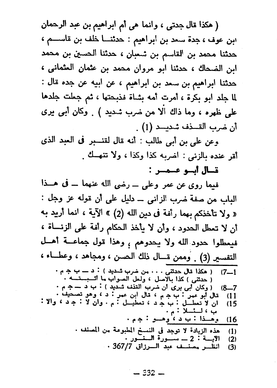 هكذا قال جَدَّتِي وَإِنَّمَا هِيَ أُمُّ إِبْرَاهِيمَ بْنِ عَبْدِ الرَّحْمَنِ بْنِ عَوْفٍ جَدَّةُ سَعْدِ بْنِ إِبْرَاهِيمَ حَدَّثَنَا خَلَفُ بْنُ قَاسِمٍ حَدَّثَنَا مُحَمَّدُ بْنُ الْقَاسِمِ بْنِ شَعْبَانَ حَدَّثَنَا الْحُسَيْنُ بْنُ مُحَمَّدِ بْنِ الضَّحَّاكِ حَدَّثَنَا أَبُو مَرْوَانَ مُحَمَّدُ بْنُ عُثْمَانَ الْعُثْمَانِيُّ حَدَّثَنَا إِبْرَاهِيمُ بْنُ سَعْدِ بْنِ إِبْرَاهِيمَ عَنِ أَبِيهِ عَنْ جَدِّهِ قَالَ لَمَّا جُلِدَ أَبُو بَكْرَةَ أَمَرَتْ أُمُّهُ بِشَاةٍ فَذَبَحَتْهَا ثُمَّ جَعَلَتْ جِلْدَهَا عَلَى ظَهْرِهِ وَمَا ذَاكَ إِلَّا مِنْ ضَرْبٍ شَدِيدٍ) وَكَانَ أَبِي يَرَى أَنَّ ضَرْبَ الْقَذْفِ شَدِيدٌ وَعَنْ عَلِيِّ بْنِ أَبِي طَالِبٍ أَنَّهُ قَالَ لِقَنْبَرٍ فِي الْعَبْدِ الذي أقر عنده بالزنى اضْرِبْهُ كَذَا وَكَذَا وَلَا تُنْهِكْ قَالَ أَبُو عُمَرَ فِيمَا رُوِيَ عَنْ عُمَرَ وَعَلِيٍّ رَضِيَ اللَّهُ عَنْهُمَا فِي هَذَا الْبَابِ مِنْ صِفَةِ ضَرْبِ الزَّانِي دَلِيلٌ عَلَى أَنَّ قَوْلَهُ عَزَّ وَجَلَّ وَلَا تَأْخُذْكُمْ بِهِمَا رَأْفَةٌ فِي دِينِ اللَّهِ الْآيَةَ إِنَّمَا أُرِيدَ بِهِ أَنْ لَا تُعَطَّلَ الْحُدُودُ وَأَنْ لَا يَأْخُذَ الْحُكَّامَ رَأْفَةٌ عَلَى الزُّنَاةِ فَيُعَطِّلُوا حُدُودَ اللَّهِ وَلَا يَحُدُّوهُمْ وَهَذَا قَوْلُ جَمَاعَةِ أَهْلِ التَّفْسِيرِ وَمِمَّنْ قَالَ ذَلِكَ الْحَسَنُ وَمُجَاهِدٌ وَعَطَاءٌ