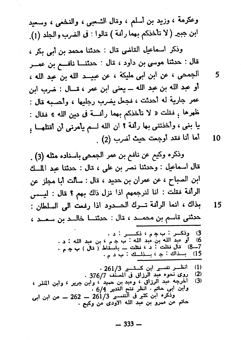 وَعِكْرِمَةُ وَزَيْدُ بْنُ أَسْلَمَ وَقَالَ الشَّعْبِيُّ وَالنَّخَعِيُّ وسعيد بن جبير (لا تَأْخُذْكُمْ بِهِمَا رَأْفَةٌ) قَالُوا فِي الضَّرْبِ وَالْجِلْدِ وَذَكَرَ إِسْمَاعِيلُ الْقَاضِي قَالَ حَدَّثَنَا مُحَمَّدُ بْنُ أَبِي بَكْرٍ قَالَ حَدَّثَنَا مُوسَى بْنُ دَاوُدَ قَالَ حَدَّثَنَا نَافِعُ بْنُ عُمَرَ الْجُمَحِيُّ عَنِ ابْنِ أَبِي مُلَيْكَةَ عَنْ عُبَيْدِ اللَّهِ بْنِ عَبْدِ اللَّهِ أَوْ عَبْدِ اللَّهِ بْنِ عَبْدِ اللَّهِ يَعْنِي ابْنَ عُمَرَ قَالَ ضَرَبَ ابْنُ عُمَرَ جَارِيَةً لَهُ أَحْدَثَتْ فَجَعَلَ يَضْرِبُ رِجْلَيْهَا وأحسبه قال ظهرها فقلت ((لا تَأْخُذْكُمْ بِهِمَا رَأْفَةٌ فِي دِينِ اللَّهِ)) فَقَالَ يَا بُنَيَّ وَأَخَذَتْنِي بِهَا رَأْفَةٌ إِنَّ اللَّهَ لَمْ يَأْمُرْنِي أَنْ أَقْتُلَهَا أَمَّا أَنَا فَقَدْ أَوْجَعْتُ حَيْثُ أَضْرِبُ وَذَكَرَهُ وَكِيعٌ عَنْ نَافِعِ بْنِ عُمَرَ الْجُمَحِيِّ بِإِسْنَادِهِ مِثْلَهُ قَالَ إِسْمَاعِيلُ وَحَدَّثَنَا نَصْرُ بْنُ عَلِيٍّ قَالَ حَدَّثَنَا عَبْدُ الْمَلِكِ بْنُ الصَّبَّاحِ عَنْ عِمْرَانَ بْنِ حَدِيدٍ قَالَ سَأَلْتُ أَبَا مِجْلَزٍ عَنِ الرَّأْفَةِ فَقُلْتُ إِنَّا لَنَرْجُمُهُمْ إِذَا نَزَلَ ذَلِكَ بِهِمْ قَالَ لَيْسَ بِذَاكَ إِنَّمَا الرَّأْفَةُ تَرْكُ الْحُدُودِ إِذَا رُفِعَتْ إِلَى السُّلْطَانِ حَدَّثَنِي قَاسِمُ بْنُ مُحَمَّدٍ قَالَ حَدَّثَنَا خَالِدُ بْنُ سَعْدٍ