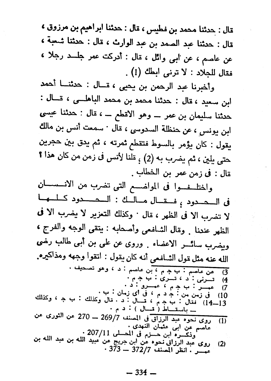 قَالَ حَدَّثَنَا مُحَمَّدُ بْنُ فُطَيْسٍ قَالَ حَدَّثَنَا إِبْرَاهِيمُ بْنُ مَرْزُوقٍ قَالَ حَدَّثَنَا عَبْدُ الصَّمَدِ بْنُ عَبْدِ الْوَارِثِ قَالَ حَدَّثَنَا شُعْبَةُ عَنْ عَاصِمٍ عَنْ أَبِي وَائِلٍ قَالَ أَدْرَكْتُ عُمَرَ جَلَدَ رَجُلًا فَقَالَ لِلْجَلَّادِ لَا تُرِنِي إِبِطَكَ وَأَخْبَرَنَا عَبْدُ الرَّحْمَنِ بْنُ يَحْيَى قَالَ حَدَّثَنَا أَحْمَدُ بْنُ سَعِيدٍ قَالَ حَدَّثَنَا مُحَمَّدُ بْنُ مُحَمَّدٍ الْبَاهِلِيُّ قَالَ حَدَّثَنَا سُلَيْمَانُ بْنُ عُمَرَ وَهُوَ الْأَقْطَعُ قَالَ حَدَّثَنَا عِيسَى بْنُ يُونُسَ عَنْ حَنْظَلَةَ السَّدُوسِيِّ قَالَ سَمِعْتُ أَنَسَ بْنَ مَالِكٍ يَقُولُ كَانَ يُؤْمَرُ بِالسَّوْطِ فَتُقْطَعُ ثَمَرَتُهُ ثُمَّ يُدَقُّ بَيْنَ حَجَرَيْنِ حَتَّى يَلِينَ ثُمَّ يُضْرَبُ بِهِ قُلْنَا لِأَنَسٍ فِي زَمَنِ مَنْ كَانَ هَذَا قَالَ فِي زَمَنِ عُمَرَ بْنِ الْخَطَّابِ وَاخْتَلَفُوا فِي الْمَوَاضِعِ الَّتِي تُضْرَبُ مِنَ الْإِنْسَانِ فِي الْحُدُودِ فَقَالَ مَالِكٌ الْحُدُودُ كُلُّهَا لَا تُضْرَبُ إِلَّا فِي الظَّهْرِ قَالَ وَكَذَلِكَ التَّعْزِيرُ لَا يُضْرَبُ إِلَّا فِي الظَّهْرِ عِنْدَنَا وَقَالَ الشَّافِعِيُّ وَأَصْحَابُهُ يُتَّقَى الْوَجْهُ وَالْفَرْجُ وَيُضْرَبُ سَائِرُ الْأَعْضَاءِ وَرُوِيَ عَنْ عَلِيِّ بْنِ أَبِي طَالِبٍ رَضِيَ اللَّهُ عَنْهُ مِثْلَ قَوْلِ الشَّافِعِيِّ أَنَّهُ كَانَ يَقُولُ اتَّقُوا وَجْهَهُ وَمَذَاكِيرَهُ