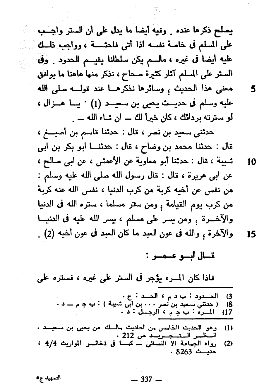 يَصْلُحُ ذِكْرُهَا عِنْدَهُ وَفِيهِ أَيْضًا مَا يَدُلُّ عَلَى أَنَّ السَّتْرَ وَاجِبٌ عَلَى الْمُسْلِمِ فِي خَاصَّةِ نَفْسِهِ إِذَا أَتَى فَاحِشَةً وَوَاجِبٌ ذَلِكَ عَلَيْهِ أَيْضًا فِي غَيْرِهِ مَا لَمْ يَكُنْ سُلْطَانًا يُقِيمُ الْحُدُودَ وَفِي السَّتْرِ عَلَى الْمُسْلِمِ آثار كثيرة صحاح نذكر منها هاهنا مَا يُوَافِقُ مَعْنَى هَذَا الْحَدِيثِ وَسَائِرُهَا نَذْكُرُهَا عِنْدَ قَوْلِهِ صَلَّى اللَّهُ عَلَيْهِ وَسَلَّمَ فِي حَدِيثِ يَحْيَى بْنِ سَعِيدٍ يَا هَزَّالُ لَوْ سَتَرْتَهُ بِرِدَائِكَ كَانَ خَيْرًا لَكَ إِنْ شَاءَ اللَّهُ حَدَّثَنِي سَعِيدُ بْنُ نَصْرٍ قَالَ حَدَّثَنَا قَاسِمُ بْنُ أَصْبَغَ قَالَ حَدَّثَنَا مُحَمَّدُ بْنُ وَضَّاحٍ قَالَ حَدَّثَنَا أَبُو بَكْرِ بْنُ أَبِي شَيْبَةَ قَالَ حَدَّثَنَا أَبُو مُعَاوِيَةَ عَنِ الْأَعْمَشِ عَنْ أَبِي صَالِحٍ عَنْ أَبِي هُرَيْرَةَ قَالَ قَالَ رَسُولُ اللَّهِ صَلَّى اللَّهُ عَلَيْهِ وَسَلَّمَ مَنْ نَفَّسَ عَنْ أَخِيهِ كُرْبَةً مِنْ كُرَبِ الدُّنْيَا نَفَّسَ اللَّهُ عَنْهُ كُرْبَةً مِنْ كُرَبِ يَوْمِ الْقِيَامَةِ وَمَنْ سَتَرَ مُسْلِمًا سَتَرَهُ اللَّهُ فِي الدُّنْيَا وَالْآخِرَةِ وَمِنْ يَسَّرَ عَلَى مُسْلِمٍ يَسَّرَ اللَّهُ عَلَيْهِ فِي الدُّنْيَا وَالْآخِرَةِ وَاللَّهُ فِي عَوْنِ الْعَبْدِ مَا كَانَ الْعَبْدُ فِي عَوْنِ أَخِيهِ قَالَ أَبُو عُمَرَ فَإِذَا كَانَ الْمَرْءُ يُؤْجَرُ فِي السَّتْرِ عَلَى غَيْرِهِ فَسَتْرُهُ على